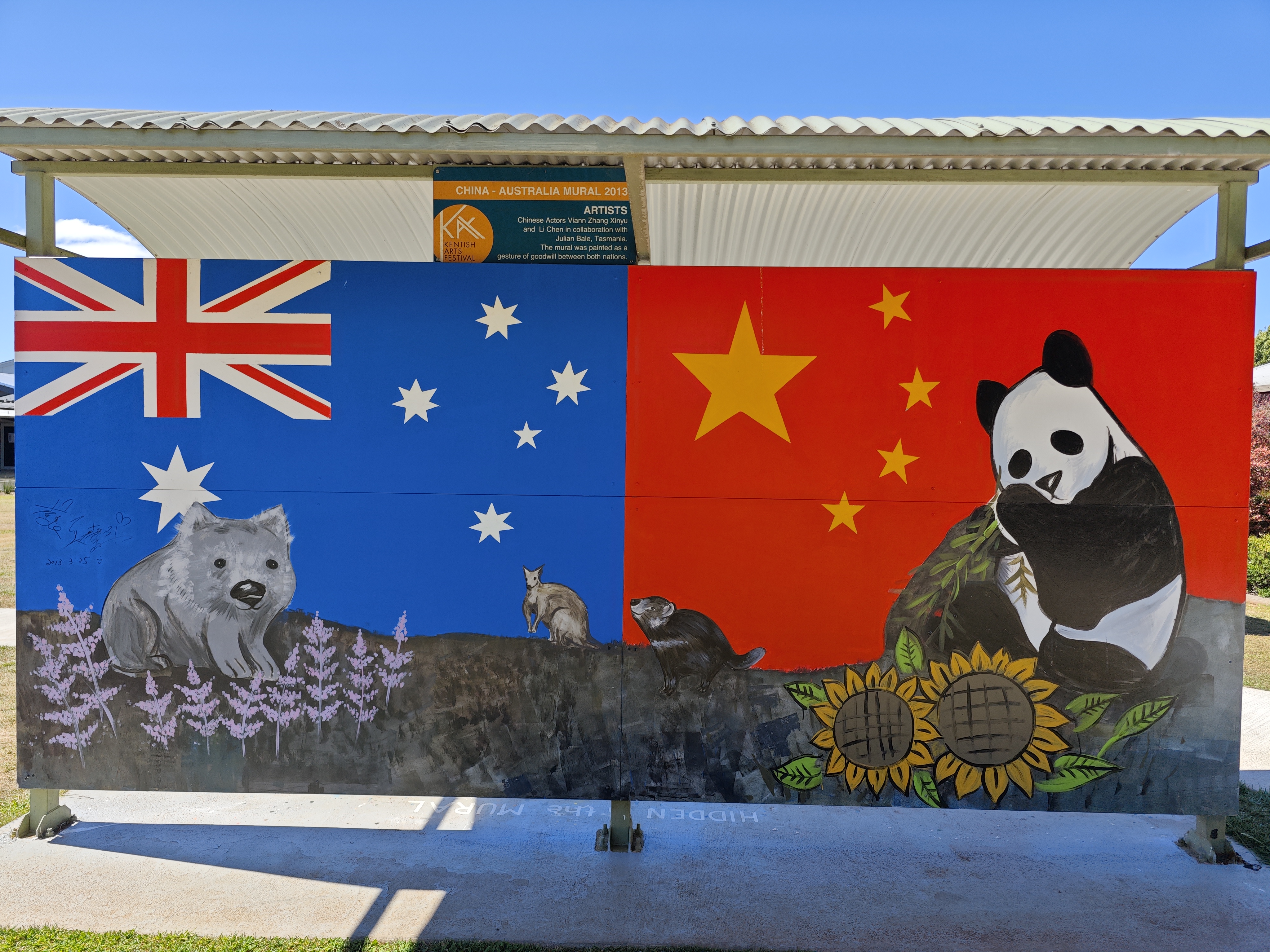下午2点40分,我们来到了设菲尔德(Sheffield,著名的壁画镇,88KM, 1:04)。这是一座“无中生有”的壁画镇。小镇在游客赴世界自然遗产摇篮山-圣克莱尔湖国家公园(Cradle Mtn Lake & St Clair Ntl Park, 54KM, 0:47)的必经之路上,游客原先一般仅在此加加油、放放松。如何增加过客在小镇的停留时间,是攸关小镇经济活力的大事。1986年,几位乡贤从一座加拿大类似小镇的崛起(茜美纳斯, Chemainus, 位于温哥华岛)想到了壁画这一妙招。三十多年下来,通过“请进来”、举办竞赛等方式,小镇已成为全球知名的壁画城,目前有超过100幅的户外壁画。饶是我这样艺术细胞缺乏的,也颇有兴趣地欣赏了90分钟壁画,还坐下来吃了冰激凌。有一幅创作于2013年3月25日,颂扬中澳友好的壁画,两位主画者来自中国,名叫李晨和张磬予,名字很熟悉。不知现在两位还记得南半球一个小镇上有这么一幅当年合作绘制的壁画。