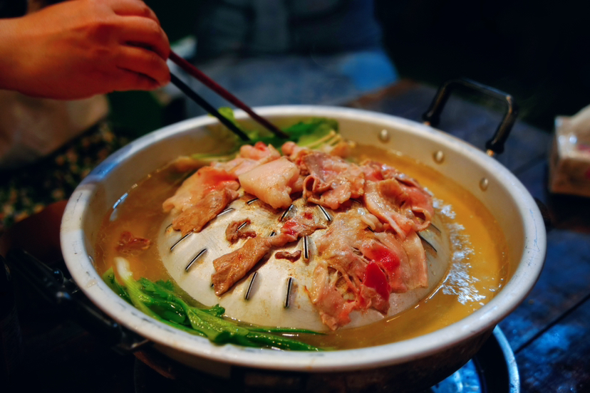 欣赏完日落晚霞后最快乐的事情便是和伙伴们下山去古城里觅食,选了一家在湄公河畔的老挝特色小火锅,兜兜转转了一大圈,好不容易才锁定到它的位置,结果又因为人气过于火爆,等了好久才陆陆续续上炭、上锅、上菜,早已饥肠辘辘的我们如同饿虎扑食般分享着美食,可能是因为我们习惯了快节奏的生活方式,又有可能是老挝人动作过于缓慢,等待的过程中略显焦躁,不过接纳旅行中的不完美不也是旅行中的乐趣,不是吗?
