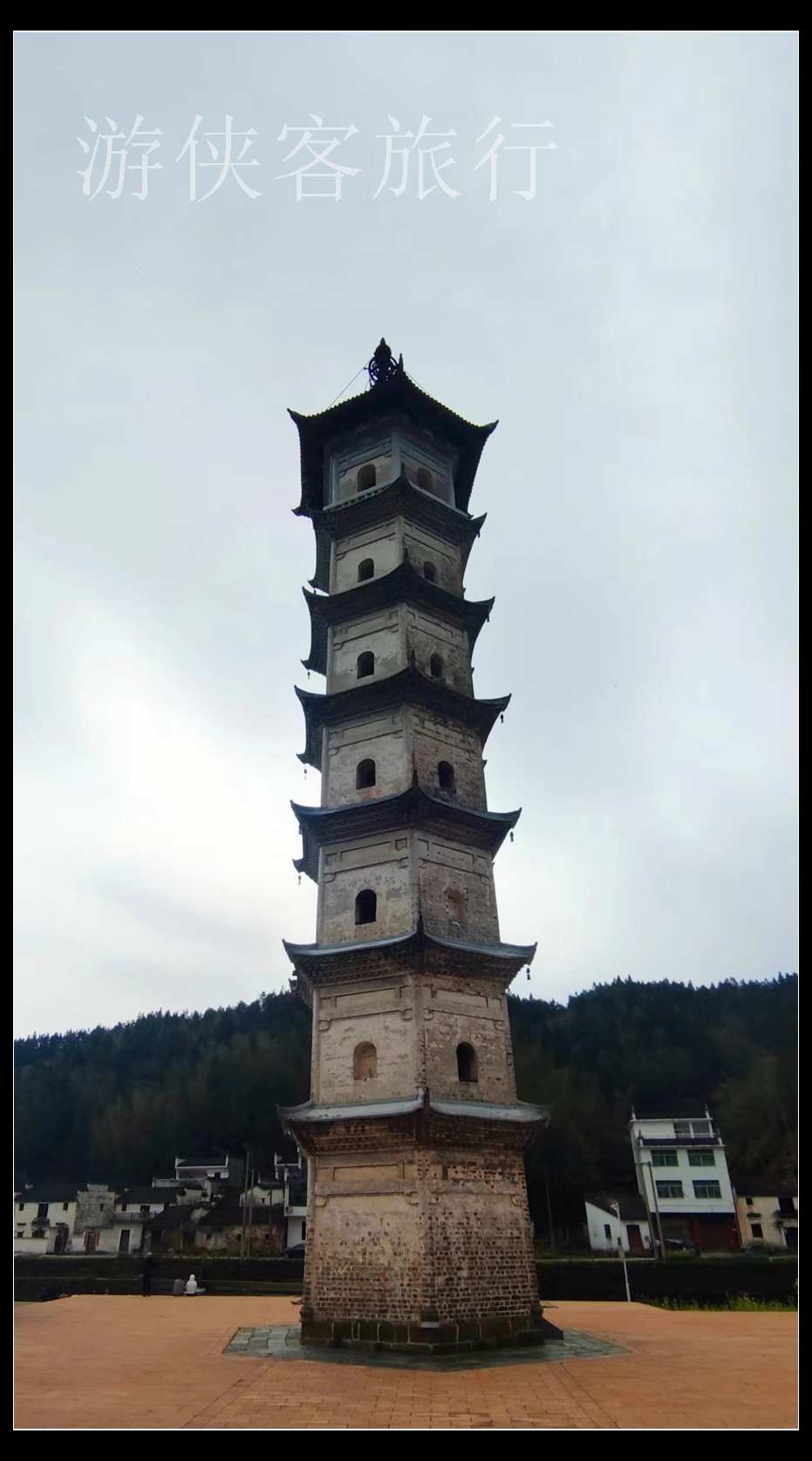 建于明万历年间的龙天宝塔,耸立在婺源县北,凤山村头的浙溪之畔。相传建塔前凤山村多火灾,村人遂建此塔以镇火神,并取名龙天,与凤山村名对称,有龙凤呈祥之意。龙天塔高30余米,为砖石结构,六面七层,腰檐层层凸出,宽度向上递减,每层檐角悬吊铁风铃,每当风起,铃声铮铮悦耳。塔内有阶梯上升,可直登顶层远眺。 该塔临溪而建,丽日朗月之时,塔影倒立水中,景色十分壮观。