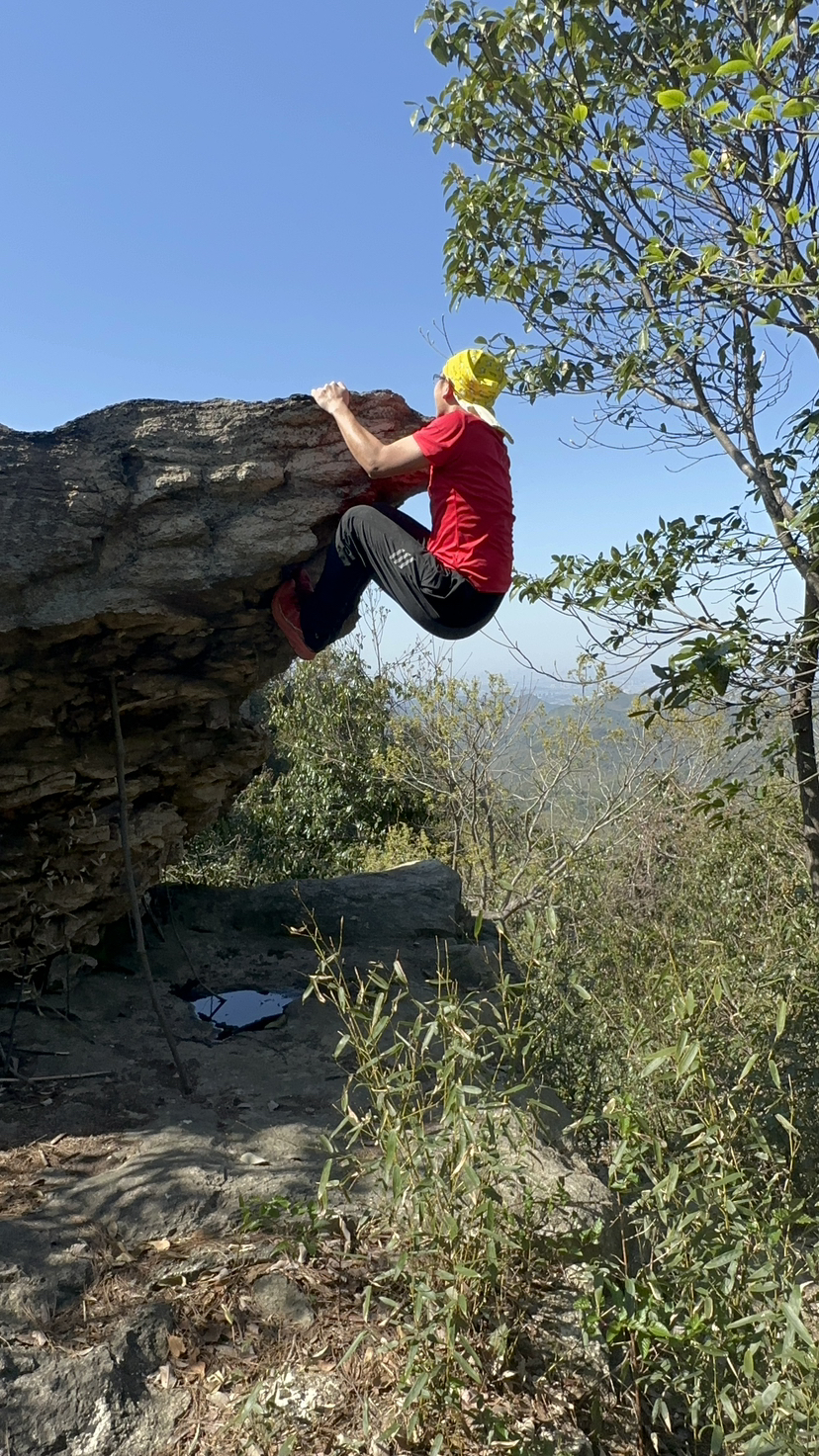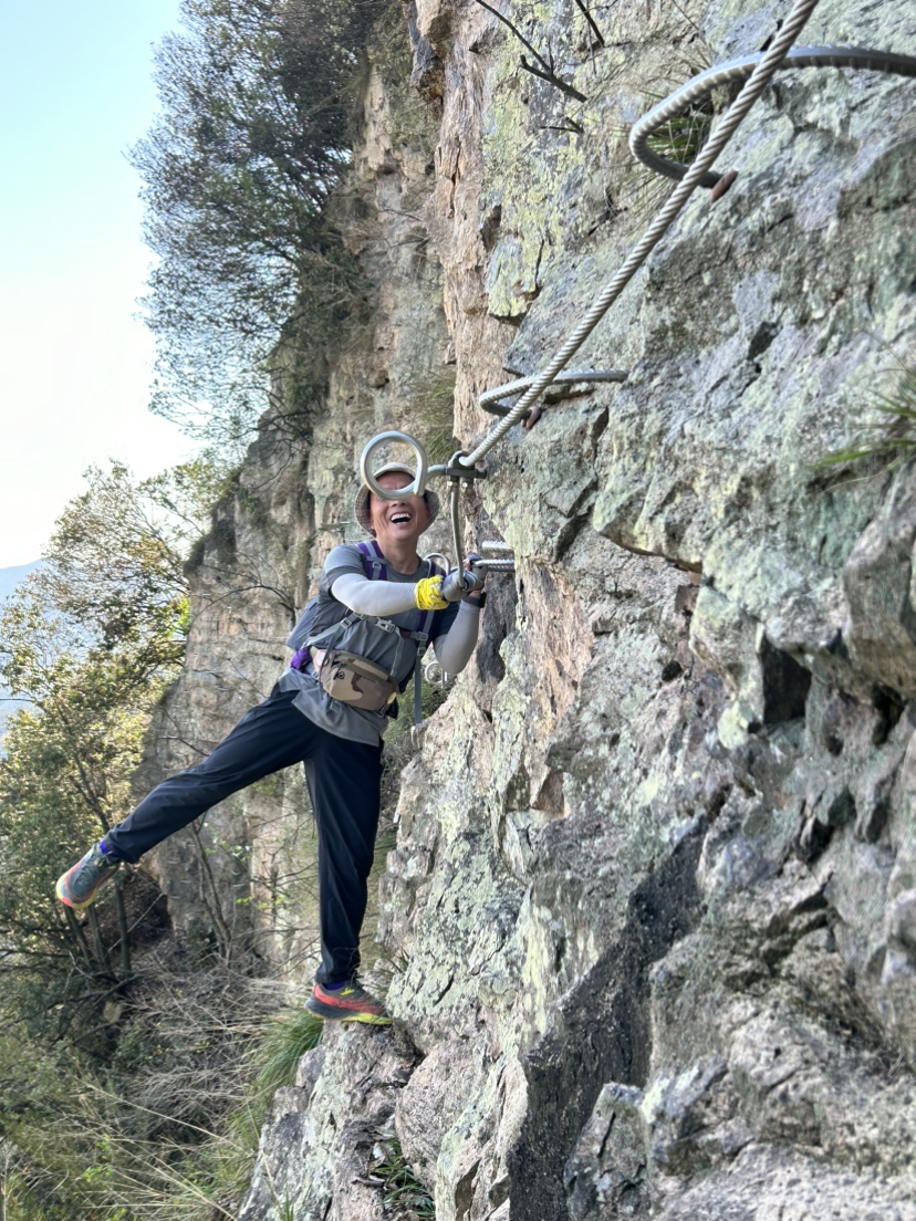 一凡、东陵流水、八日晴3位领队带大家做简单热身运动后,大部队沿着蜿蜒的竹林山径,向着山脊线进发。经过400米的爬升,很快来到第一景-皂靴岩,这块巨岩形似倒立着的贵妃靴,因传说中吴越王钱镠的故事而得名,平添了几分神秘色彩。我们站在岩石跟前,被这挺拔的巨石所吸引,它如同一只鞋底朝天的靴子,静静地矗立在山顶上。据说,这是钱镠王的两只皂靴变成的巨岩,一只留在了单家甸山顶上,另一只则留在了诸暨和东阳交界的山上,即此处。在此停歇休整时,大家纷纷上前抱紧这只靴子,喜笑颜开,拍照打卡。继续缓坡向上前行,一路繁花似锦,鸟鸣山幽。终于登临山巅,天高云淡,视野开阔,近瞰山谷,阡陌纵横,屋舍俨然;极目远眺,层峦叠嶂,云雾缭绕,山鹰翱翔,仿佛一幅动态的山水画。稍事休息,继续翻越起伏的山脊,不久便来到刻石山,据记载公元前210年,秦始皇东巡会稽,祭祀大禹,命丞相李斯撰文刻石,故名刻石山。摩崖石刻、秦皇小篆石碑等历史人文遗迹依次呈现在我们眼前,我们细细端详这些古老的石刻,感受历史的厚重与文化的熏陶。