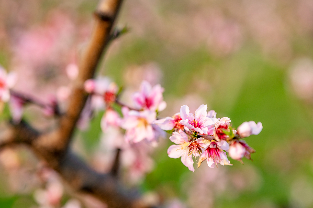 凤溪湾的桃花林中,一朵朵、一簇簇的花儿争奇斗艳,宛如粉色的云朵悬挂在枝头,随风轻轻摇曳,散发着淡淡的香气。