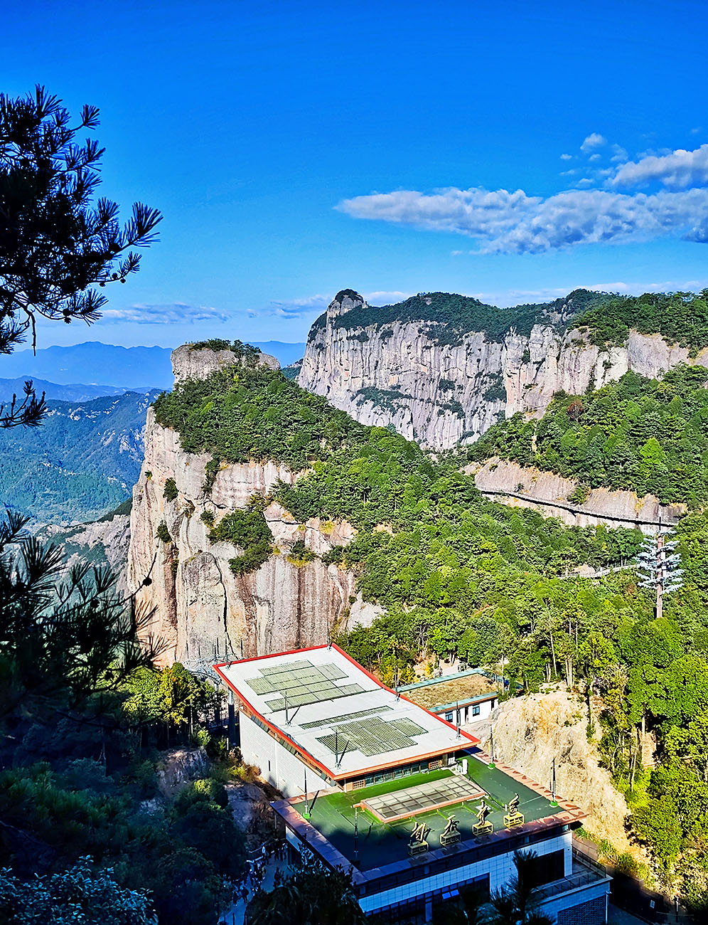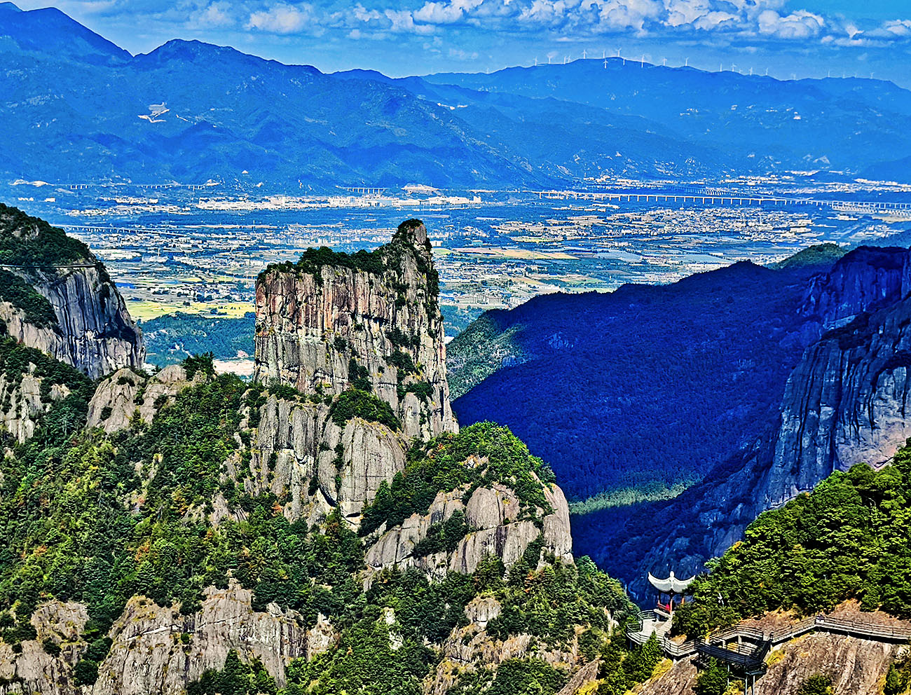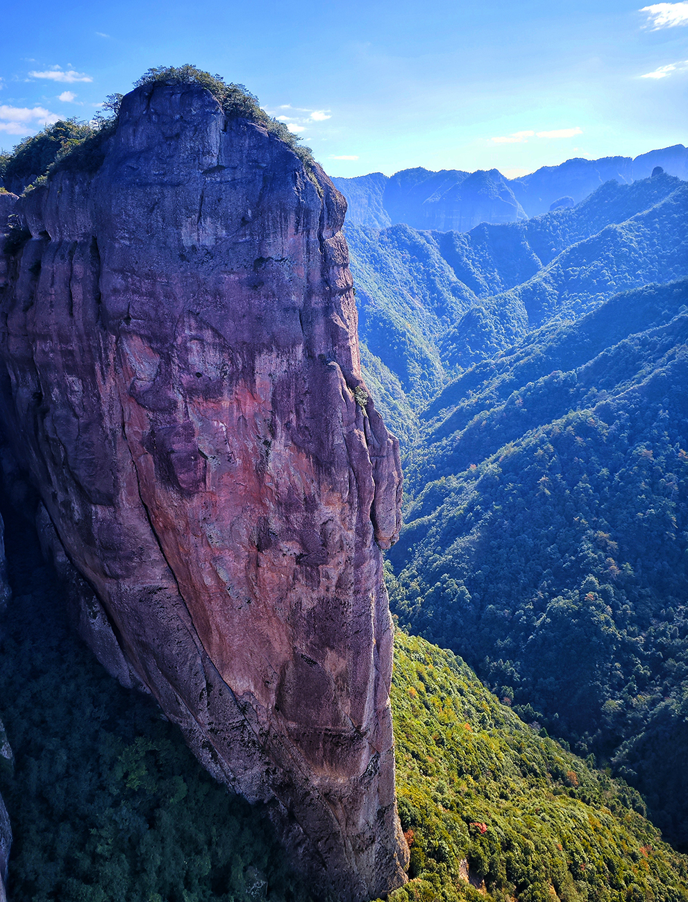 我们行进到南天顶下面,眼前出现一个深谷,其悬崖峭壁之上有神 仙居 的另一网红打卡点“莲花玻璃台”