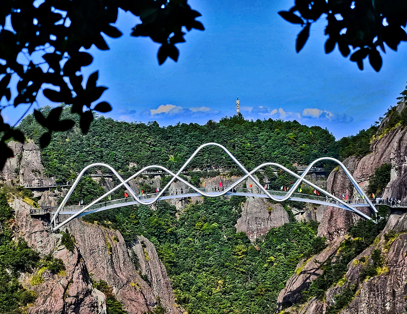 波浪型的桥身优雅动感,下面就是万丈深渊,好在这座桥的桥面不是玻璃的,钢筋水泥联结着大自然山峰的两侧,在高山林立的神 仙居 中,还有这么壮观的天桥,一边走一边好奇这些桥是怎么建造起来的?
