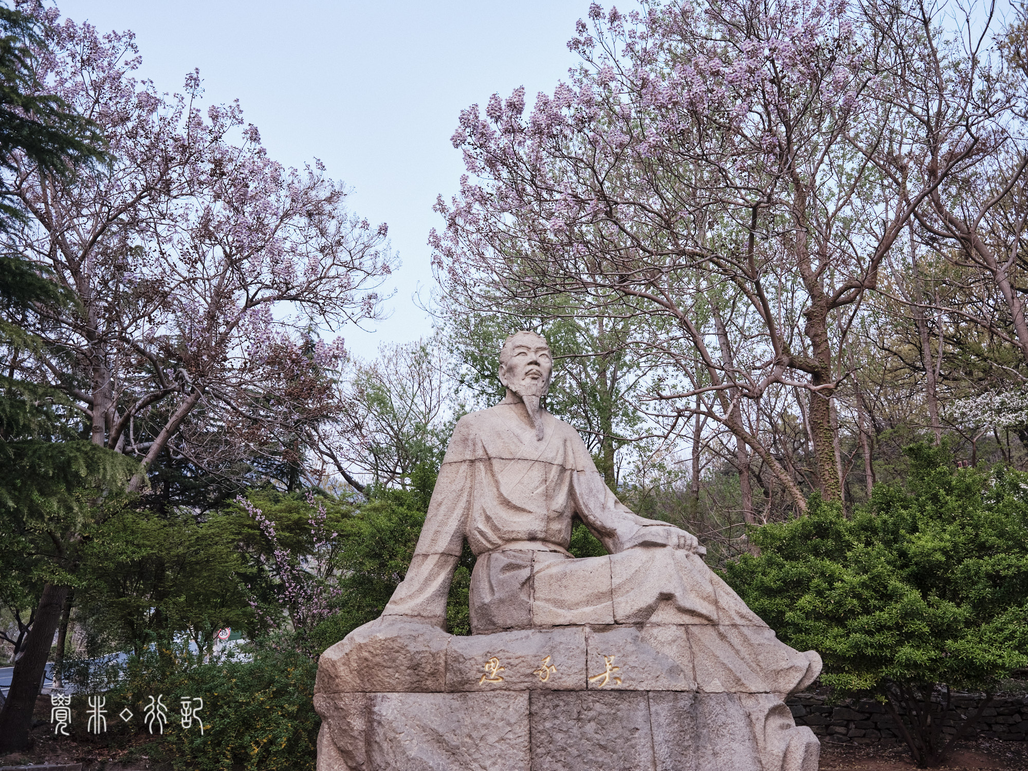 沿着三元宫再往下,经过九龙桥,慢慢往山门的方向前行,夕阳中,山花正艳,而山门边的吴承恩雕像,正日夜守护着这片给予他无限灵感的土地。