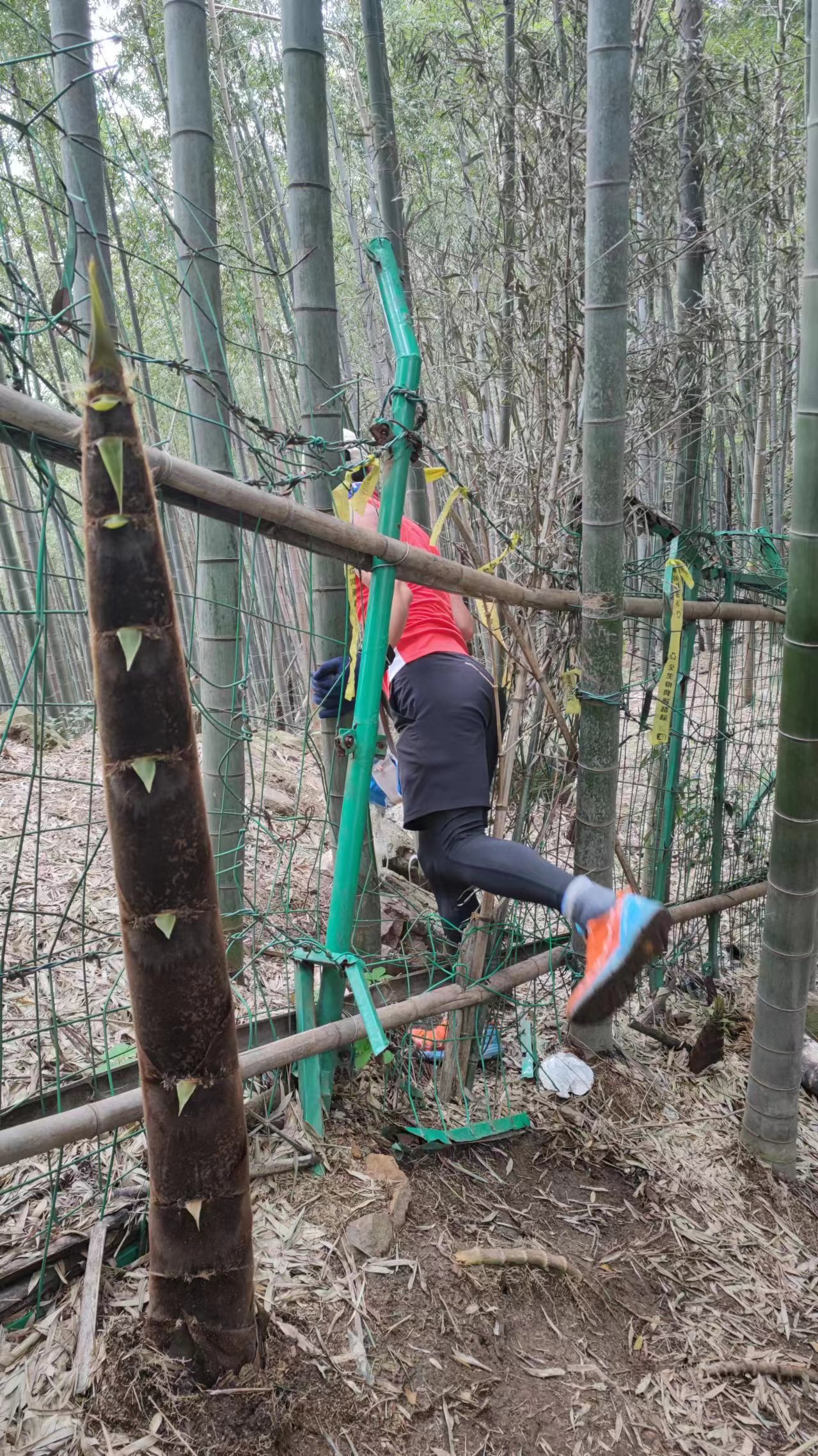 紧接着我们从公路前面的路口向锅底山方向出发了。爬了一路的土坡和竹林,看到了好多竹笋,到了四岔路口,这里右拐上山可以走锅底山小环线,因为是尾队,所以时间来不及了,原地等刚才上去走小环线的前队,前队下来后我就做中队了,走小环线的中队下来后改做尾队。中间经过一段石壁到了山顶,然后就可以下山回到终点啦。这一段下坡路难度还行,慢慢走就能到了。