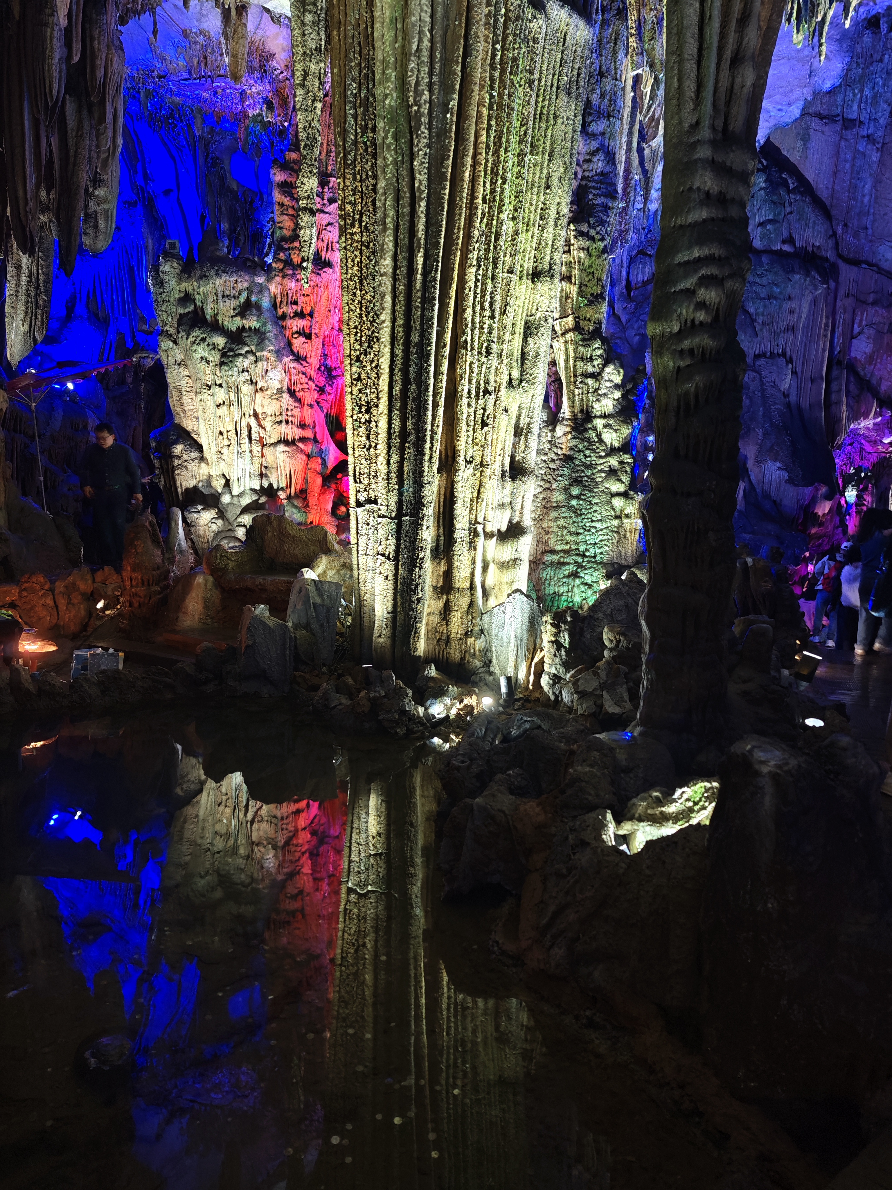灵泉洞以其壮观的石钟乳和石笋而闻名,先乘船游览洞内奇景。这些由碳酸钙沉积形成的岩石形态各异,有的似瀑布,有的似宝塔,给人以极大的视觉震撼。