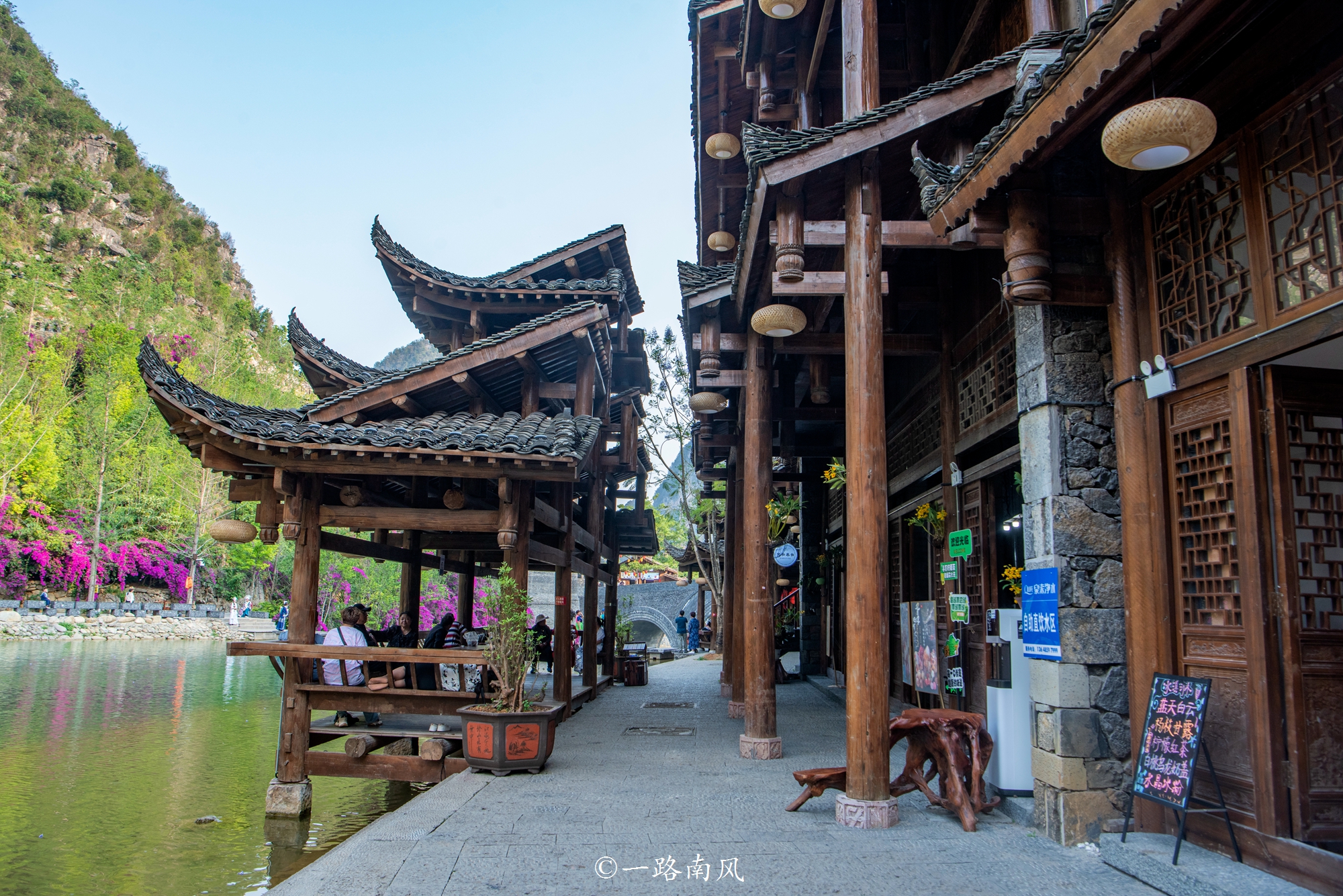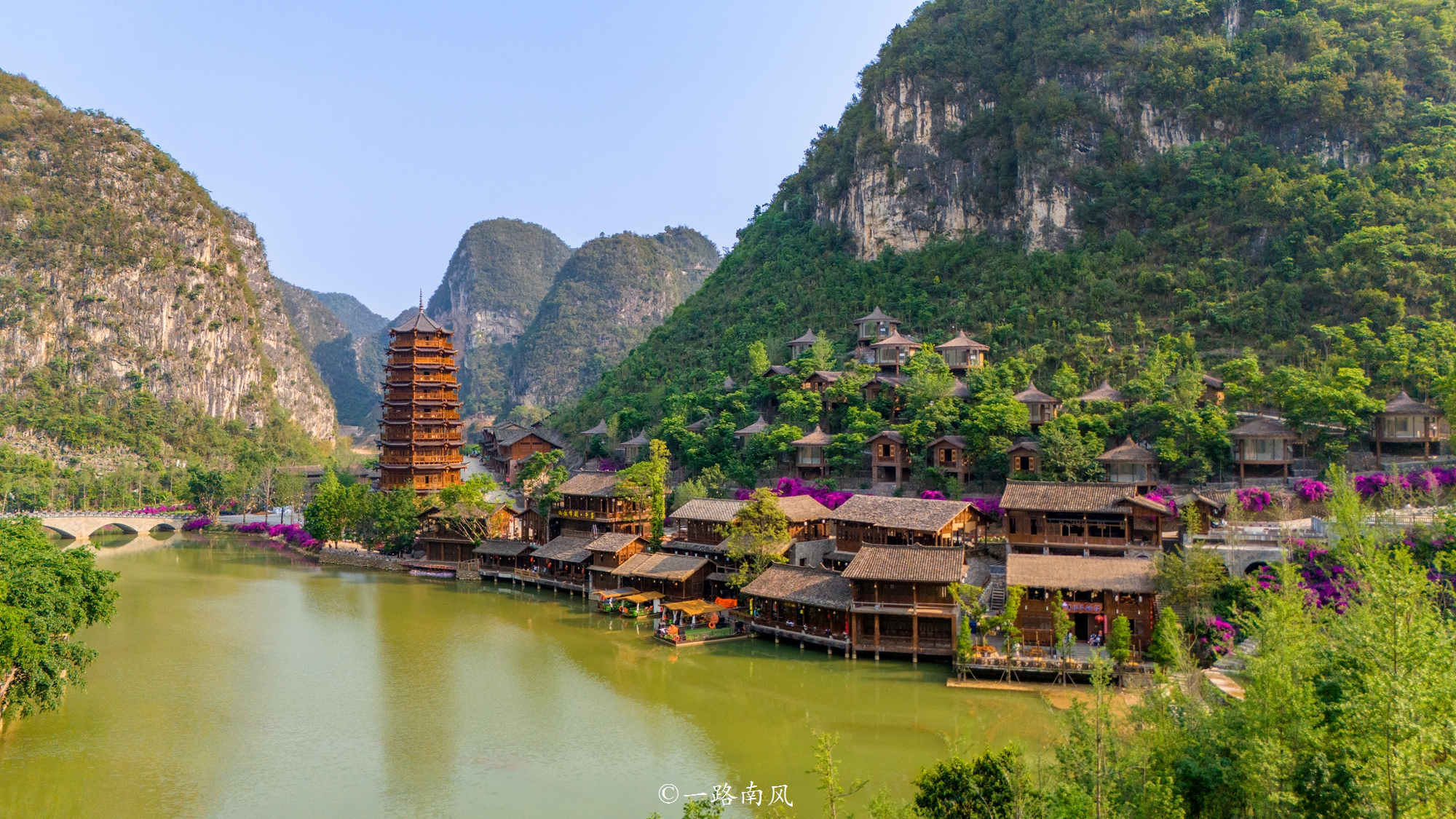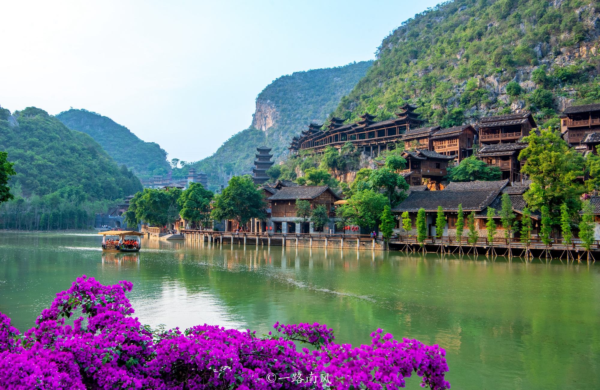一艘游船从远处驶来,穿过峰林布依的核心区,在艳丽三角梅的映衬下穿过桥洞,荡起一个个涟漪