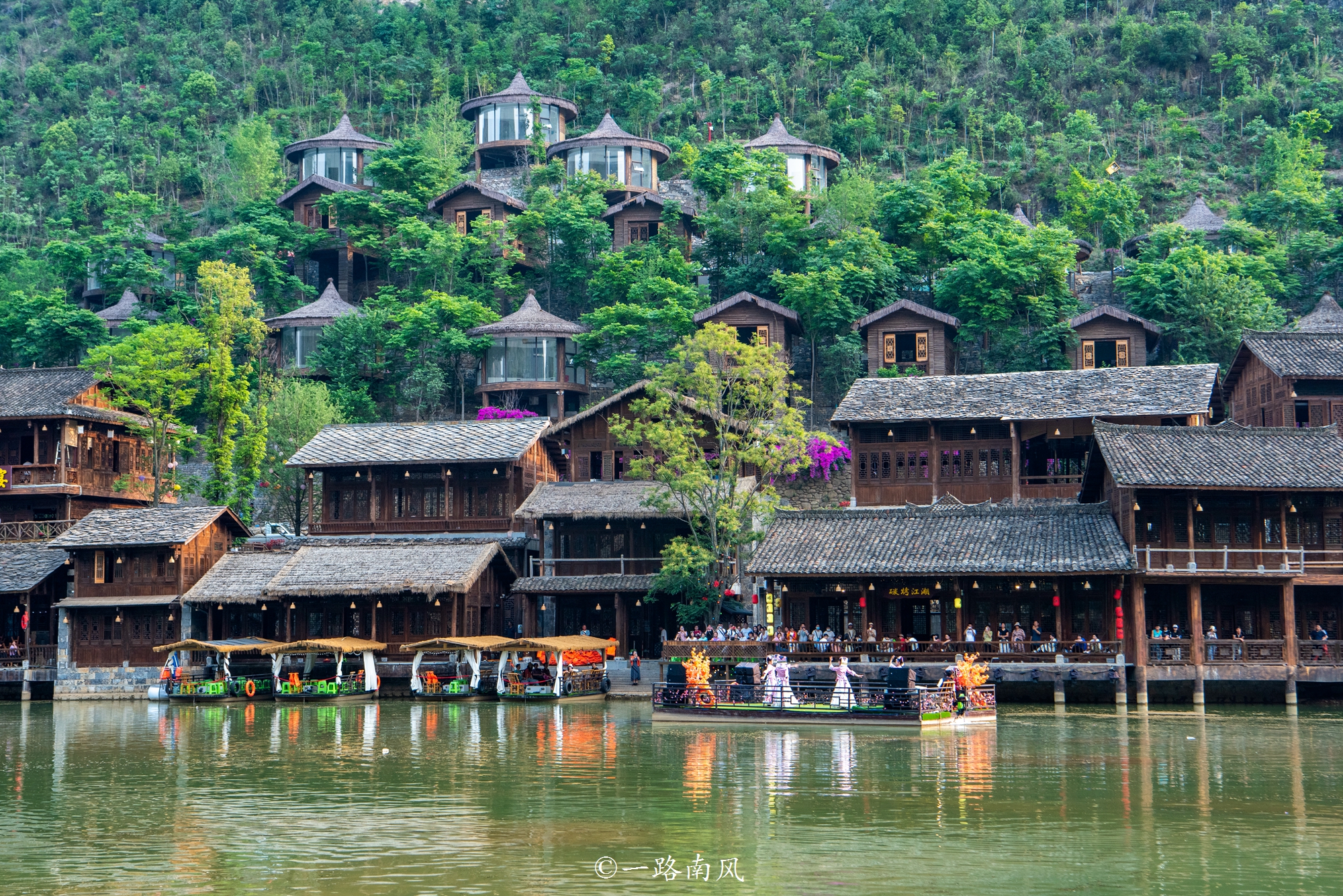 河边分布着很多小资情调的茶饮店、美食街,还有蜡染坊、刺绣坊、休闲街、非遗展示等,白天有水上文艺表演,晚上亮灯后像天上宫城。