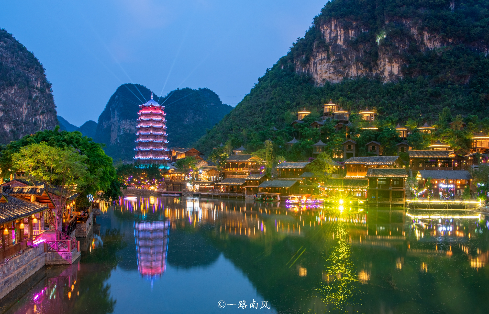 在河边的吊锅饭用过晚餐,走出饭店之时,天边尚有蓝光,但华灯已经惊艳了游人。