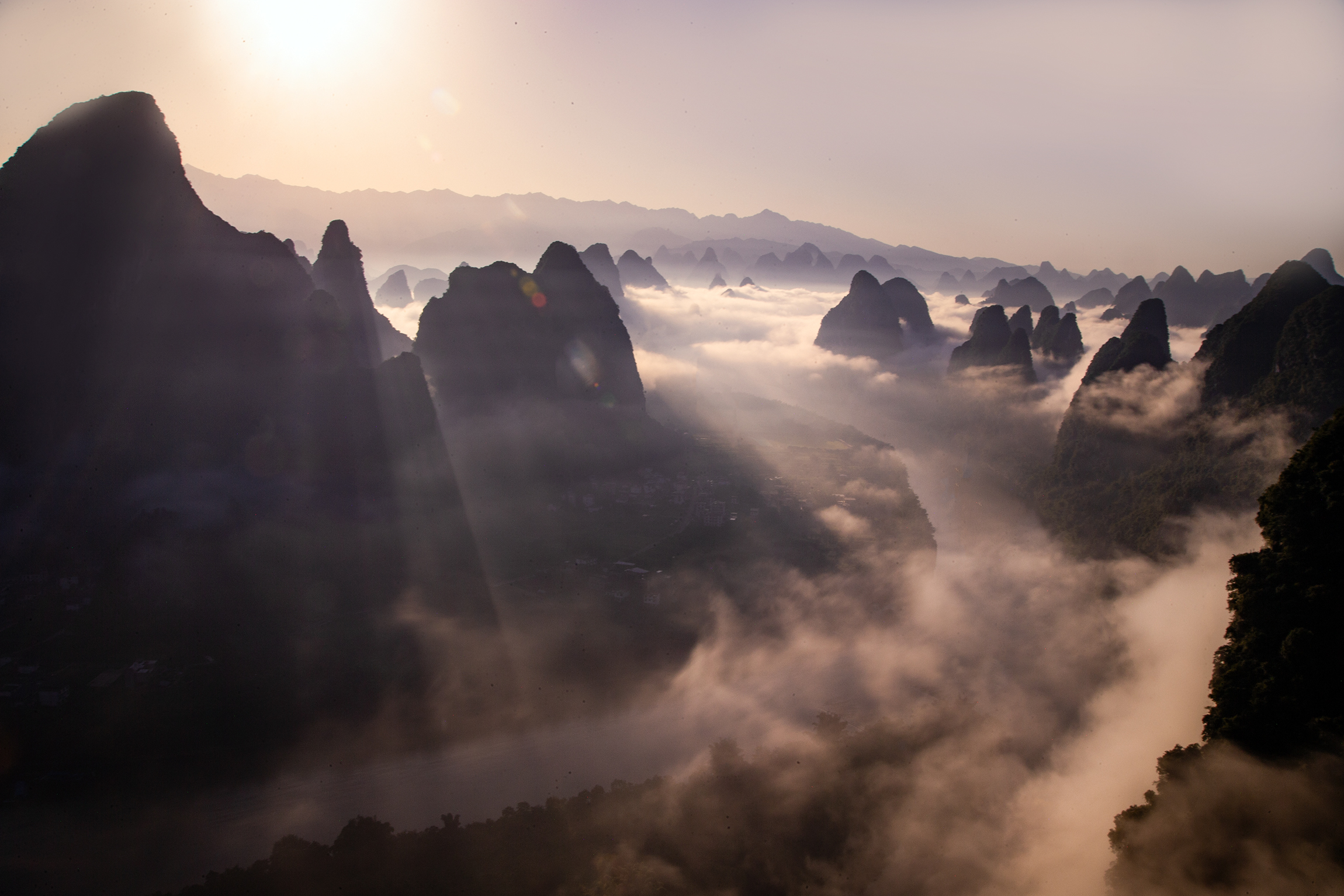 相公山,如古时头顶冠衣着服之相官人而得名,距桂林55公里,阳朔27公里,耸于漓江精华之巅,是镶嵌于水带清漓的璀璨明珠。站在桂林阳朔相公山上,青山照映、绿水环绕,漓江上的动态山水画卷一览无余。冰蓝与您一起以漓江水为伴,赏山水间天光云影共徘徊的诗情画意。去相公山,起码有五六十次了,但每次都有不同的感觉,不同的美。
