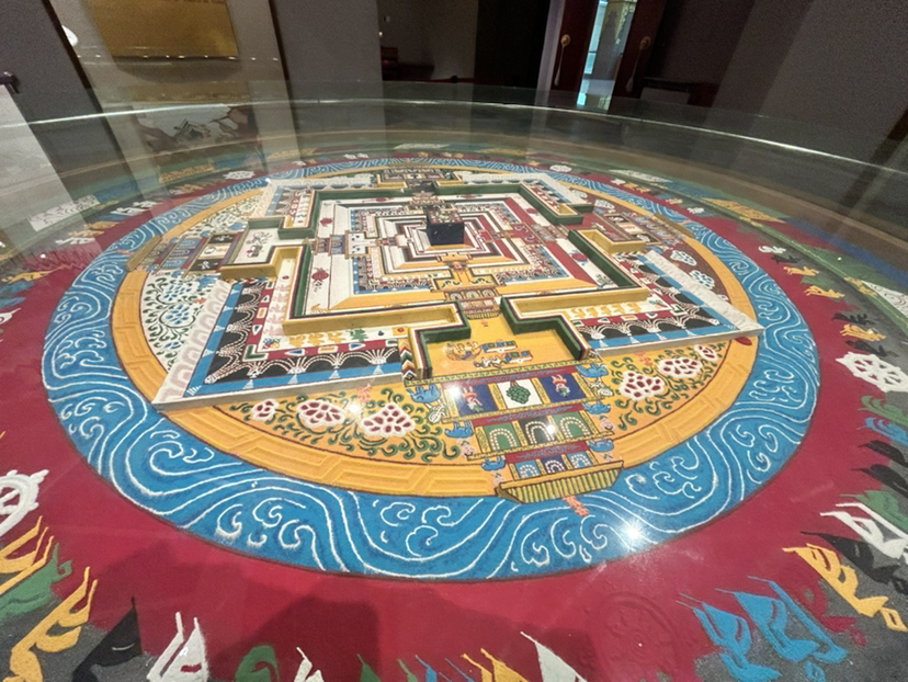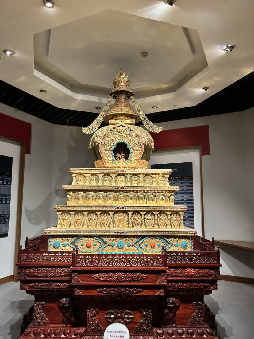 馆内的“镇馆之宝”,曾获吉尼斯世界纪录《中国藏族文化艺术彩绘大观》,长达618米,画面达1500平方米,上有唐卡700多幅,不同的堆绣图案3000多种。蜿蜒曲折的展墙营造了灵动的展示空间,不同于常规横平竖直的回路,不仅提升了巨幅唐卡的陈列场景,且巧妙地隐藏了柱子结构。彩绘大观内容包含了藏族对宇宙形成的认识、历史、宗教、医学、文化生活等诸多方面,堪称藏族文化的百科全书。