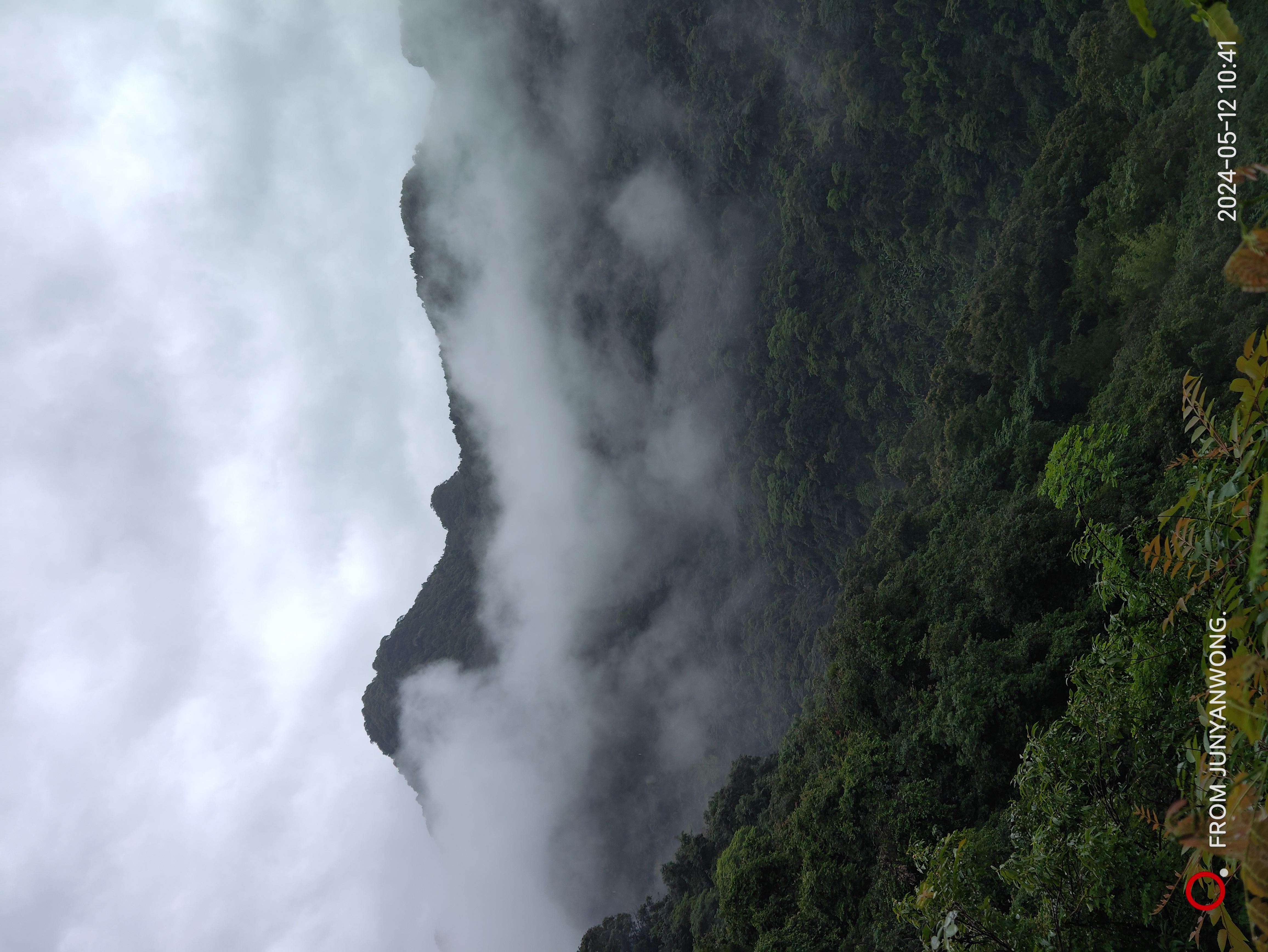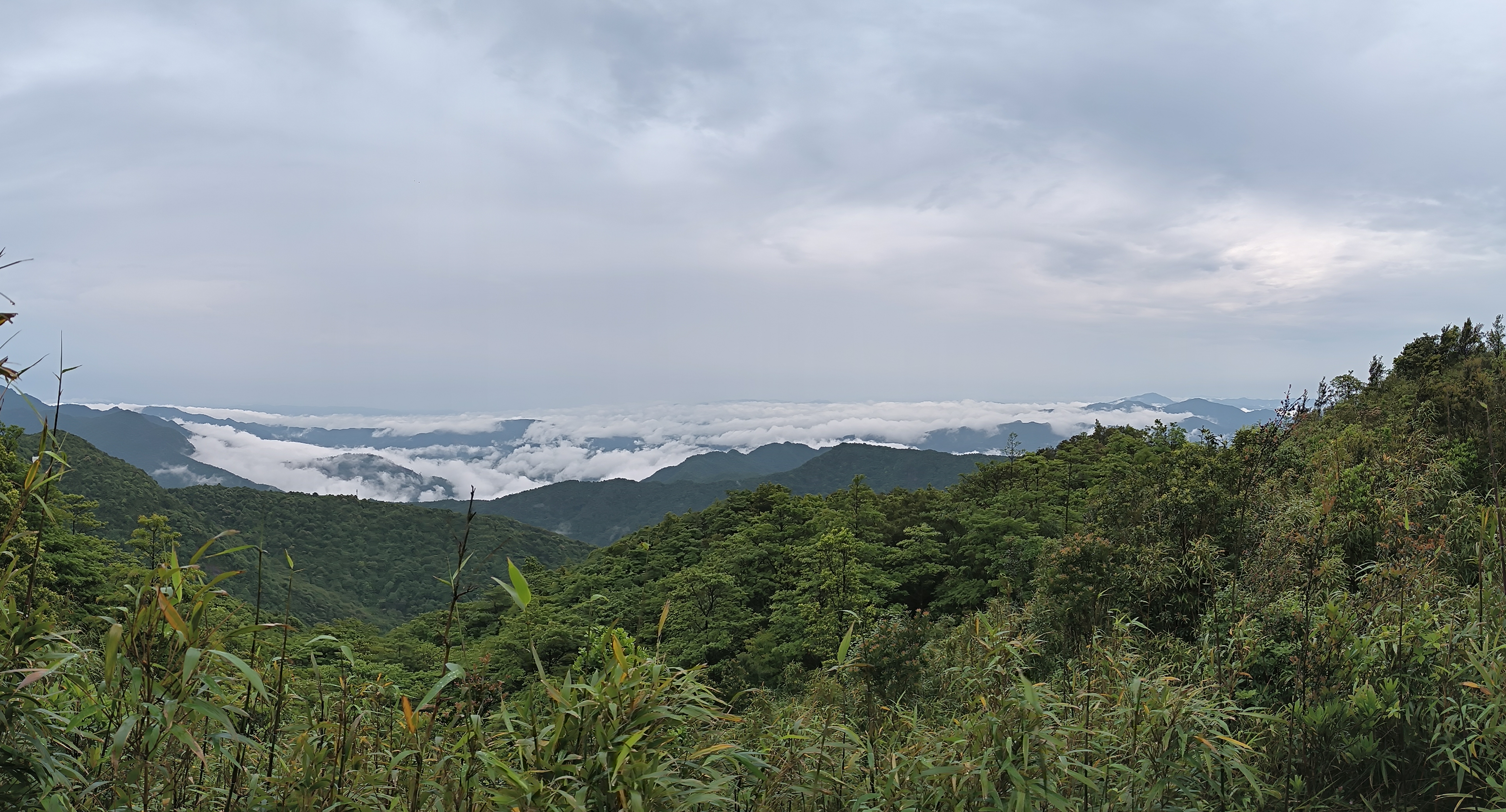 一路爬升,雨渐小,但偶闻雷声。衣服已湿,得保持行走,使身体发热。到达山顶,平台不大,矮草木丛,有三两棵小树。在这里,已是最高点。此时,周边山群云雾缭绕,一侧远处形成小型云海,如水墨画。因天气不稳定,担心雷电风险,不敢停留,得迅速下撤。初始下山路,有小坡上落。频繁穿过密实的箭竹林,路面好走,竹叶满是雨水,擦在身体。再往前,环境越原始,路径不那么清晰,特别是高竹林,竹子间距相若,感觉哪里都可以行走。后半段路况相当艰难,需要攀下石陡坡,行走在光滑的石头上。路面布满枯叶乱枝,应是前段时间大暴雨冲刷下来的痕迹,可以想像当时环境之恶劣。再往前,需沿溪流而下,河水丰满,流向下游,要涉水溯溪,距离有点长。首先得观察前路,辨别下游岸侧入口位置,再制定安全便捷的溯溪路线,这样就避免长时间置身河流之中。过了这段溪流,就基本好走,直到山脚的水泥道路。此时,雨雾已散,可见蓝天白云。衣服鞋袜已湿透,得迅速更换干爽衣物,确保身体温度。故,户外活动,携带物资是必需的,水、食物、衣物、雨具、照明等。皆因天气变幻莫测,特别在山区。万一有突发情况,就可必要应急。