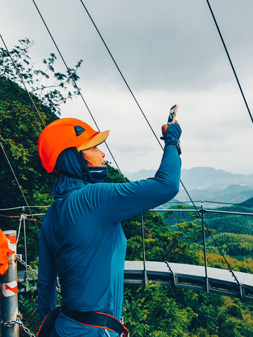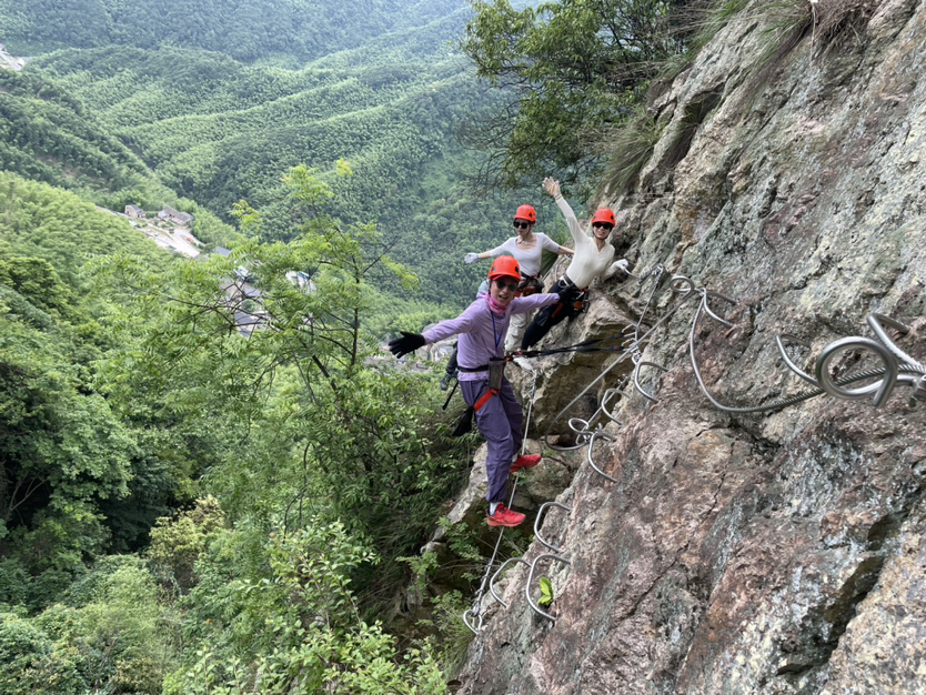 神奇画面之四:在中队长的持续忽悠之下,选A线的小伙伴都改成了B线,A线只剩3个人了,加上领队大江,互相一问原来都恐高。四个恐高的娃在我们加油起哄声中,颤颤巍巍的先爬了上去,一路的惨叫声被我们兴奋的吼叫声盖过,然而当所有人都爬上山顶的时候,习惯了操作方式和克服了恐惧,最后都变成了开心的欢呼。
