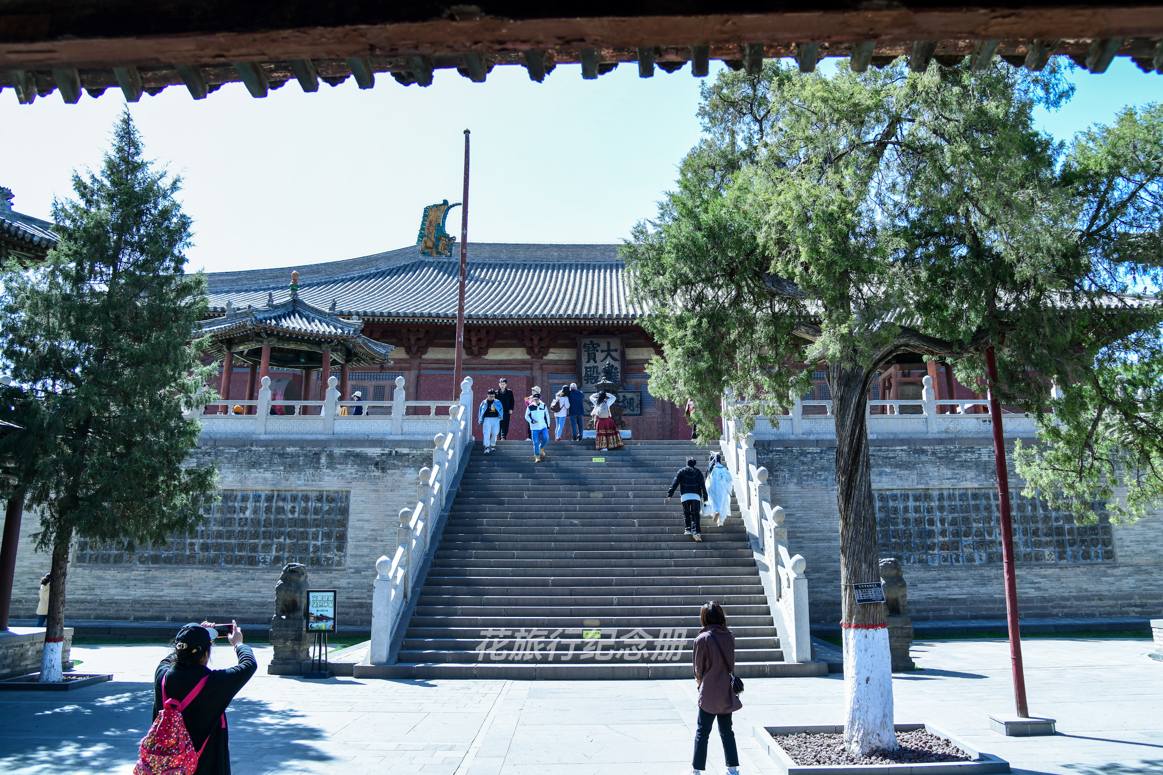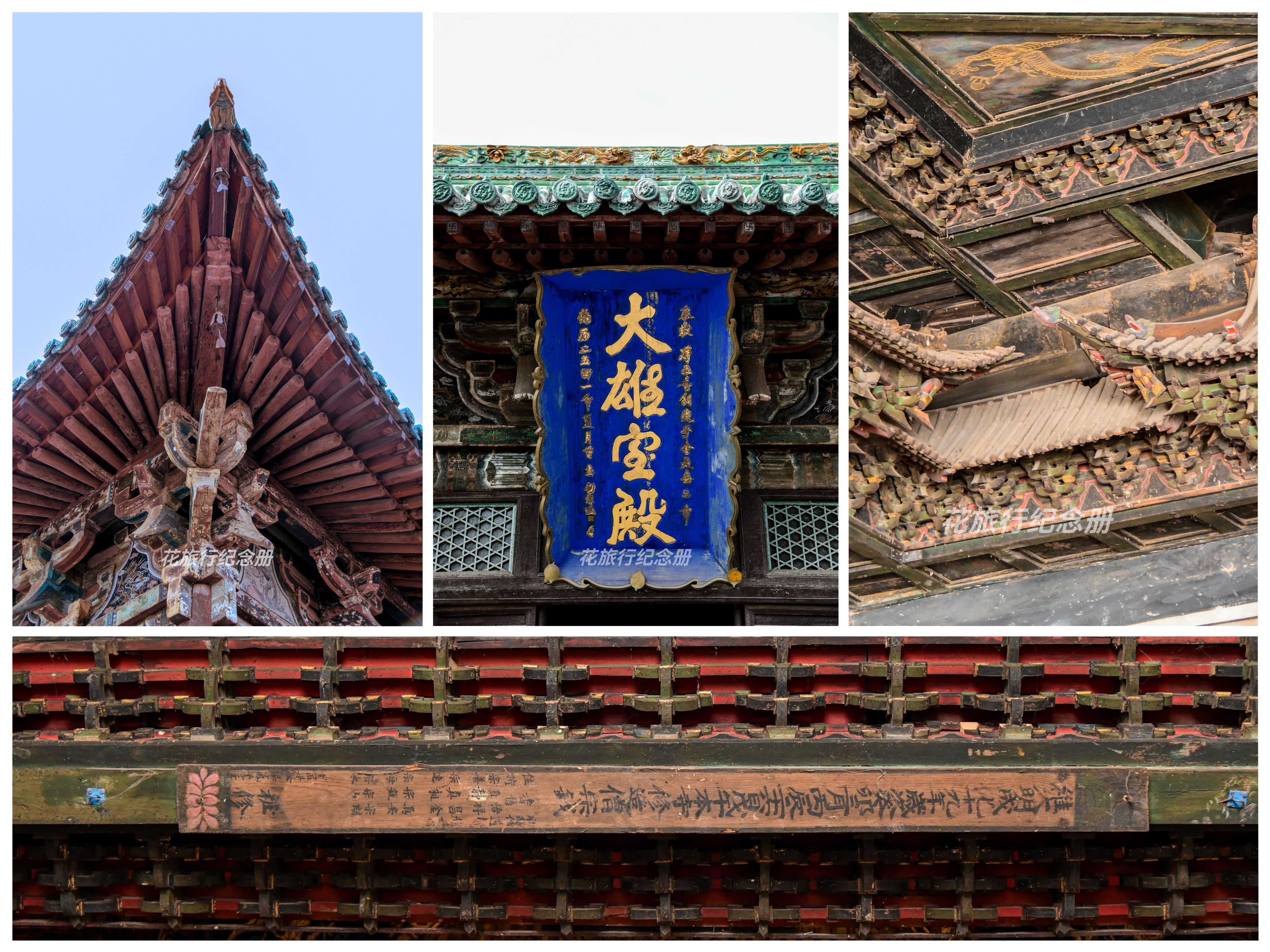 🍊大雄宝殿.金代,以房梁划分9个木质藻井,称为八门九星之天宫楼阁。数中间藻井精美,用到了混金彩绘。藻井饰以天宫楼阁,阁内壁板上绘有佛像,中间雕有两条金龙,四周用细木条搭斗拱,置平座,设栏杆,四面各开一门。
