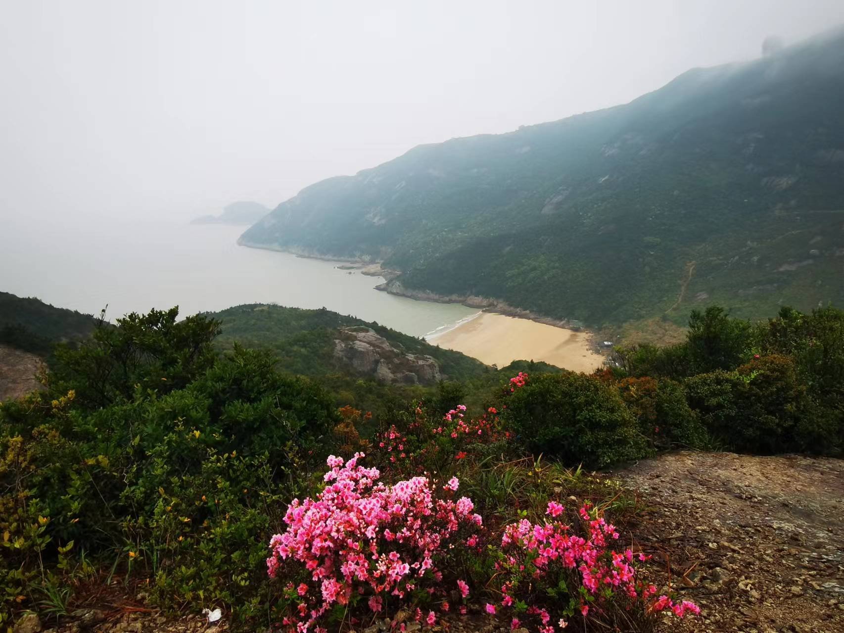 不多时,道路两侧的树木变为了低矮的草木,蜿蜒的山脊线清晰呈现在了我们眼前,如天路般连接着我们与远方。喜欢这样的山脊线,不仅是因为前方视野开阔、两侧景色秀丽,更是因为它带给我一种朝圣般的感觉。在这条直通海天相接处的道路上,我们都是户外虔诚的行者。渐渐地,在我们的视野中,杜鹃花出现了、大海出现了、沙滩出现了(正是水桶岙沙滩),温岭的种种美好,相继与我们相见。突然,前方一阵雾气飘来,云雾缭绕之中,前方挺立的山峰,刹那间若同仙境。看来呀,阴雨天并非单纯是增加了一丢丢爬山的难度,也同样带来了不一样的景致,好风光定不负我们坚定的前行。