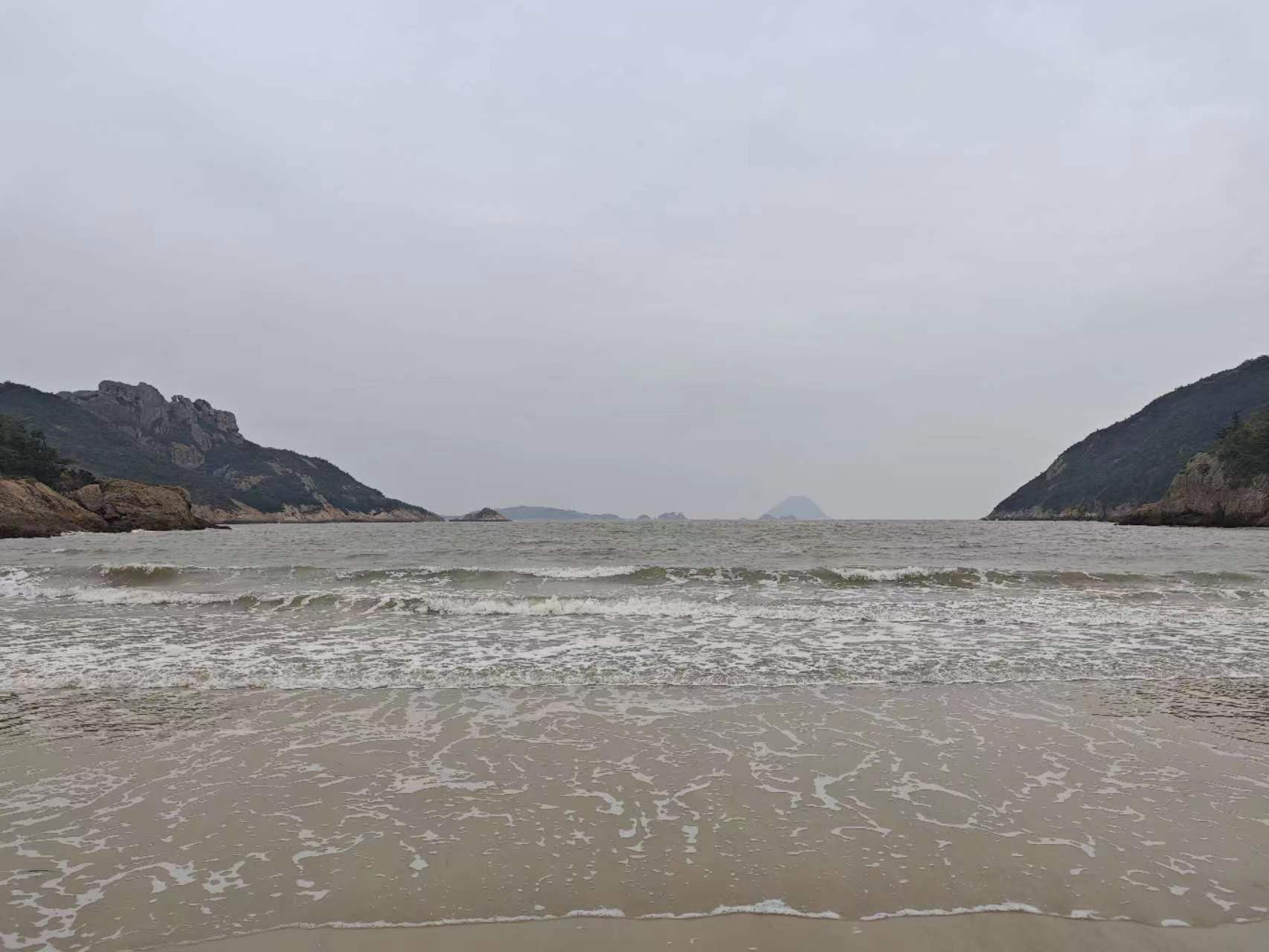 离开这块礁石几分钟后,我们终于来到了水桶岙沙滩。不知是不是下过雨的缘故,这片平坦洁净的沙滩,并不是铺满松软的沙粒,而是接近坚实的土地。若单纯论沙滩,水桶岙在祖国这片美丽的土地上并不显眼,它的独特之处,是将山峦、海洋、沙滩融为了一体,阳刚与婉约恰到好处地交汇在了一起,甚至可以与闻名遐迩的麦理浩径相媲美,因而成为了著名的网红打卡地。幸而清明时节未至旅游旺季、又加上天气阴沉,这里人迹稀少,我们得以和少数驴友静享水桶岙。lina、少姣先后漫步于沙滩上,欣赏着这片靓丽的景,也成为了一道靓丽的景。