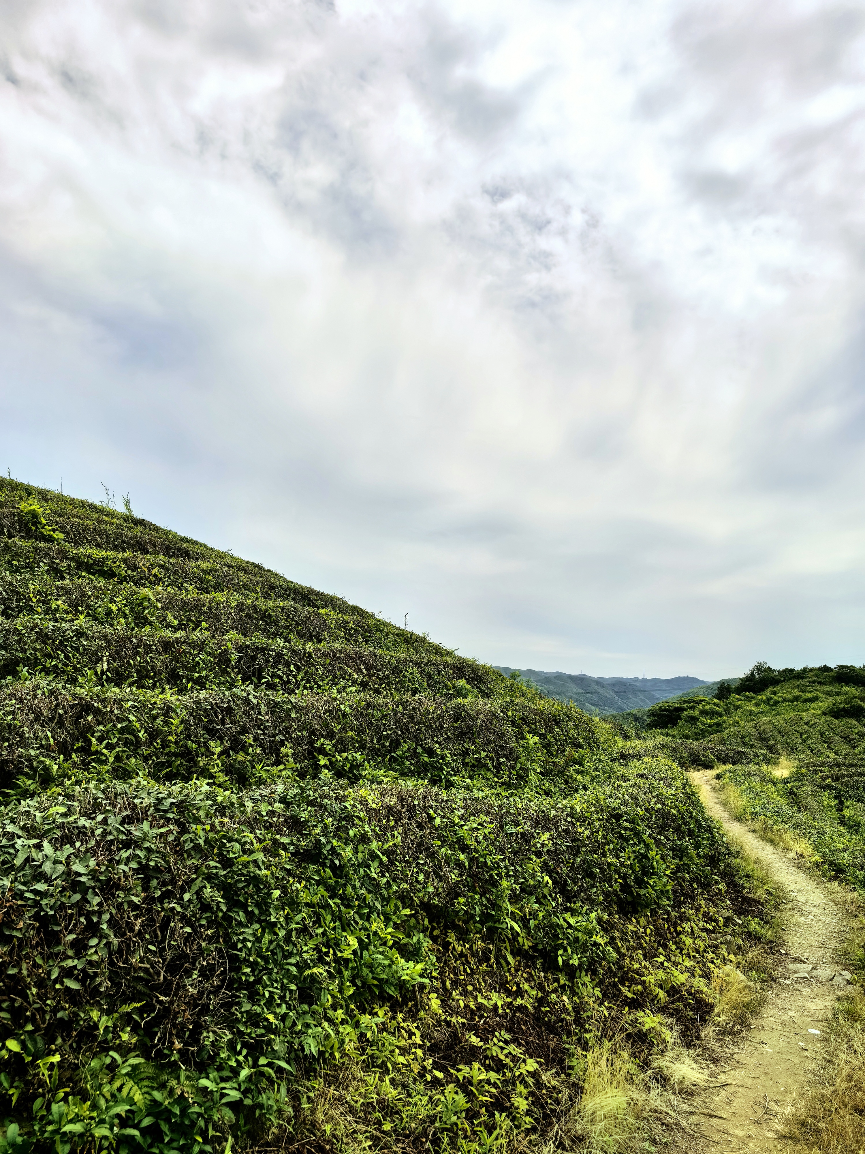 路上跟两个小伙伴偶遇,于是一起聊着走着很是愉快,但怎么一直没看到游侠客的路标带,这才察觉她们是其他俱乐部的。我赶紧回头找路标,却怎么也找不到,路上也没什么人了。不会看两步路的我决定就跟着感觉走一段吧,走到一片漂亮的茶园,记得行程里是有茶园一段的,应该没错。那一行行茶树好像一条条绿色的丝带,浓浓密密地伸展着,多么养眼的绿呀,与蓝天白云构成了一幅绝美的风景画,找不到路又何妨,我放慢脚步,漫步着、呼吸着、享受着。
