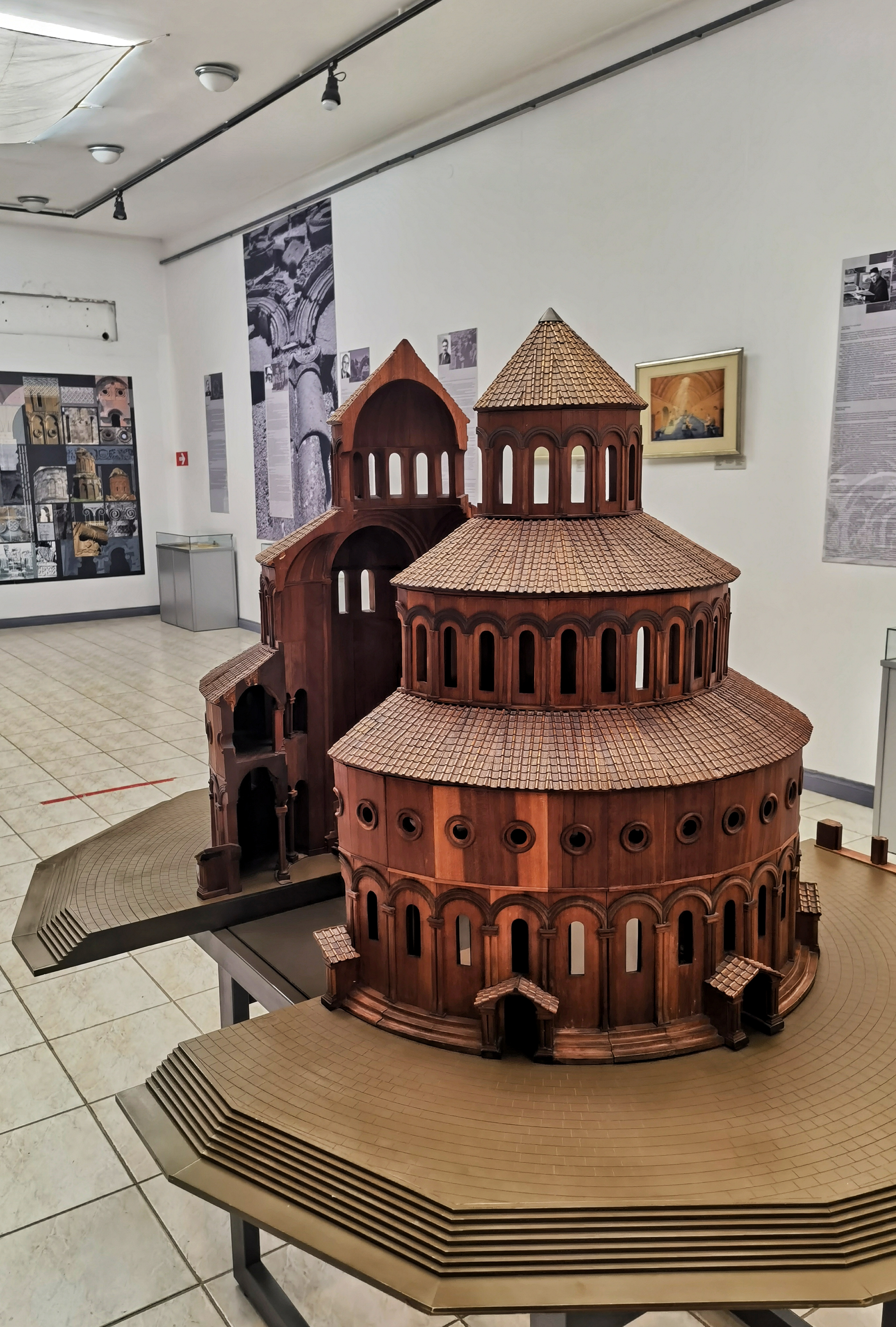 埃奇米亚津大教堂是亚美尼亚第一座教堂,建于301年,303年建成,有1700多年的历史。“埃奇米阿津”亚美尼亚语的意思是“耶稣降临之地”,教堂里设有圣物馆,收藏有诺亚方舟的残片、耶稣被钉在十字架时刺入其胸部的矛头和十字架的碎屑、千年前彩绘的《福音》书等,俨然是一部基督教历史书。从圣物馆出来可以看到远处的亚拉腊雪山——诺亚方舟在大洪水后停靠的地方。