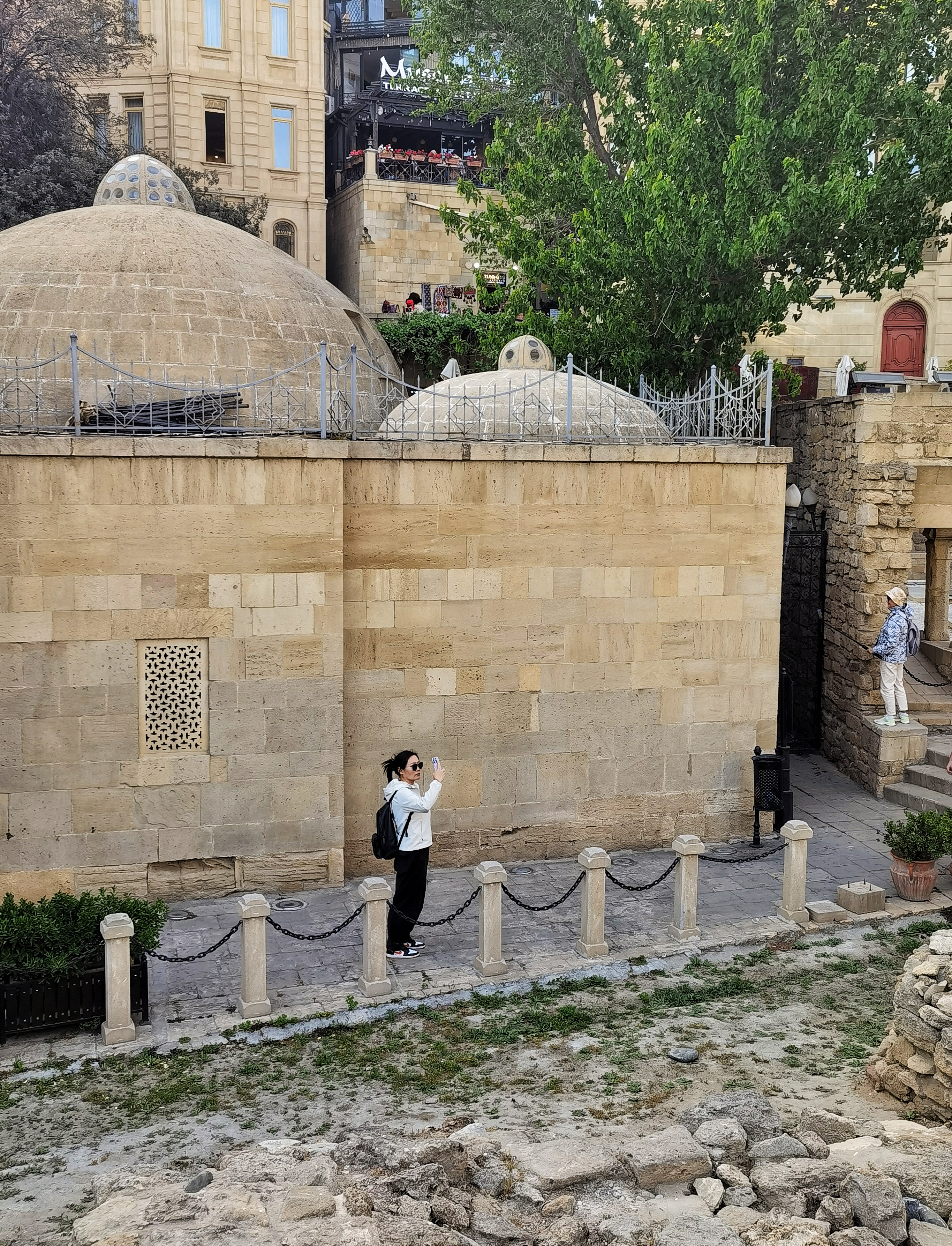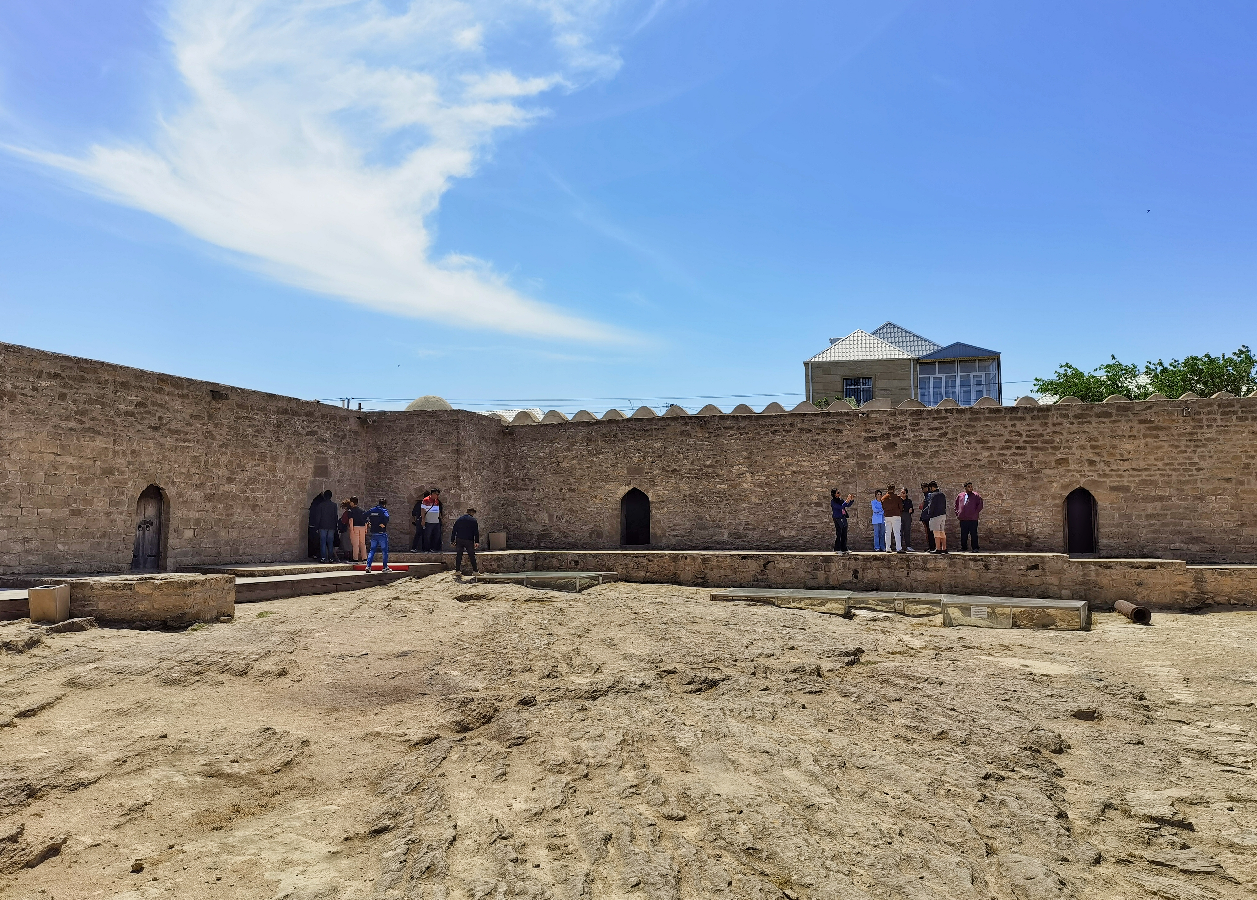 希尔万沙宫殿修建于十二世纪末至十四世纪晚期,位于内城的最高处,历经多次重建,包括宫殿主体、陵墓、清真寺、宣礼塔、浴室等。侧面墙面上有一排枪眼,是当时亚美尼亚屠杀阿塞拜疆人时机枪扫射留下的。
