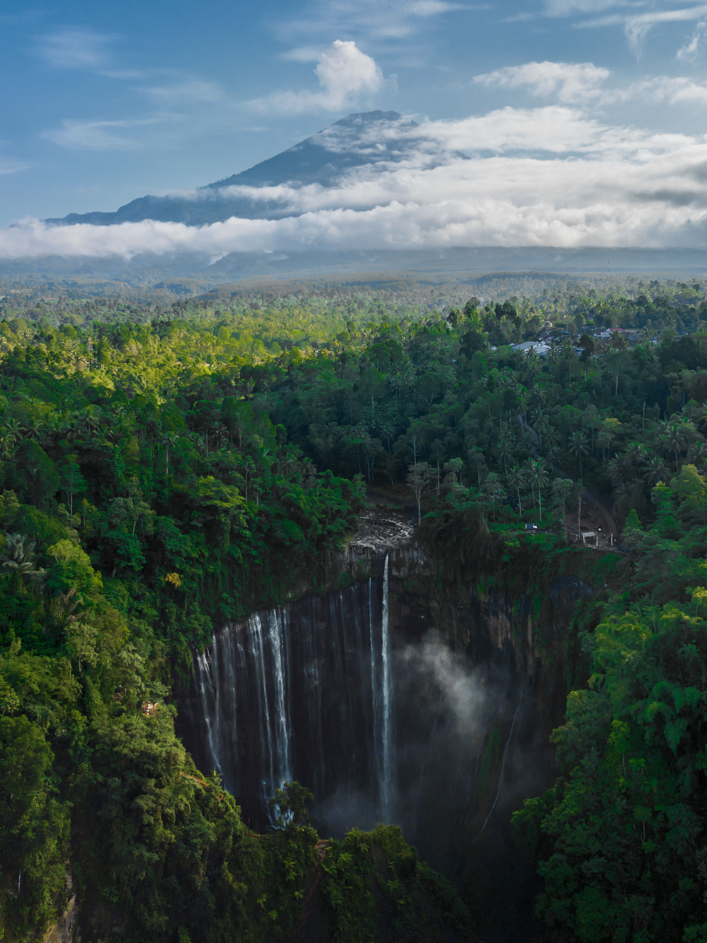 赛武瀑布最出圈的场景,大概就是下面这张:环状多线的瀑布群跟远处的赛梅鲁火山同框。