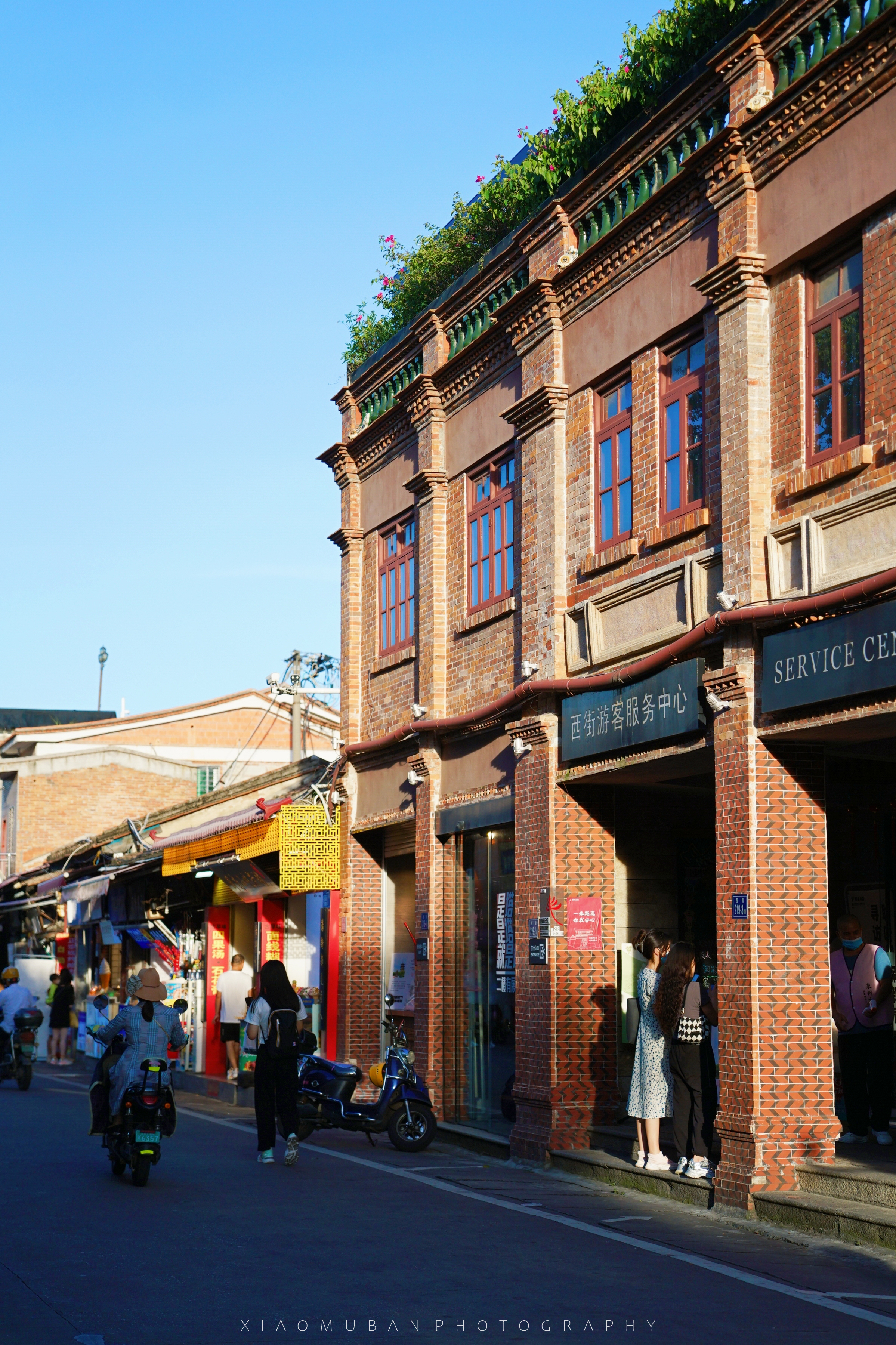 永宁街是永宁卫最负盛名的一条街,青石板铺成的道路,长达千米。街道两侧分布着不少店铺,大多是两层楼房,有木头房子,也有南洋风格的建筑。极少数店铺仍在营业,大多卖食杂,也有牙医诊所和蔬菜店。有些店铺虽然关着,但门外的招牌还在,“万通号小布庄”、“纱灯扎花”等,依稀可见昔日繁华。