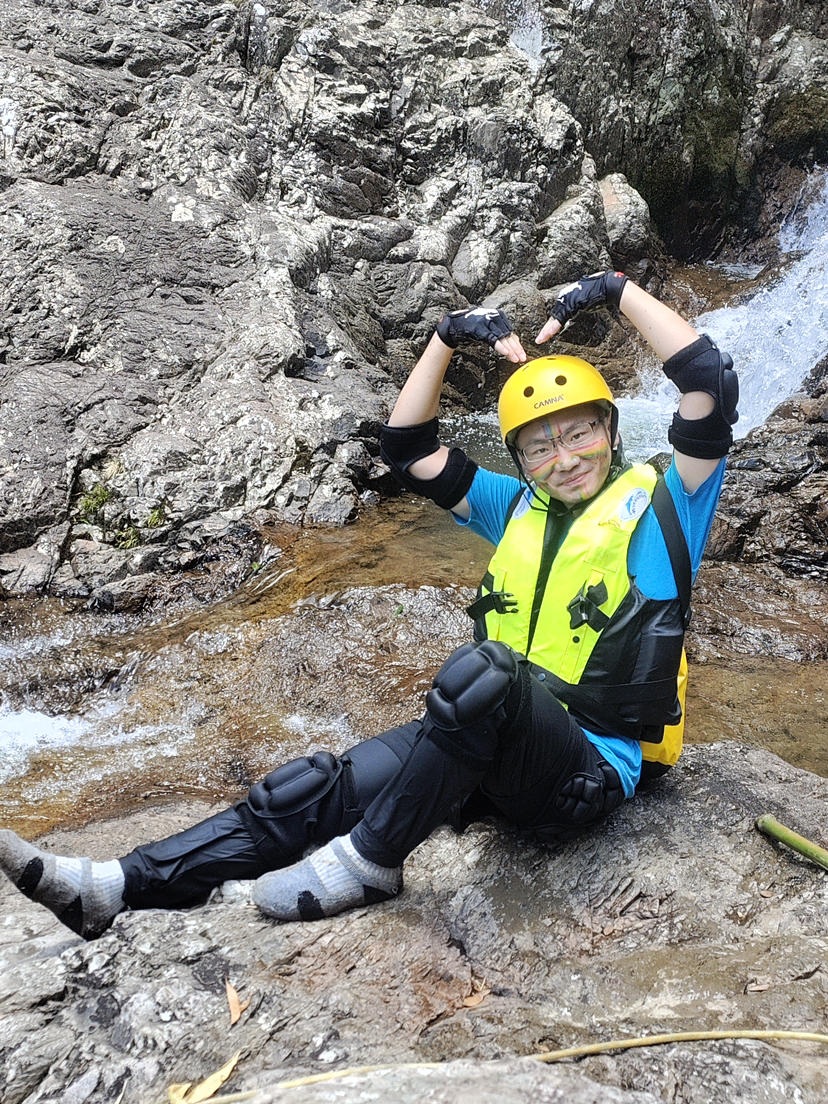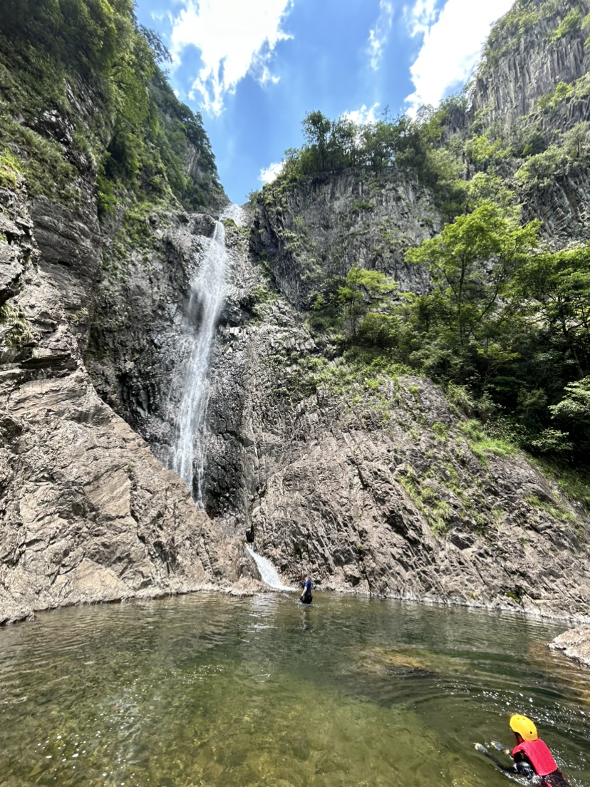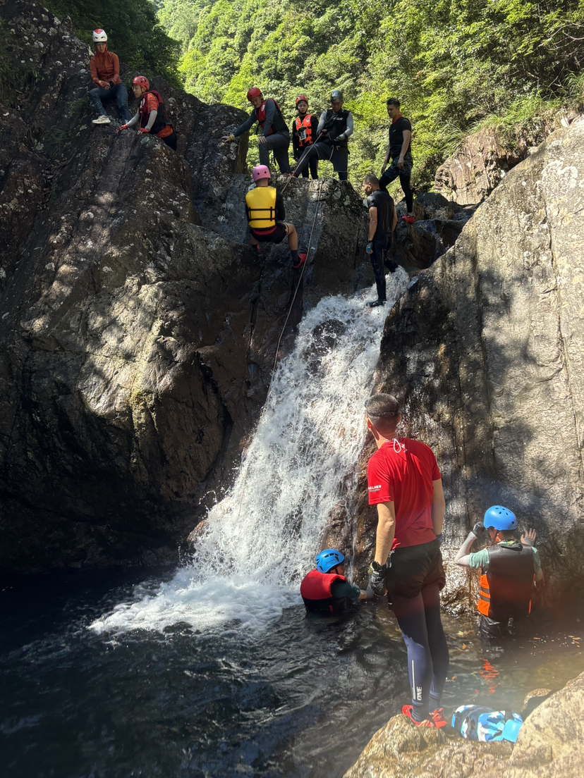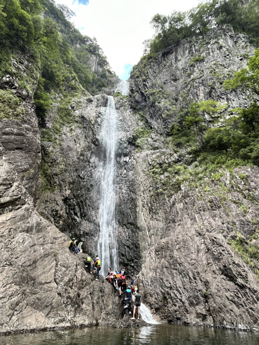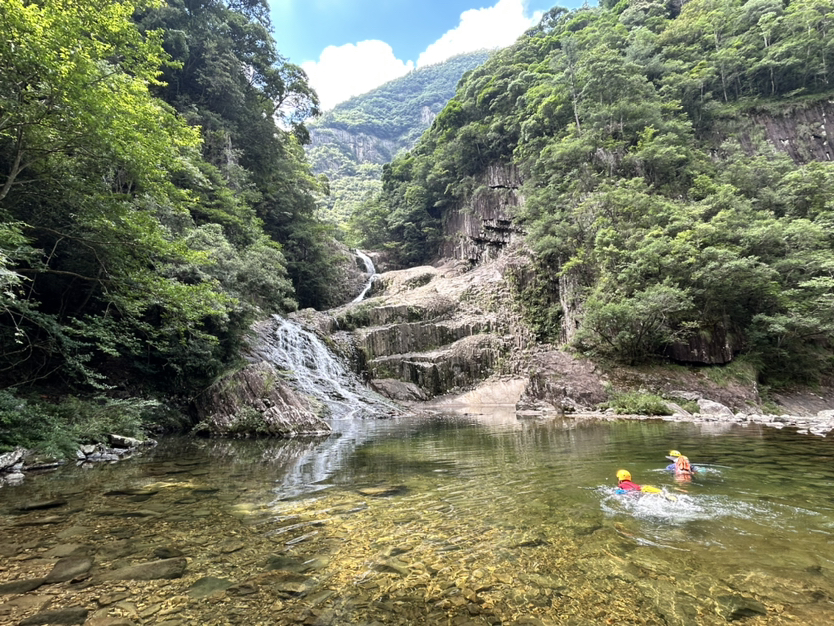 楠溪江发源于浙江省永嘉县西北面的大青岗(海拔1272米),这里不仅有龙凤大瀑布(落差198.9米的瀑布群),还有众多无名的瀑布和古村落。溯溪路线全程有四十余个天然的水潭,其中十几处可以跳潭&浮潜,高度在2-5米不等,水质清澈见底,溪石斑鱼欢快游弋。跳潭时大家互相鼓励,领队们全程守护,确保安全。整个过程不仅锻炼了身体,还让人充分感受到大自然的美丽和神秘。