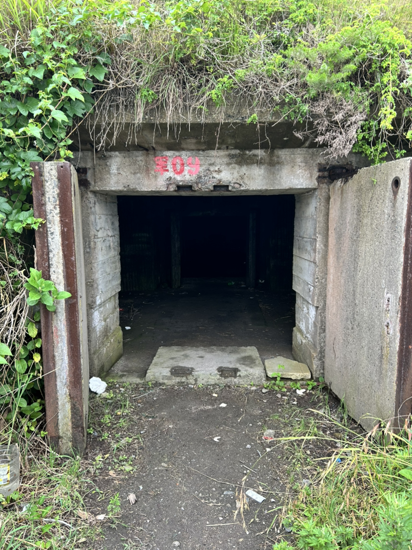 有趣的是,沿途可见不少废弃多年的防御暗堡,洞口被藤蔓和灌木所掩盖,若不仔细观察,很难发现它们的存在。它们有的坐落在海岛的制高点,有的藏匿在崖壁之中,有的沿栈道排布,内部交织,贯穿山体,犹如血管网一样错综复杂,内部结构坚固,历经风雨的洗礼,依旧屹立不倒。远观墙体的斑驳,石缝间长满了青苔,仿佛在诉说着过往的历史。我走近仔细观察,发现碉堡的入口已经被岁月侵蚀得模糊不清,但轻轻抚摸,仍然能够感受到这些重要防御工事曾经的光辉岁月,守卫着后方祖国母亲的安危。我们发现有一处暗堡厚重的铁门敞开,大家打开手机的手电筒功能,照亮前方的道路,继续向暗堡内部探索,洞内昏暗而潮湿,空气中弥漫着一股泥土的芬芳。随着洞穴的深入,我们不时听到水滴落在地面上的声音,清脆而悦耳,环顾四周,仿佛置身于一个神秘的地下世界。很快来到一口竖井,井内水位比海平面高出许多,很容易就能打到水,原来是岛上宝贵的淡水资源,雨水通过山体渗透过滤,汇聚于此,相对干净,在早期解决了守岛将士们的燃眉之急,现在依然是当地渔民可简易获取淡水的水源地,依然弥足珍贵。由于担心影响行程计划,我们探索完防空洞内的冰山一角就从另一道门出来,重见天日,(军9进,军10出),回望这些宏伟的工事,不禁感慨前人在困难时代中做出的伟大牺牲。如今,虽然这些堡垒已褪去昔日的光辉,但仍然让人感受到一种历史的凝望与厚重感。