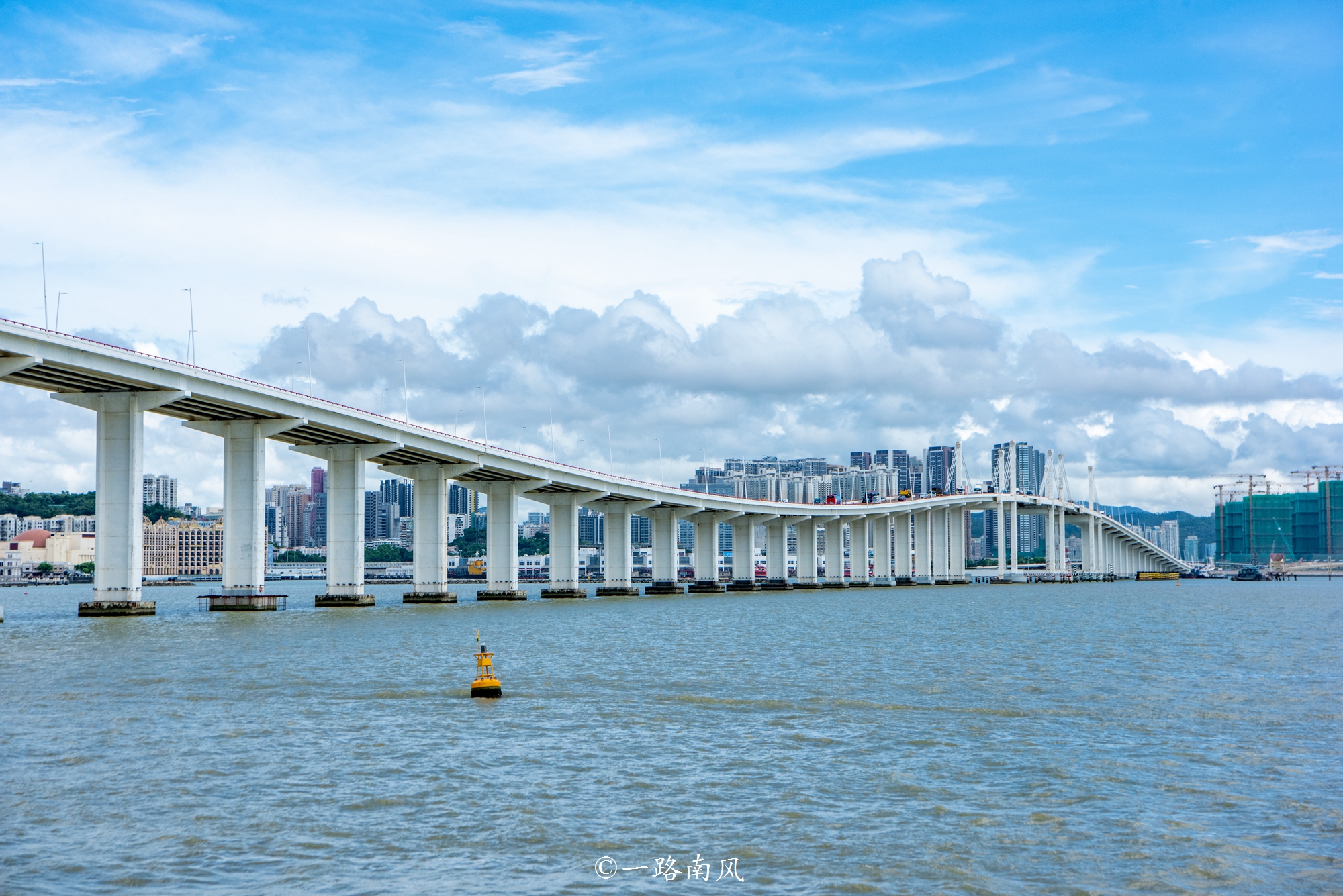 这条航线最经典的景观当属伶仃洋海域内的港珠澳大桥,此桥连接珠海、澳门和香港三地,全长55公里,集桥、人工岛、隧道一体,主桥就像一条姿态优雅的长龙在伶仃洋飘舞。