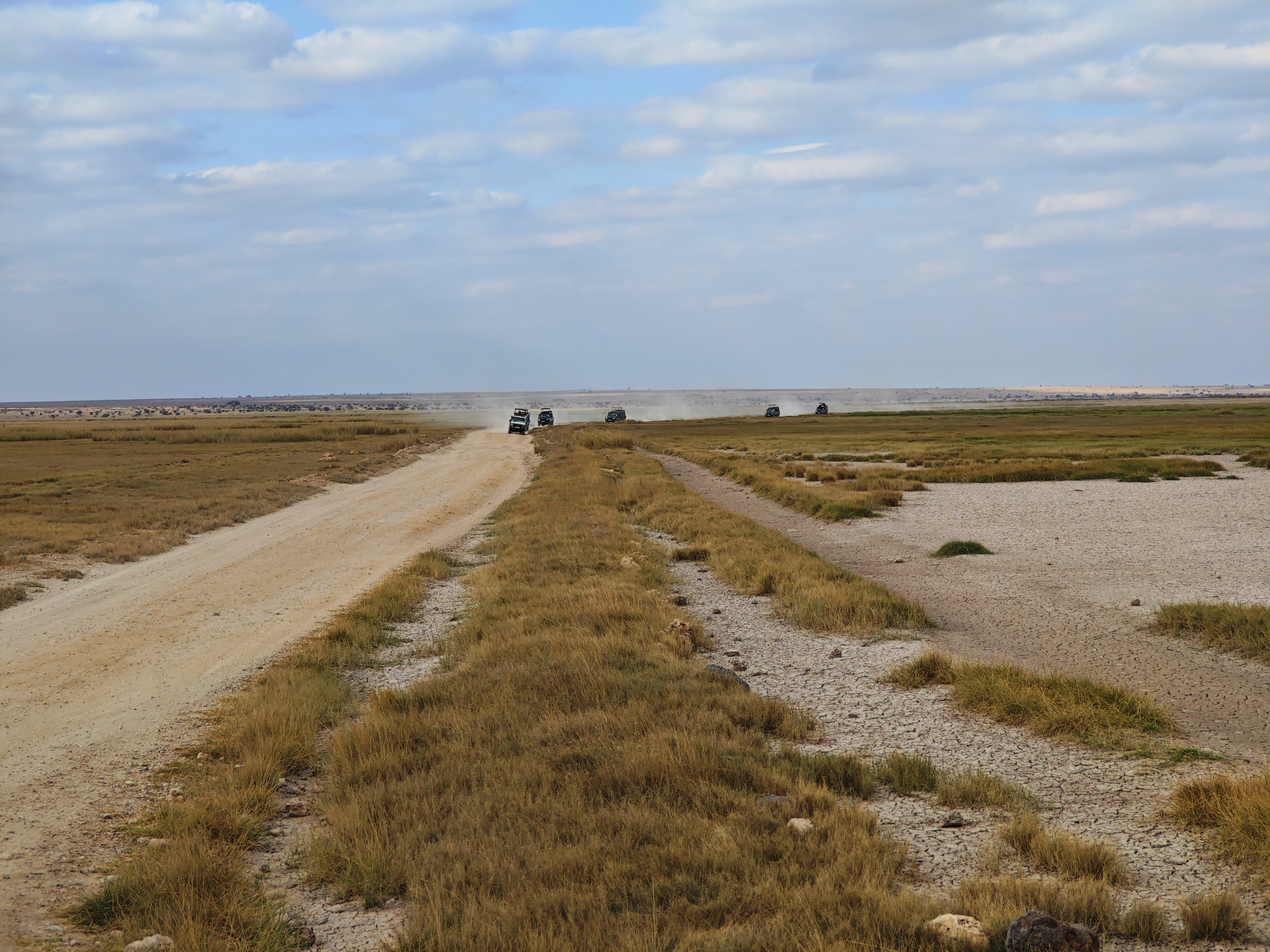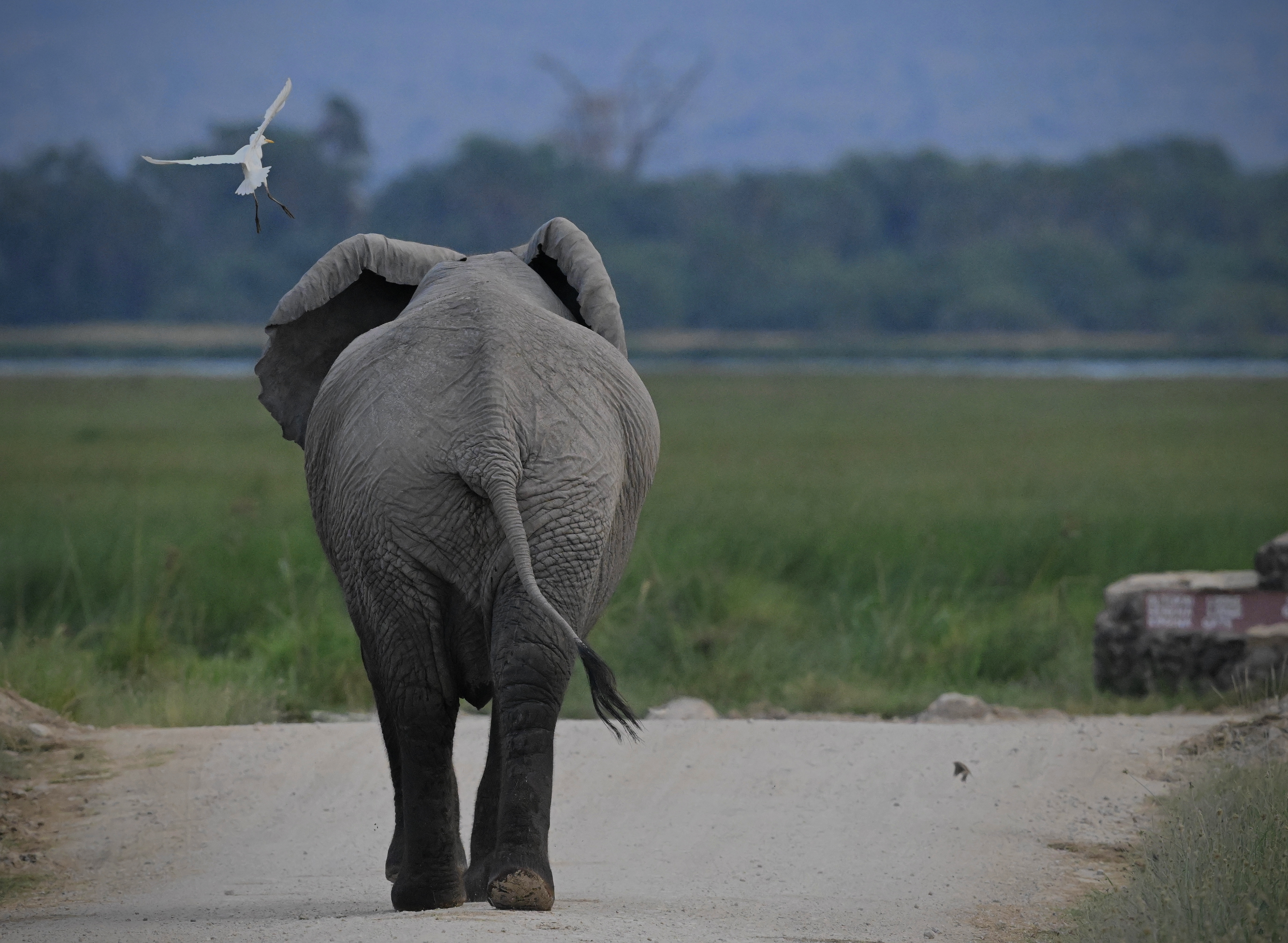 慢慢地,蓝天露出来了。我们看到的象群也越来越多。好的司机,能根据远方象群的走向,判断出哪个位置象群会过公路,然后第一时间赶到那里等候。幸运的是,满布西就是这样一位好司机。每次停车拍照,他都等我们明确指示后,再启动车。游猎车的司机,很辛苦,但在肯尼亚收入算高的,他们很珍惜这个职业。