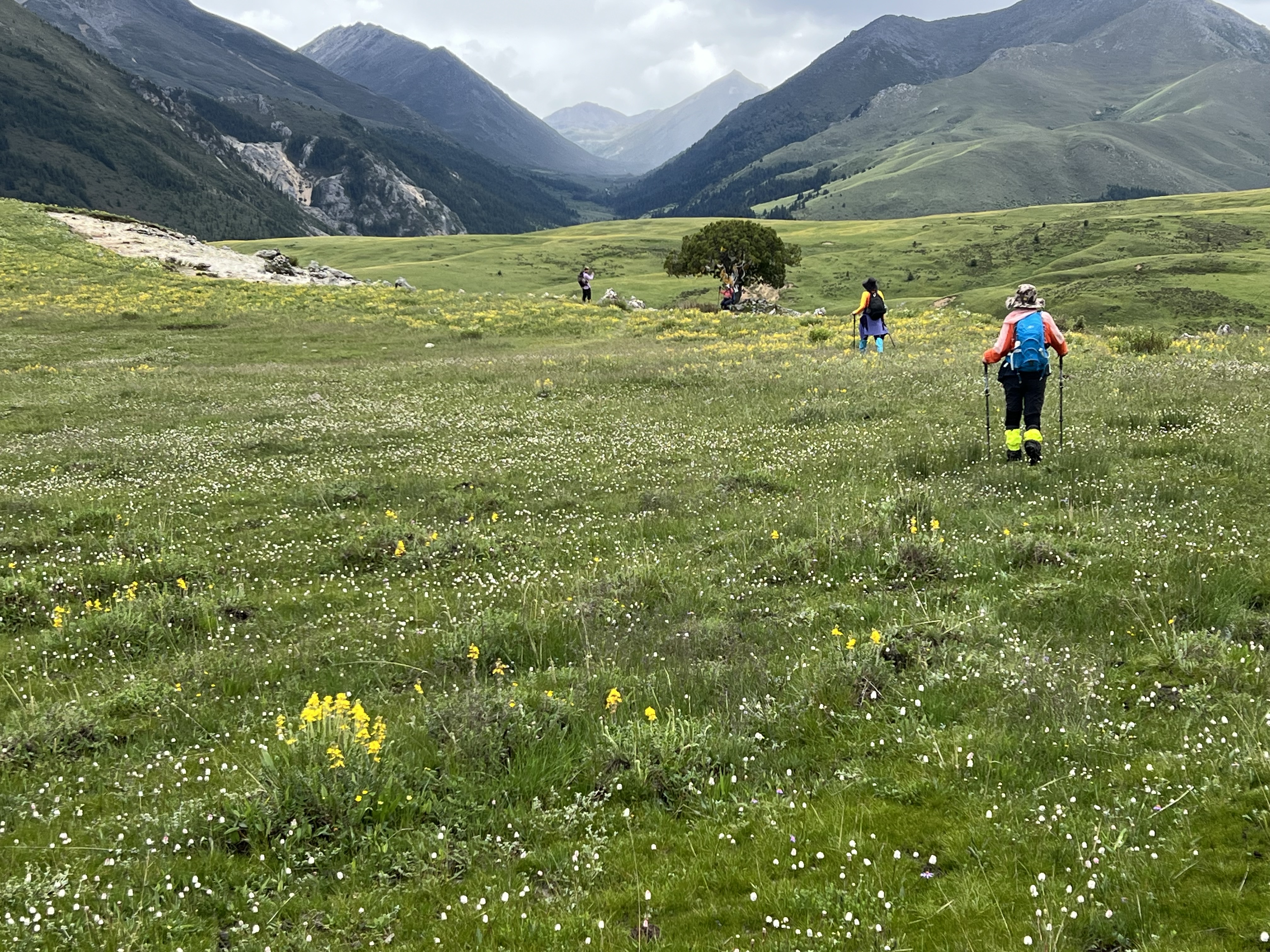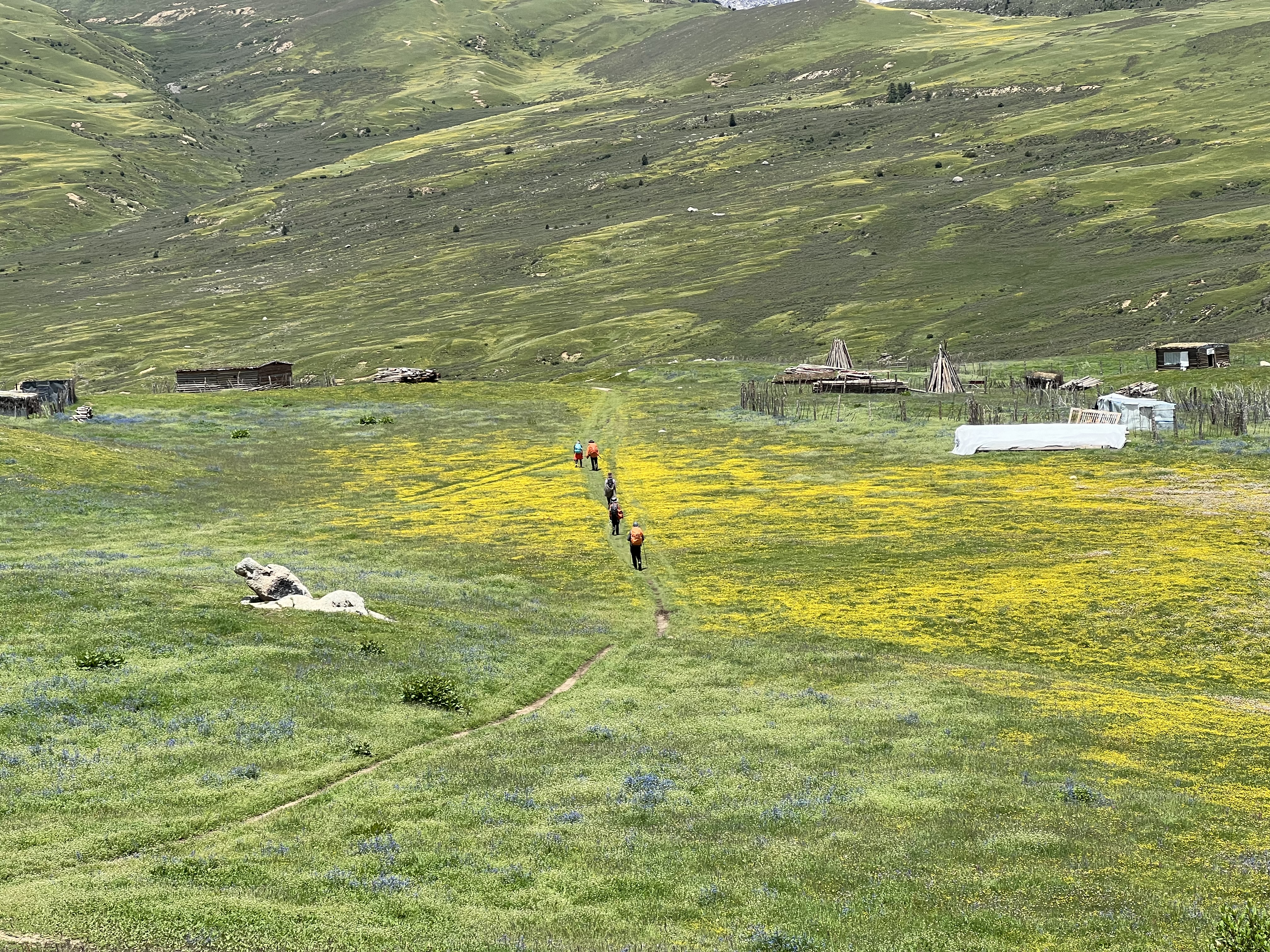 沿着拉普沟河谷前行,穿过比较难走的沼泽地和灌木丛,走过开满鲜花的高山牧场,还遇到了热情好客的牧民和小朋友。