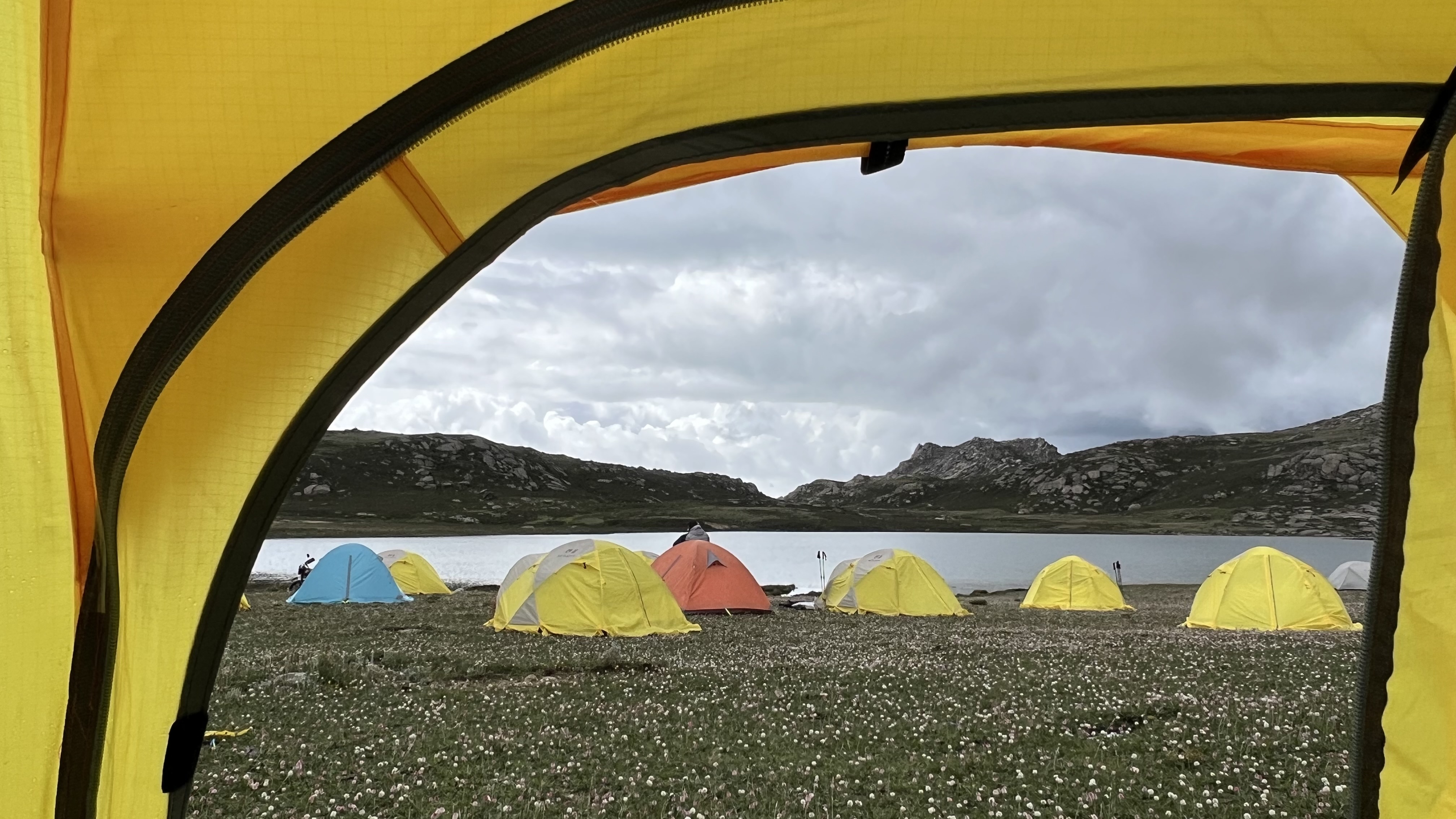 大约4点左右,远处乌云密布,领队通知大家赶快收晾晒的东西,要下雨了。我们把睡袋和衣物扔进帐篷中,大雨就倾盆而下。