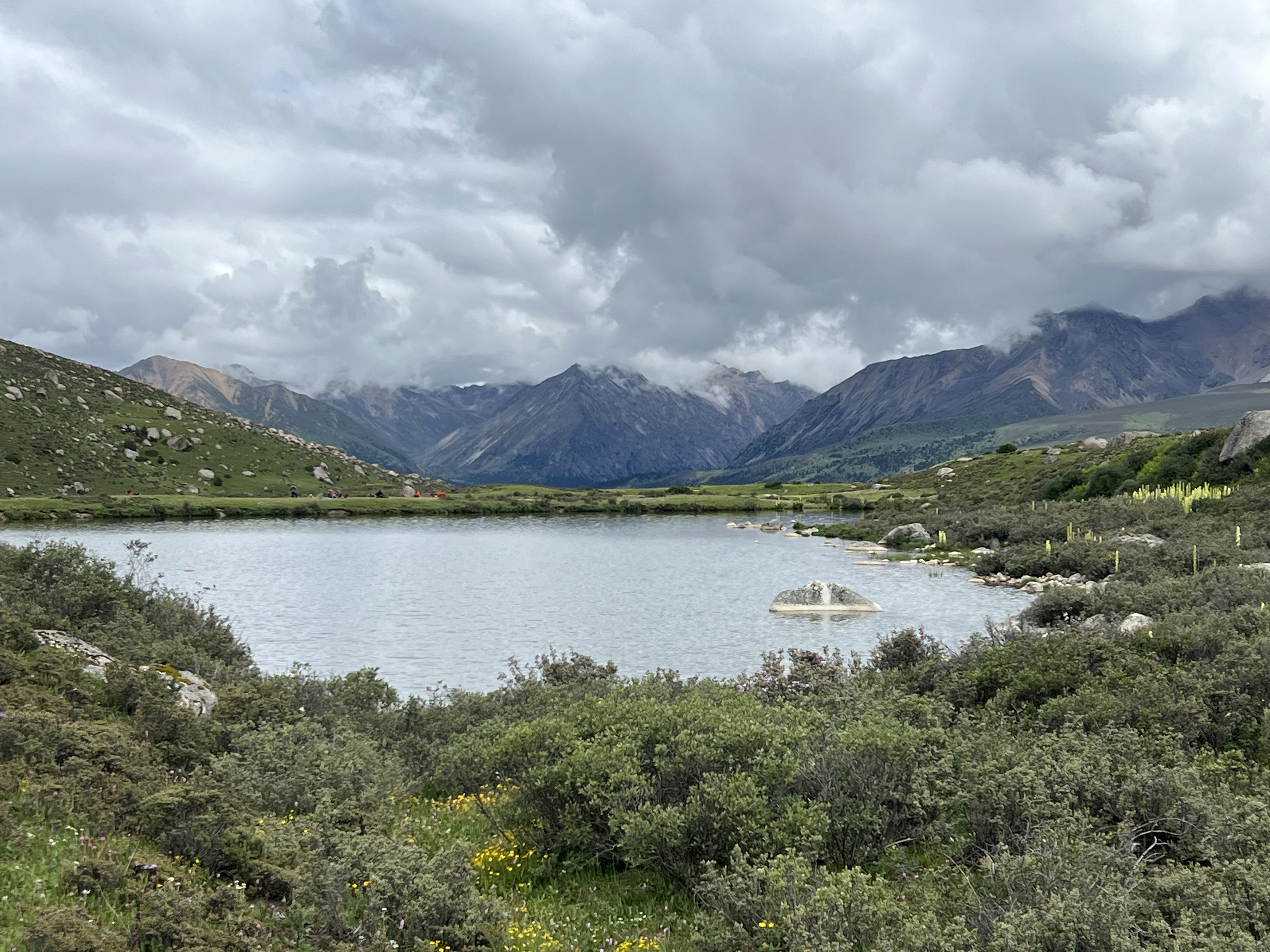 徒步大约1个小时,要攀登垭口时,开始下雨。我们穿上雨衣继续向上。翻过4880米的夏窝格扎垭口,我们开始徒步在开满小花的草甸间,又沿着峡谷走在有许多塔黄盛开的灌木丛及湿地中,翻过几个坡,下午1点50分我们就到达了措娘卡。(海拔4741米)。措娘卡为海拔最高的湖,河流在此起源、大地在此汲取水分。