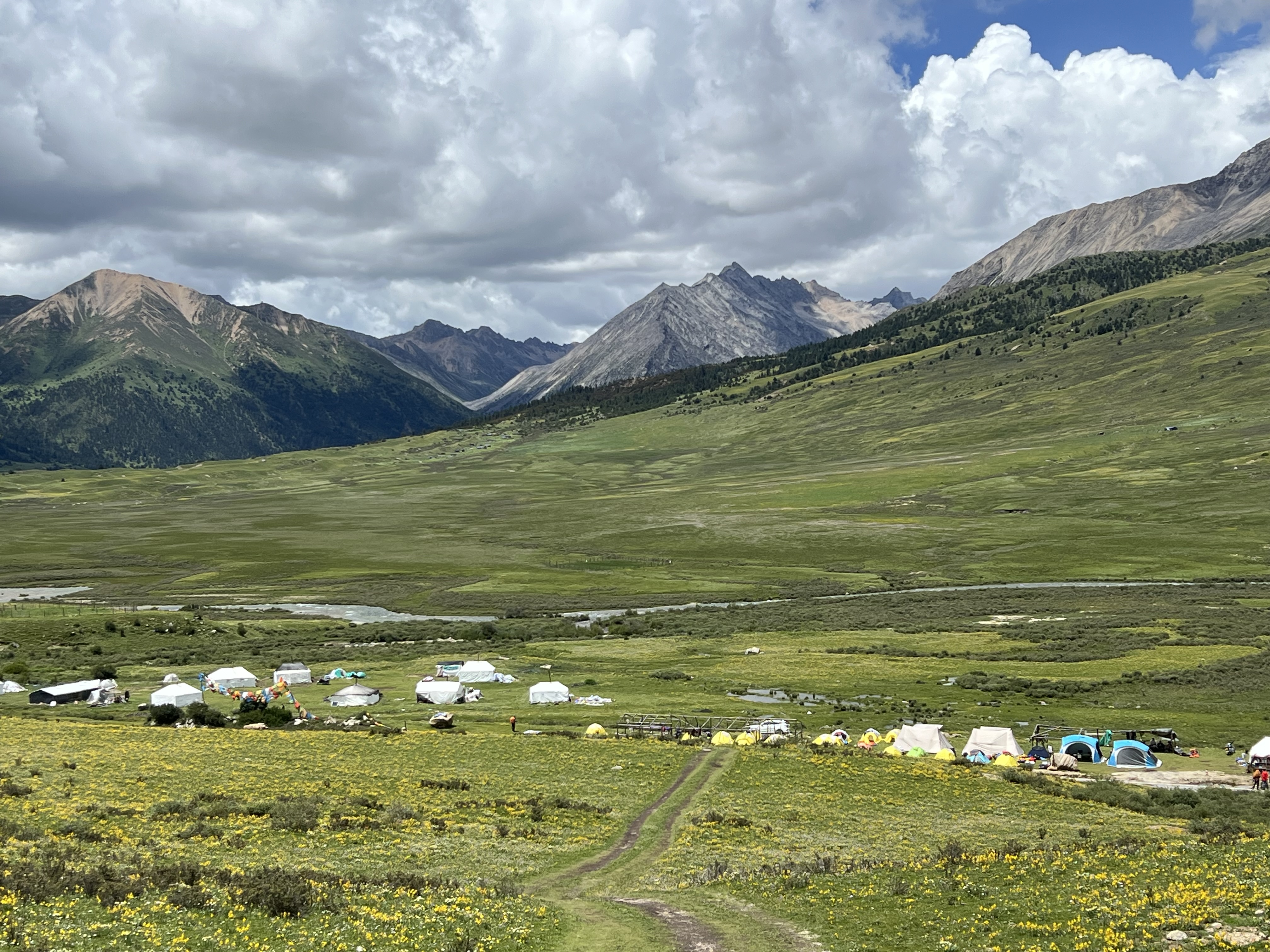 我们的营地搭建在措娘卡湖边开满小花的草地上,拉开帐篷我们就可以看到措娘卡湖,以及在蓝天和白云的映衬下幽幽的远山。这里不愧为五星级的营地。