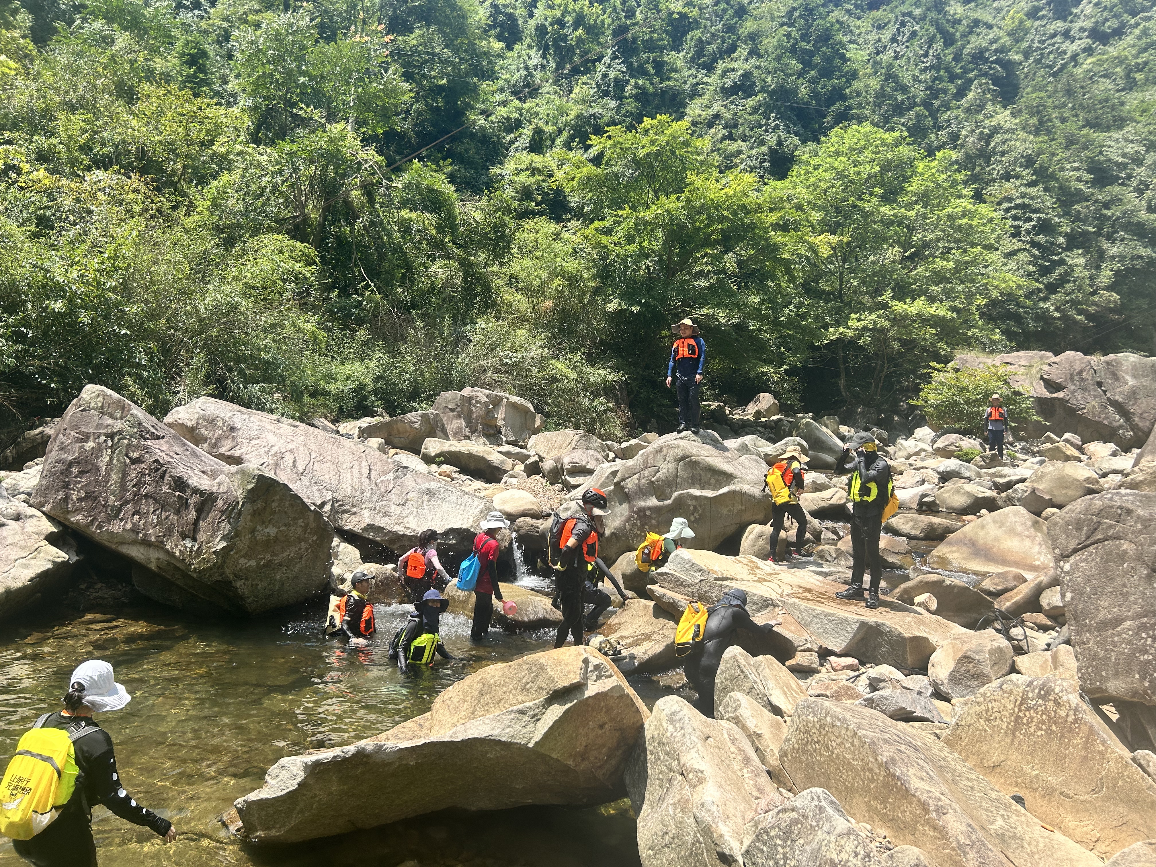 需要装备:溯溪鞋(徒步鞋、登山鞋)、速干长裤、长袖防晒衣、遮阳帽、溯溪包、换洗干衣服、防水袋、手套等