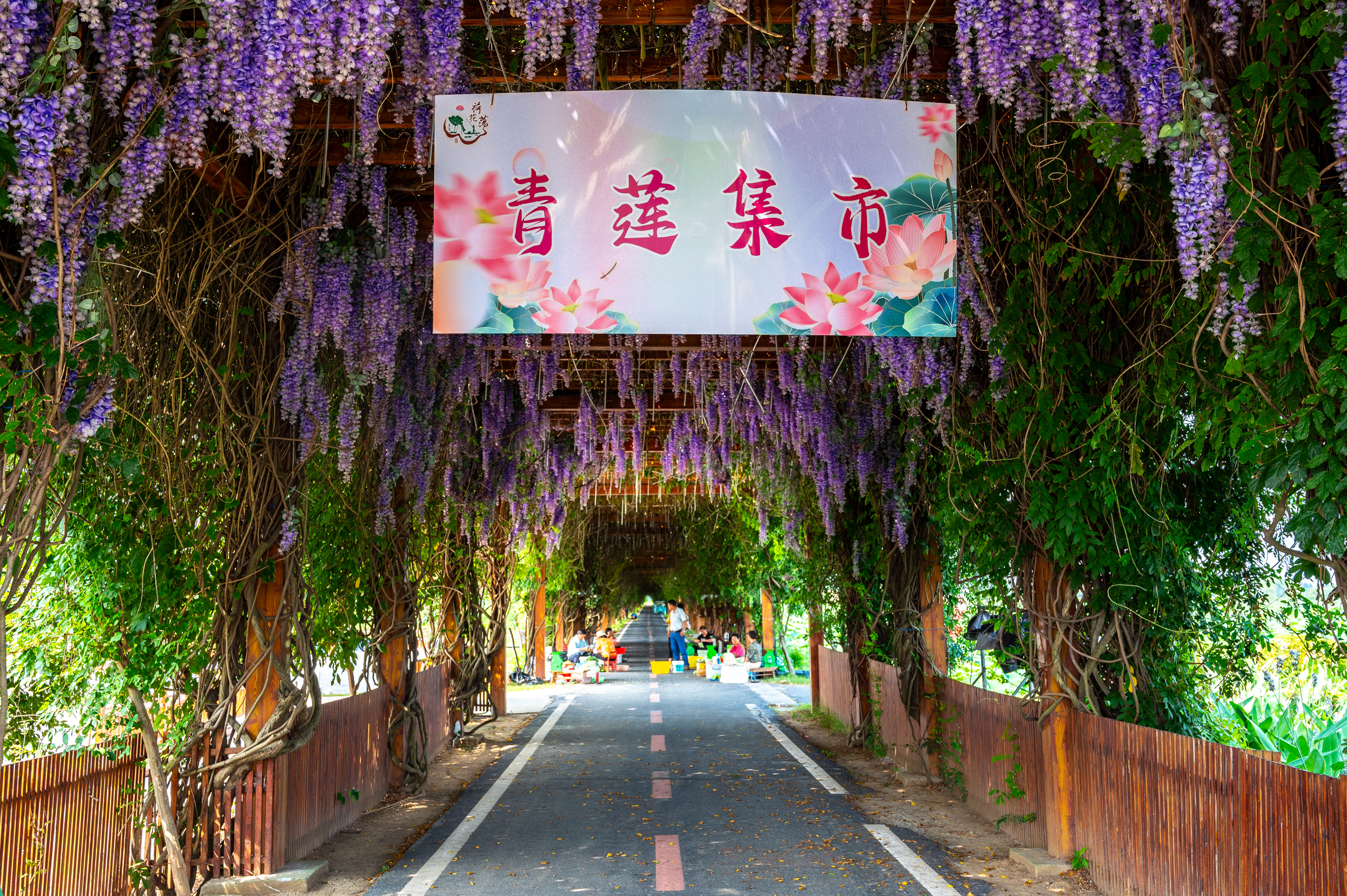荷花仙子广场两侧各有一条长达数百米的紫藤长廊,作为荷花荡主要的游览步道,紫藤长廊犹如一条精心编织的紫色绸带,轻轻环绕于碧水荷花之间,又似一条穿越时空的梦幻隧道,引领着每一位旅人步入一个远离尘嚣的仙境。步入其间,只见藤蔓缠绵,紫花如瀑,每一朵都似精心雕琢的紫色风铃,阳光透过密集的紫藤叶隙,洒下斑驳陆离的光影。
