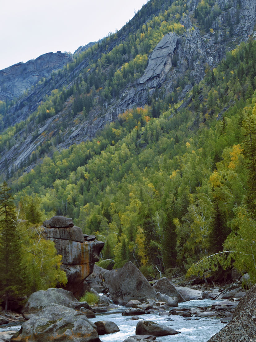 布尔津是喀纳斯整个环线游玩的交叉点,上山下山都要在这里停留。我们早上去五彩滩,确实不怎么出彩,因为日光还没有出来,然后风还很大,冻手。比起五彩的丹霞地貌,我觉得河对岸的古老崎岖的树林更有意思,再稍远的地方又是银色的沙漠。河边、树林、沙漠构成了一副博物馆开篇的远古时代的起源解说,特别的像!天空很大,云彩一丝一缕的,蔓延开来。