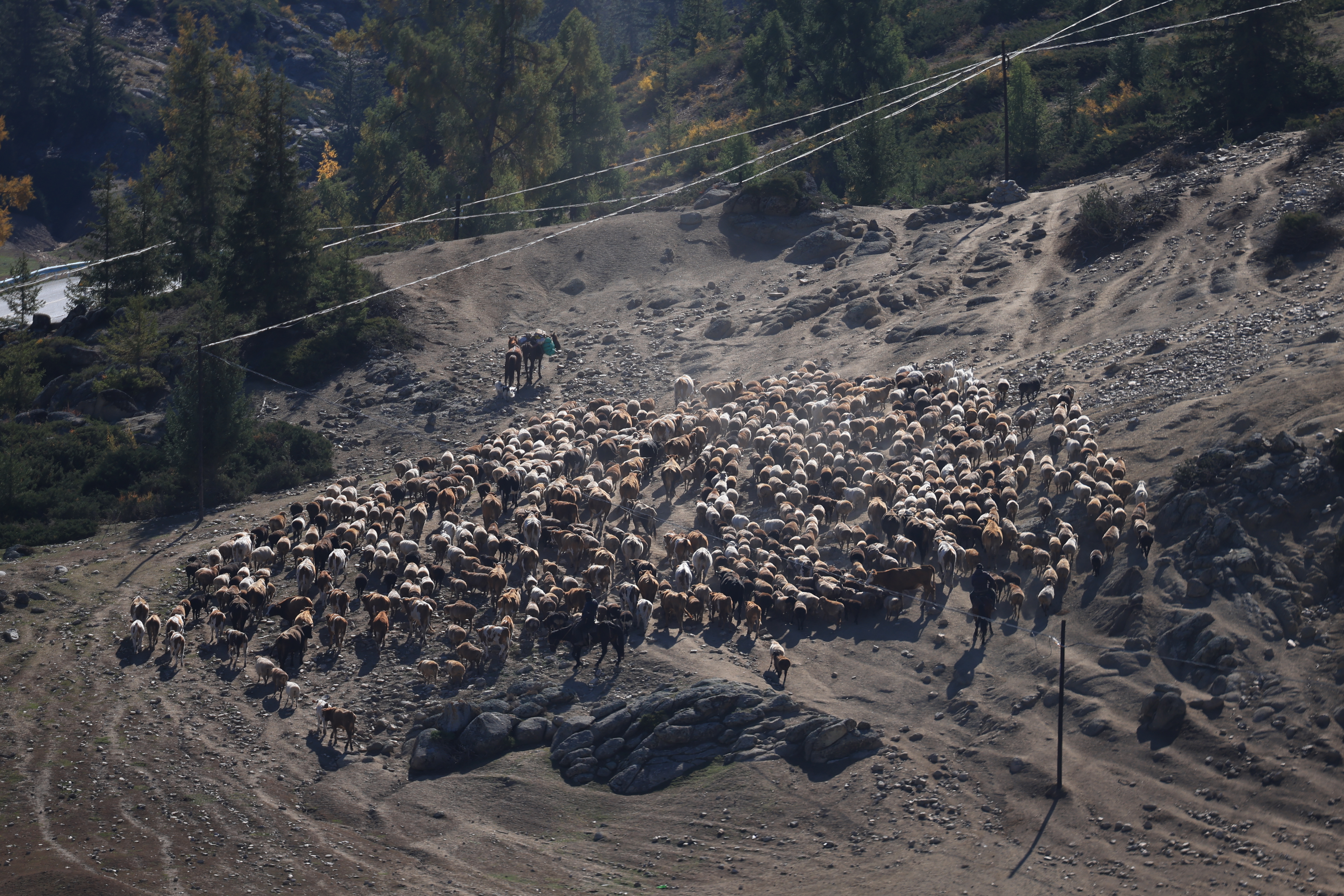 它是一个幽静美丽的小山村,阿尔泰山上密密麻麻的金黄的松树林一直延伸到白哈巴村里,远离尘嚣,一片寂静。