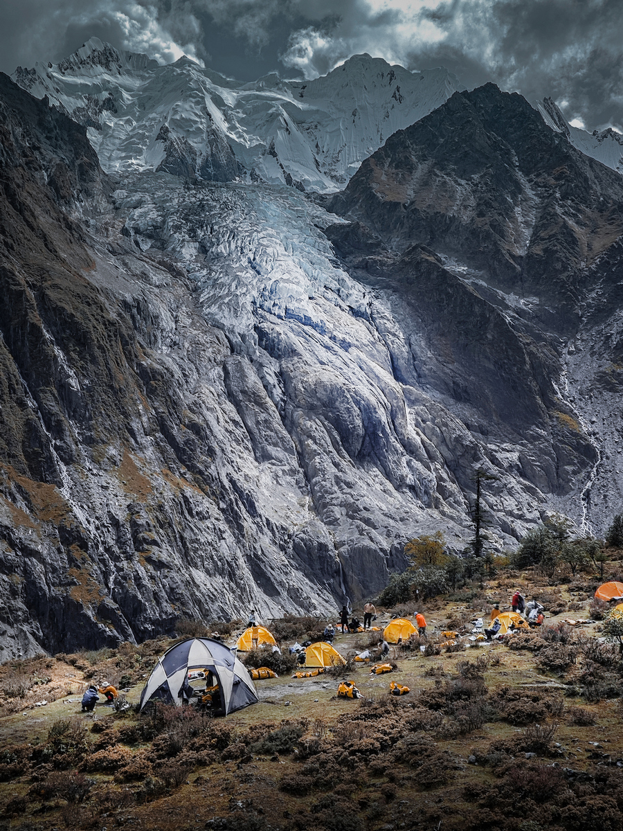这里,和奶日顶卡冰川最近的地方,完整欣赏到这条巨大冰舌,它看起来并不完美,充满着泥沙的污染,夏末,冰舌融化不少,裸露了大量嘿呦的山石,从均坡营地一路顺坡而上翻越次丁垭口,一路持续从下而上欣赏着全方位的冰川,这种超近距离,超大体量给你的巨大压迫感,同时也给了你无法拒绝的吸引力。