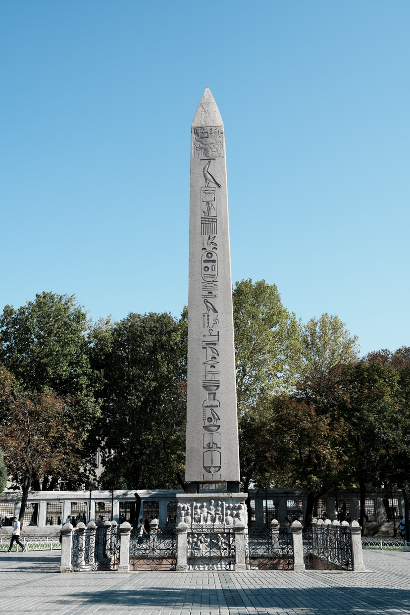 第一站是蓝色清真寺。门口的苏丹阿合麦特广场曾经是拜占庭帝国的竞技场(赛马场)。碑身刻有标志性象形文字的方尖碑来自古埃及,已有三千多年历史;另一座是本土罗马方尖碑,于公元十世纪君士坦丁七世建立。