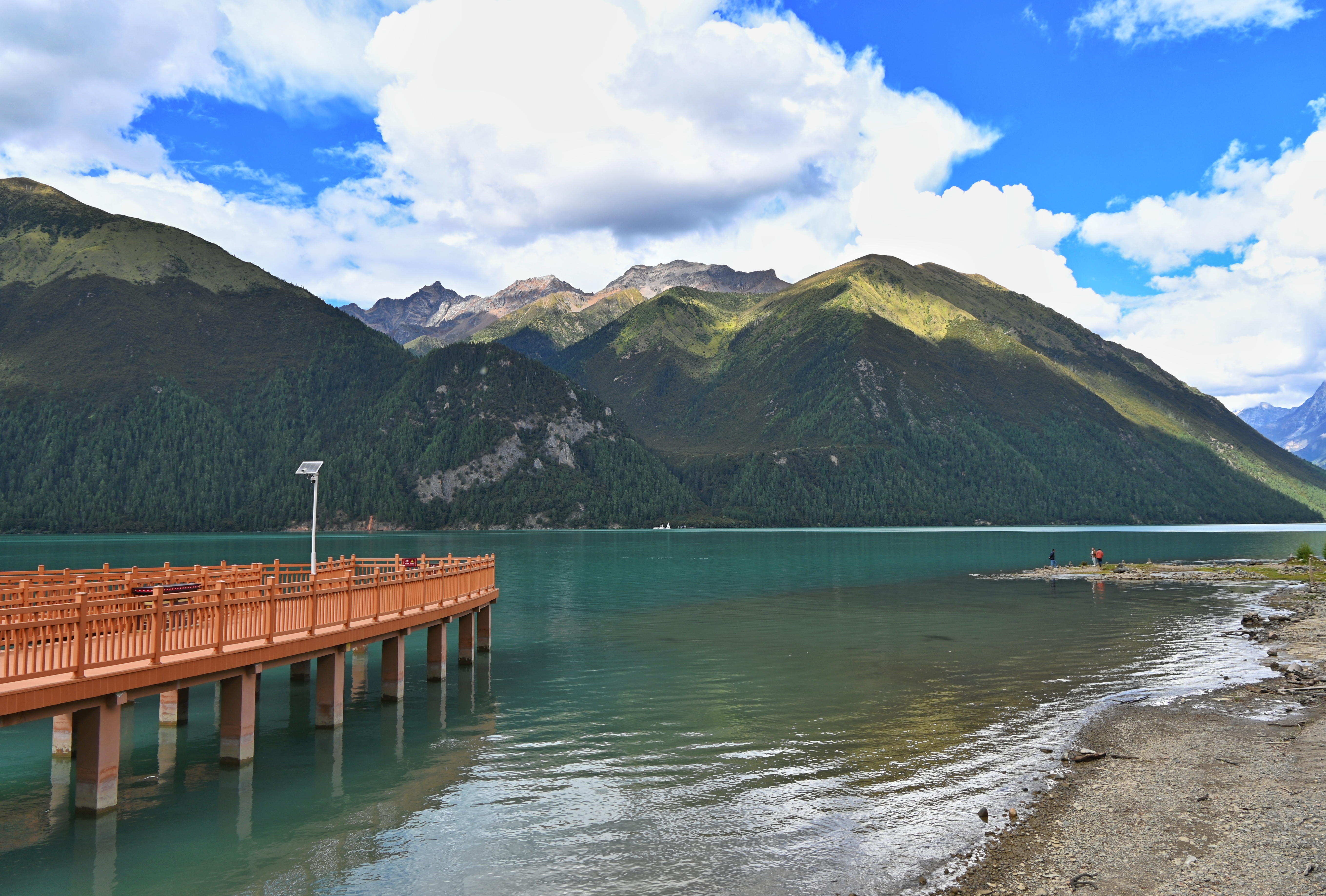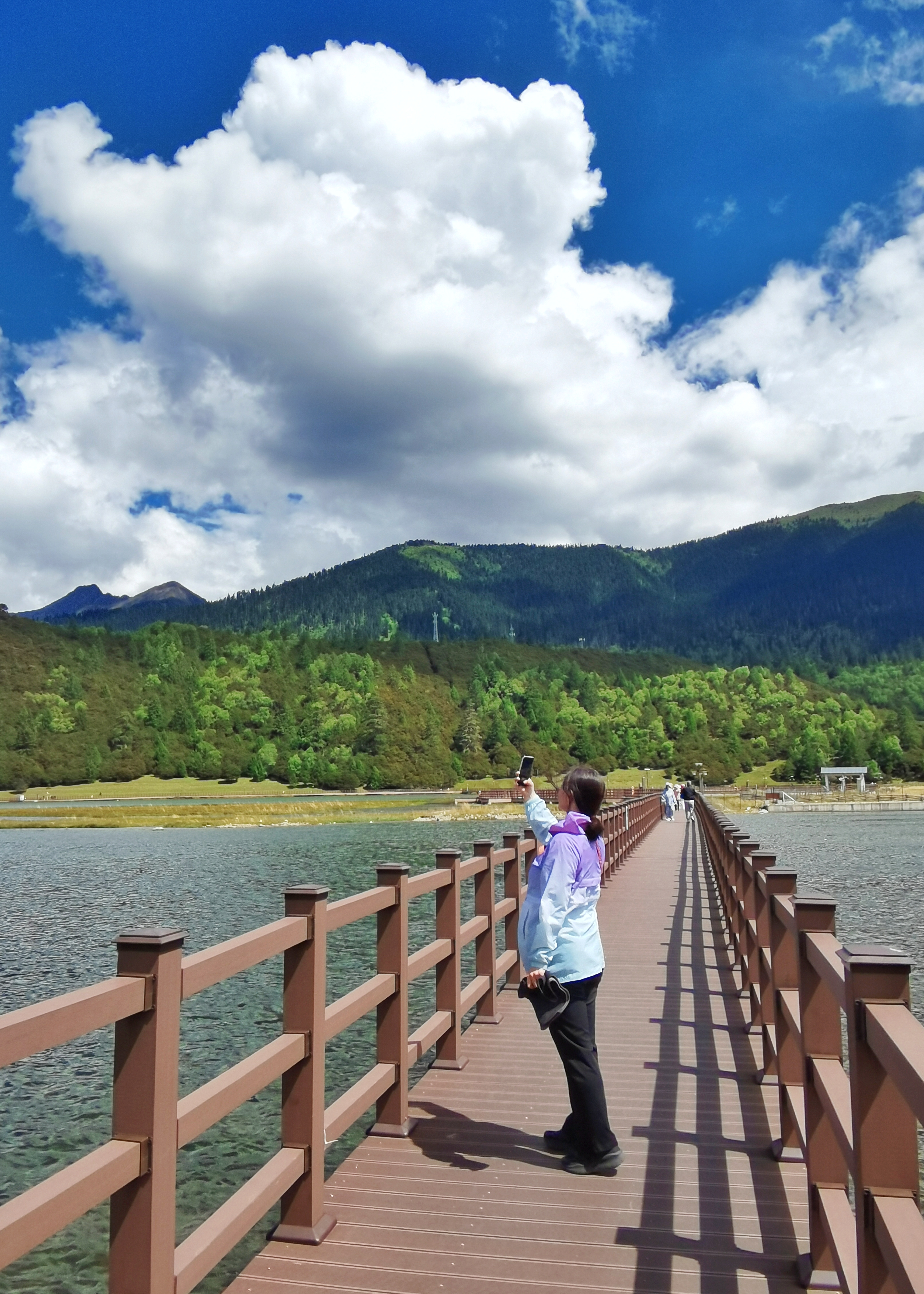 鲁朗小镇,是个充满着藏族风情的旅游小镇,紧挨着一个高山湖,湖边有一圈长达3.7公里的木质栈道。我们到达时还是阴天,中午在镇上吃完石锅鸡再出来天就放晴了,蓝天白云倒映在明镜般的湖中甚是好看。