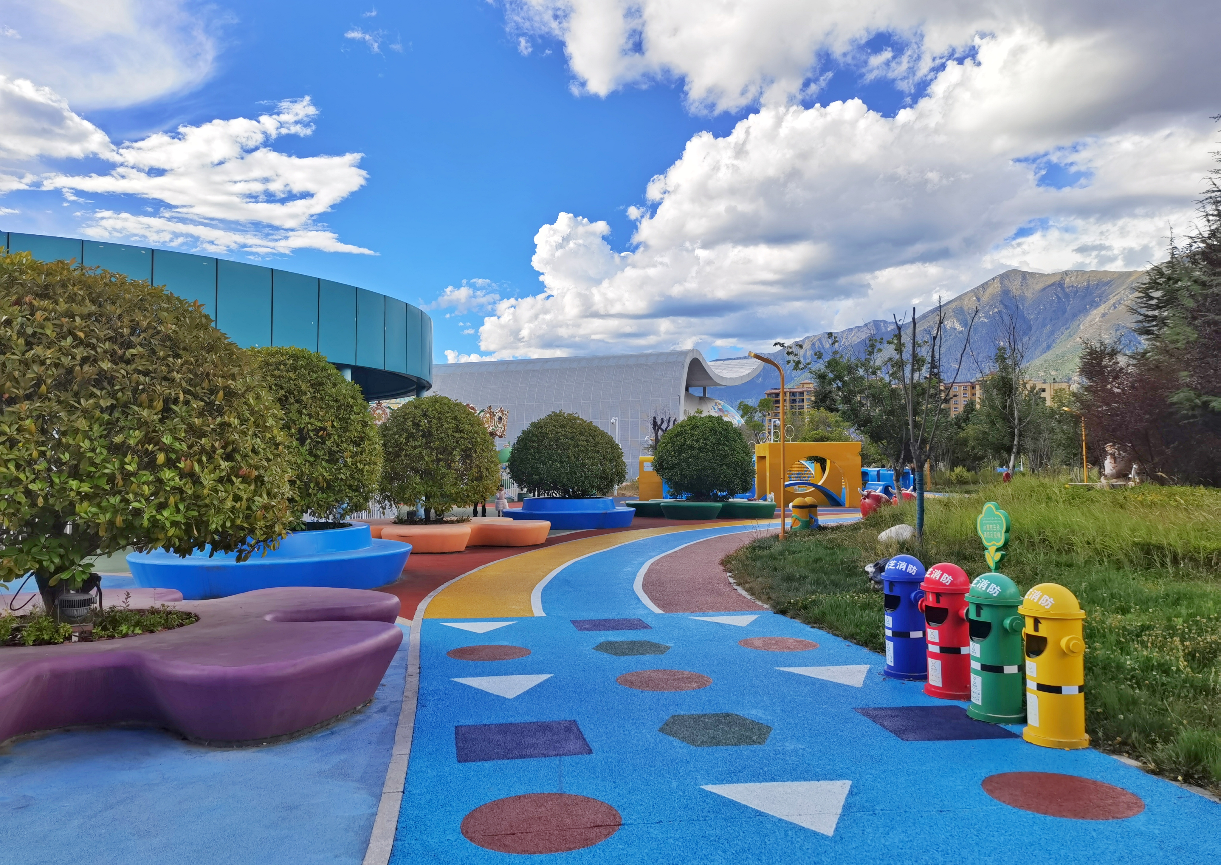 休息了一会儿继续出门遛弯,经过工布儿童公园,里面有几十项供小朋友玩耍的游乐设施和器具,如攀岩墙、旋转木马、儿童挖掘机、高空滑滑梯、多人秋千、儿童攀爬网、滑板场等。除个别项目收费外,其他绝大部分娱乐设施都是免费的。公园内的道路与设备都进行了无障碍设计,相接部分采用圆润处理,还安装了地垫,减少磕磕碰碰对小朋友的伤害。
