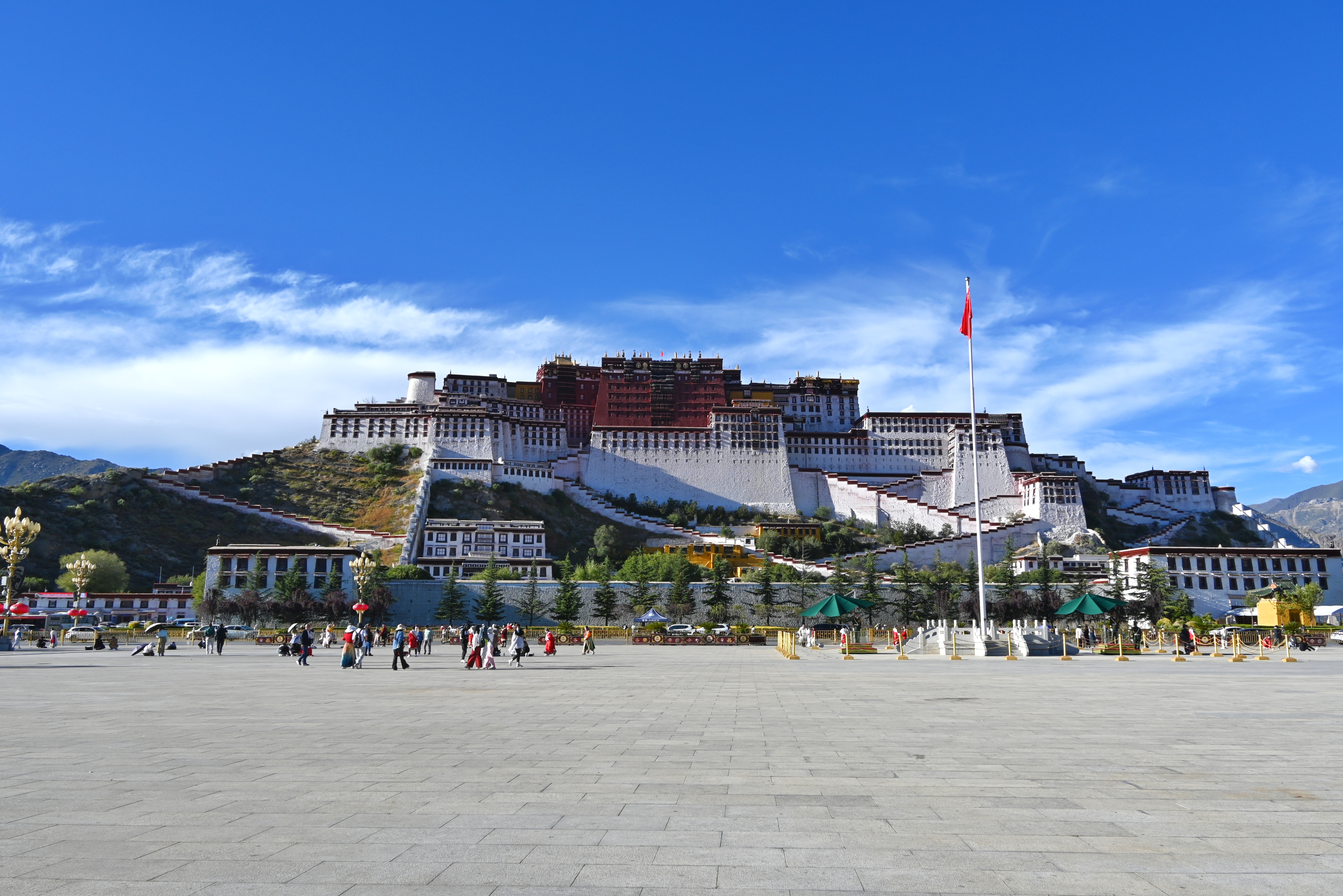布达拉宫广场,东西长六百米,南北宽四百米,道路广场总面积一点八万平方米,可容纳四万人举行大型集会活动。因为有太多人在广场上洒水拍布宫倒影,如今特意在广场的地面上安放了几面黑色镜子供游客拍照。