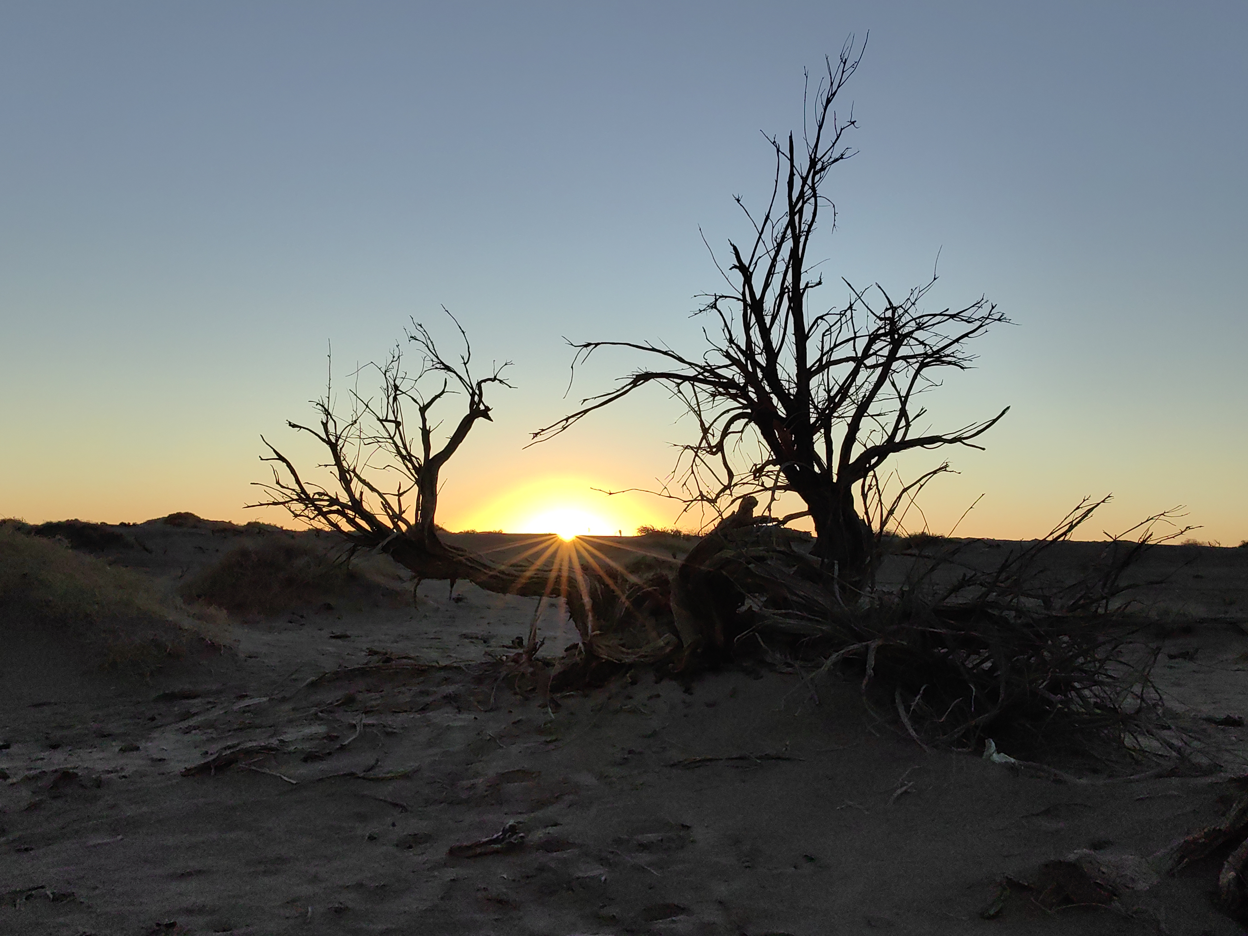 映入眼帘是漫漫的黄沙,由于胡杨死后不易腐,大片枯死的树仍矗立在戈壁上。一部分在岁月的侵蚀下拦腰折断,一部分被黄沙埋葬了大半躯干。