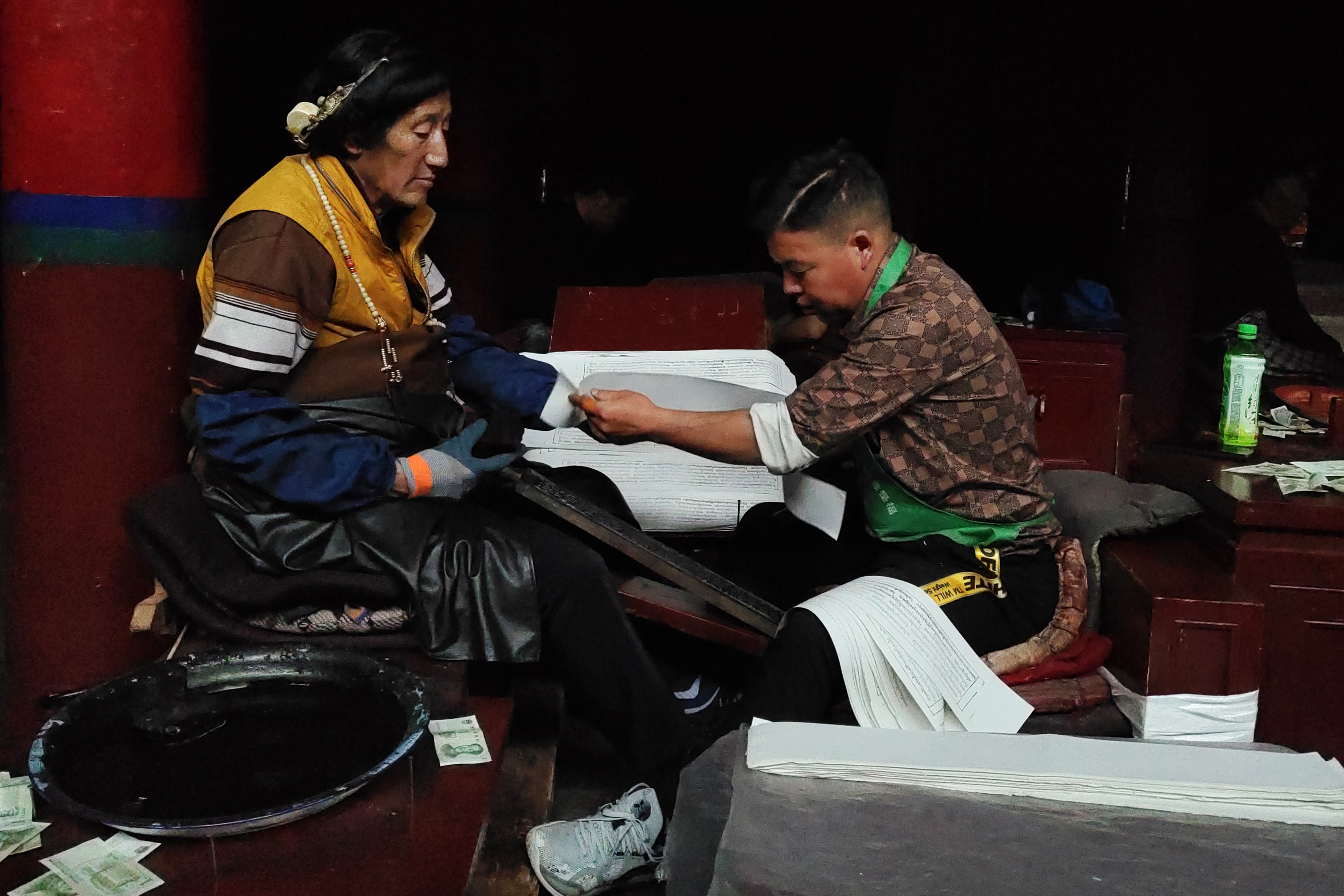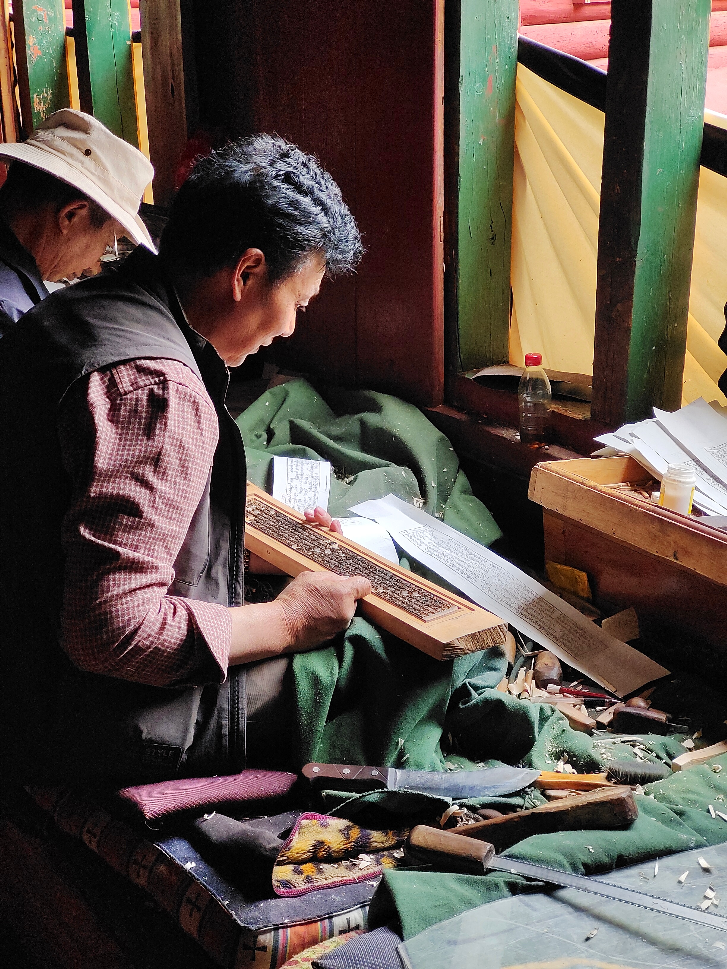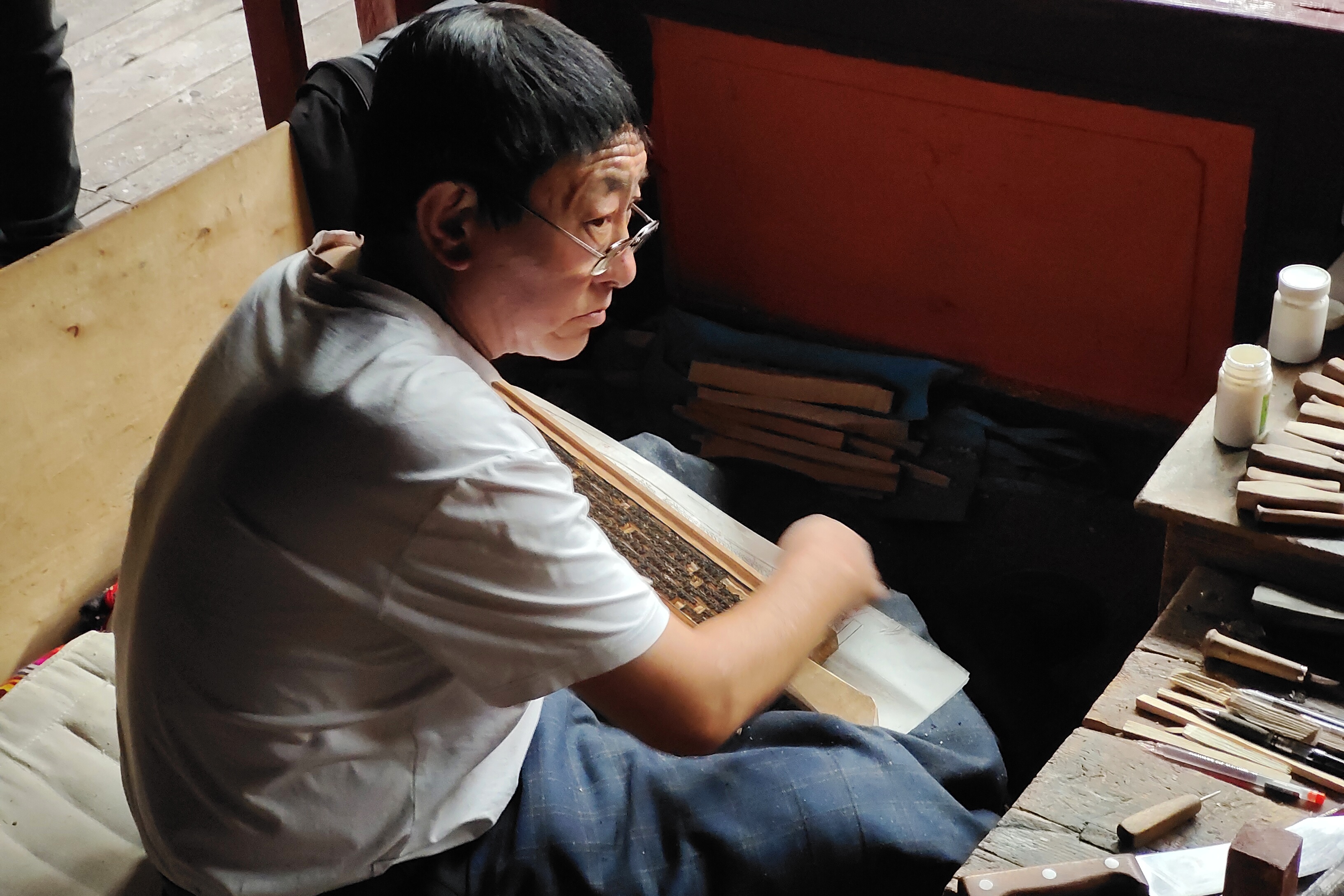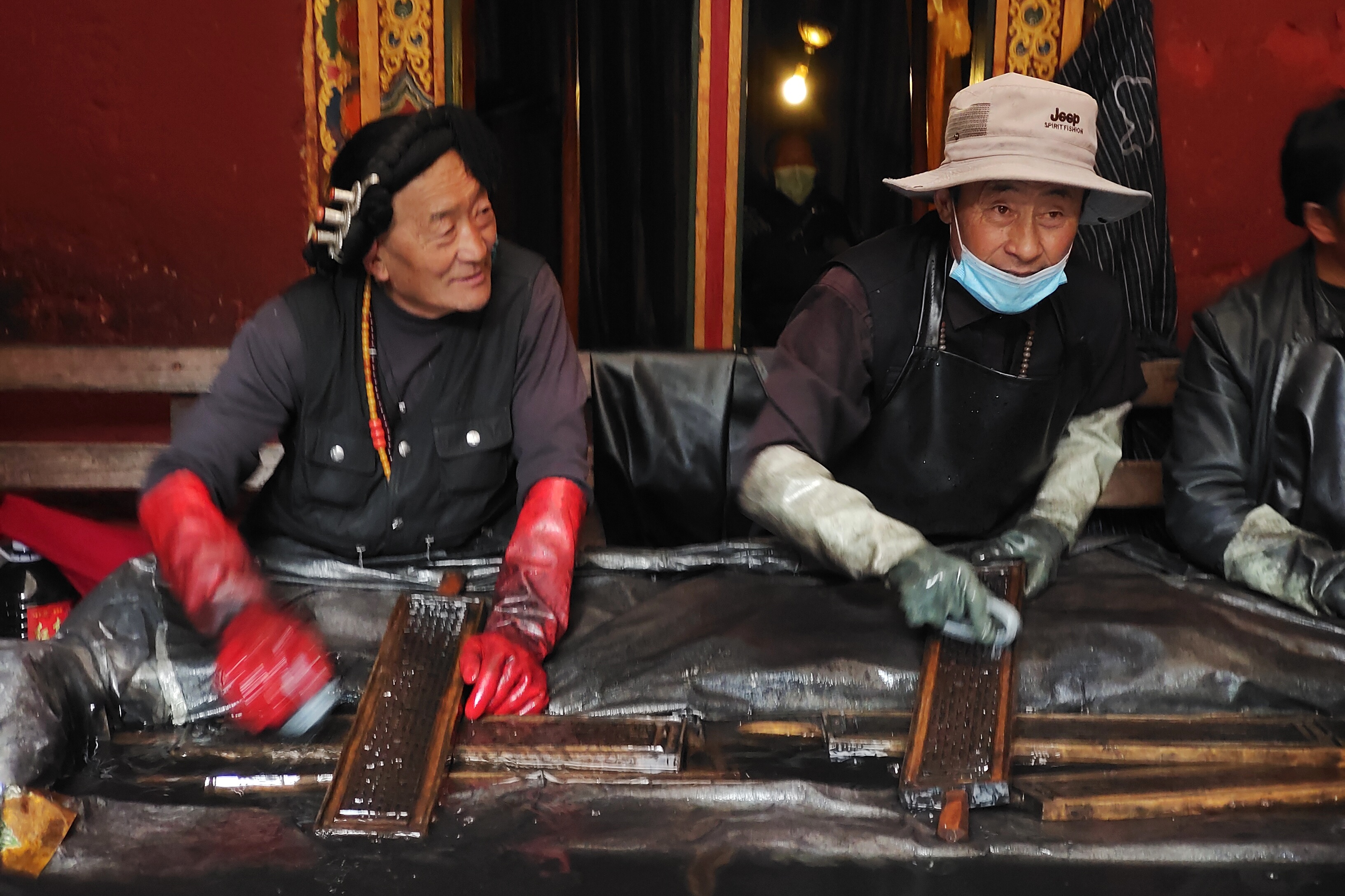 印经院的三层是工坊。此时刻板工匠正在认真地完成刻板,他们不仅技法娴熟,而且都有较好的藏文和绘画基础。印刷的工匠一高一矮相对而坐,印版就放置在两人之间的斜板上。高坐的人负责接纸并准确固定印版与印纸之间的拓面,以及在印版上滚墨。矮坐的人则一边递纸,一边持卷布干滚筒,自上而下双手推过,迅速扬起已印的书页放置一旁,如此周而复始。
