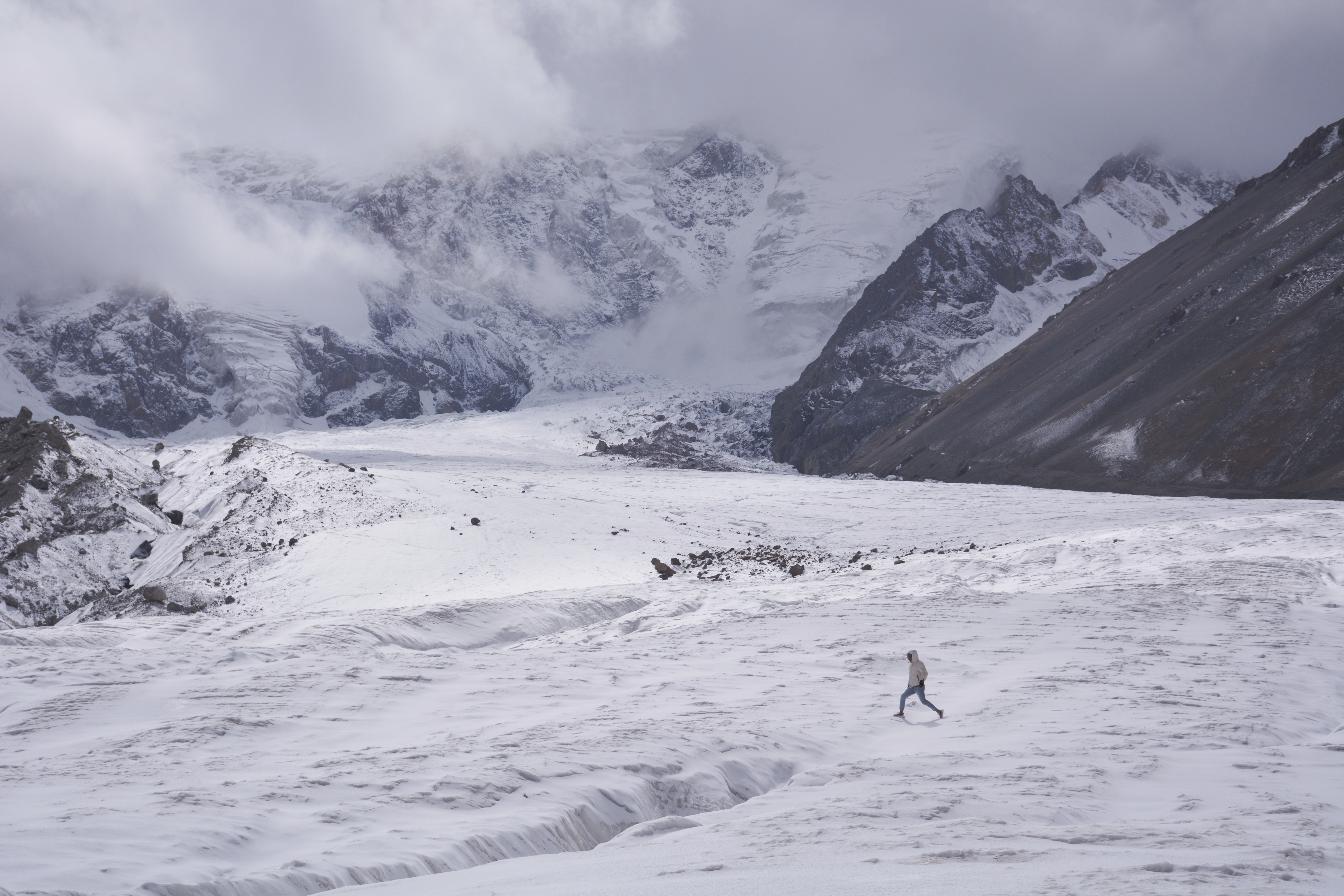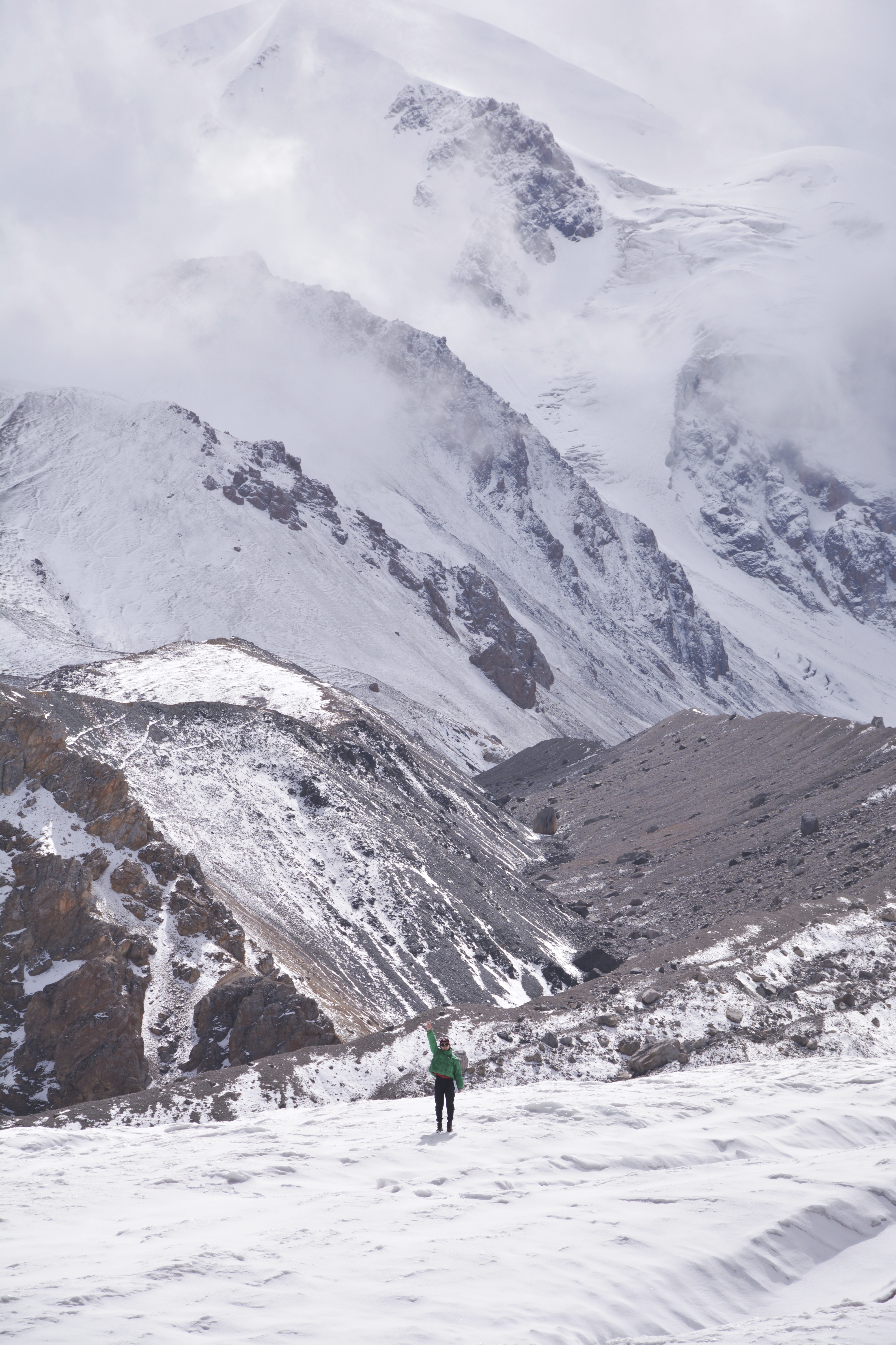 起初我们在拜山台并未完全看见阿尼玛卿山,因为大雾的原因,山势若隐若现。然而,神山脚下的一条壮美冰川还是吸引了我们的注意力。于是,我们决定前往冰川上一探究竟。
