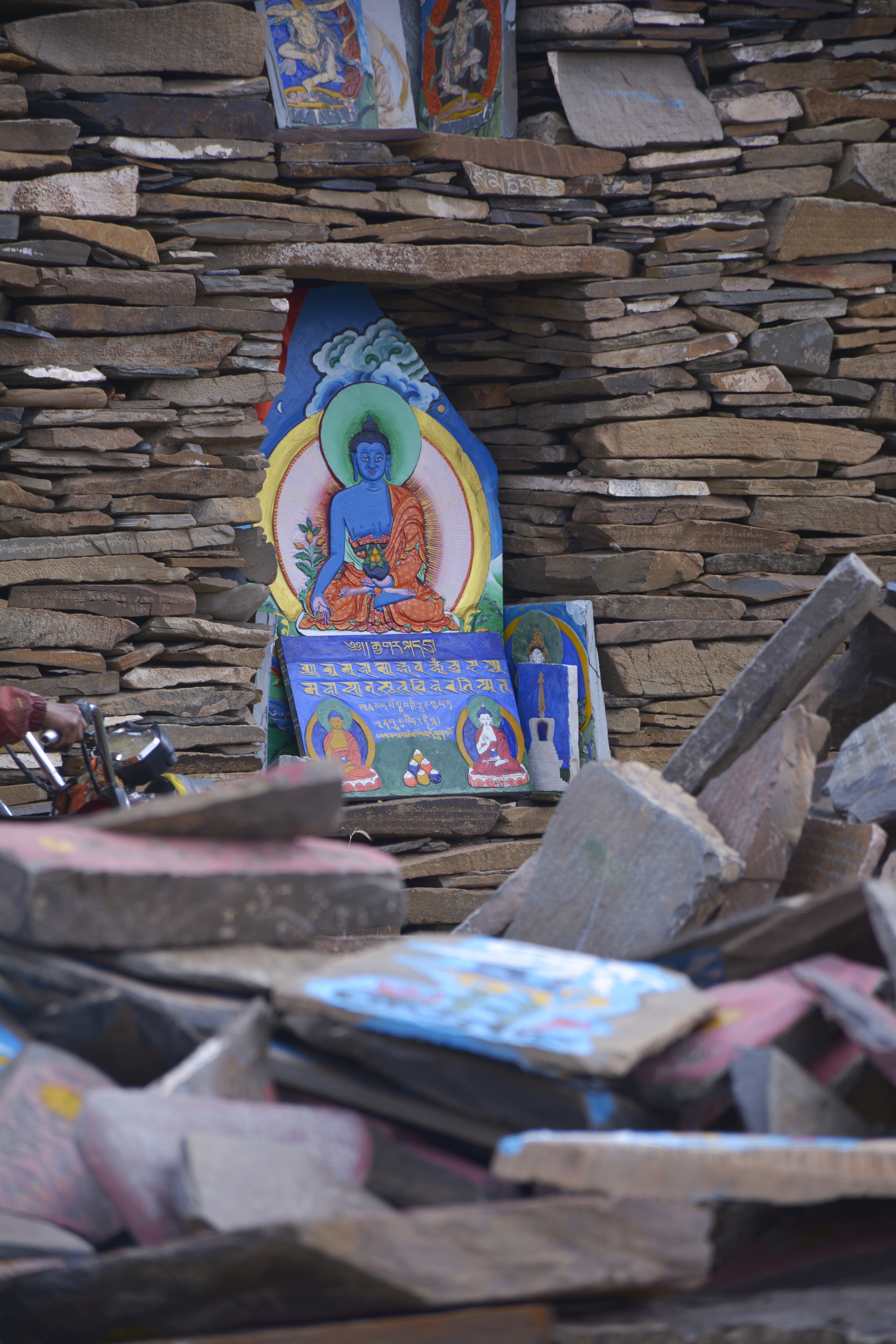 城墙上摆放着诸神像的“窗口”,正面有一道“城门”可以进入。四周密密麻麻都是刻满经文的玛尼石。