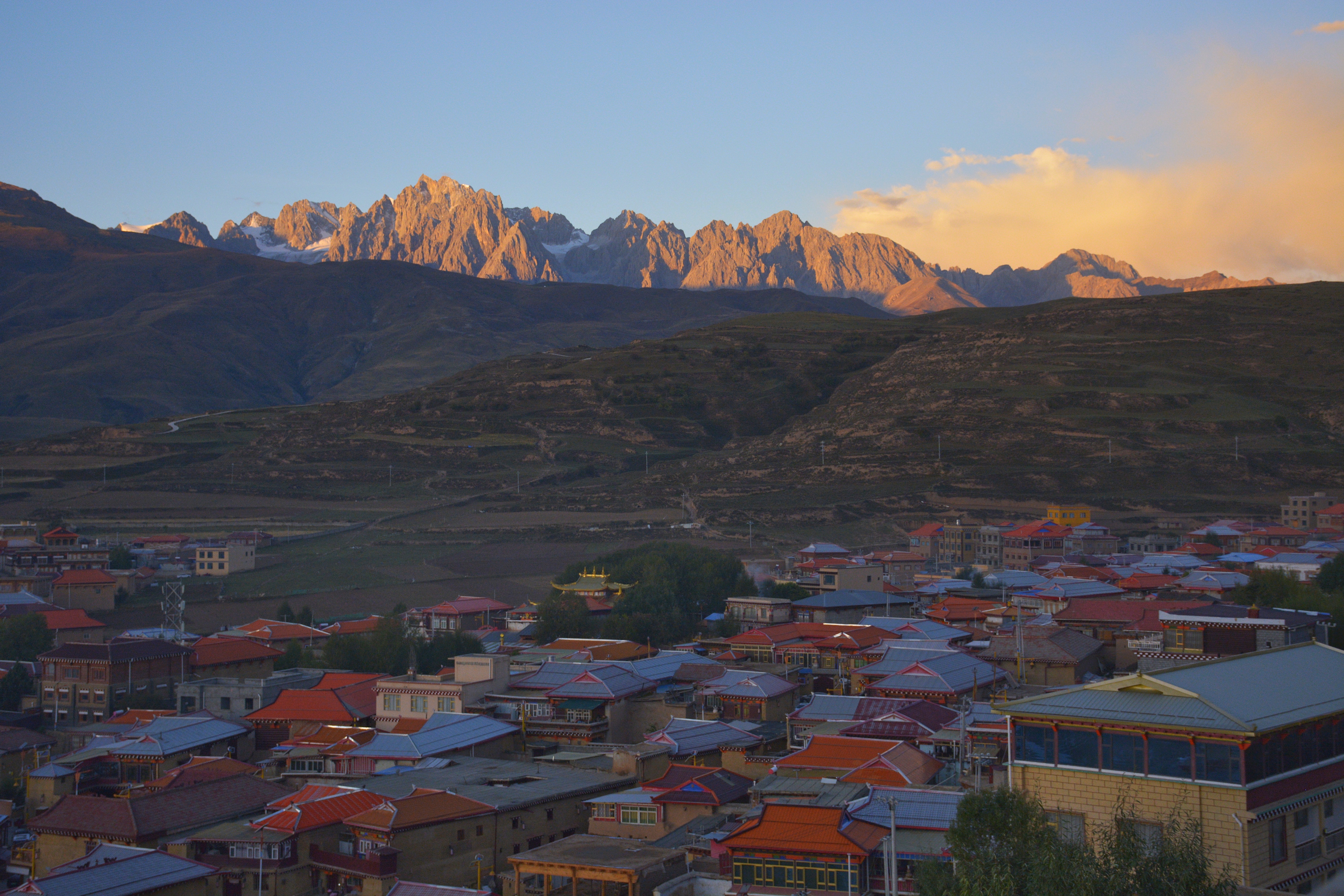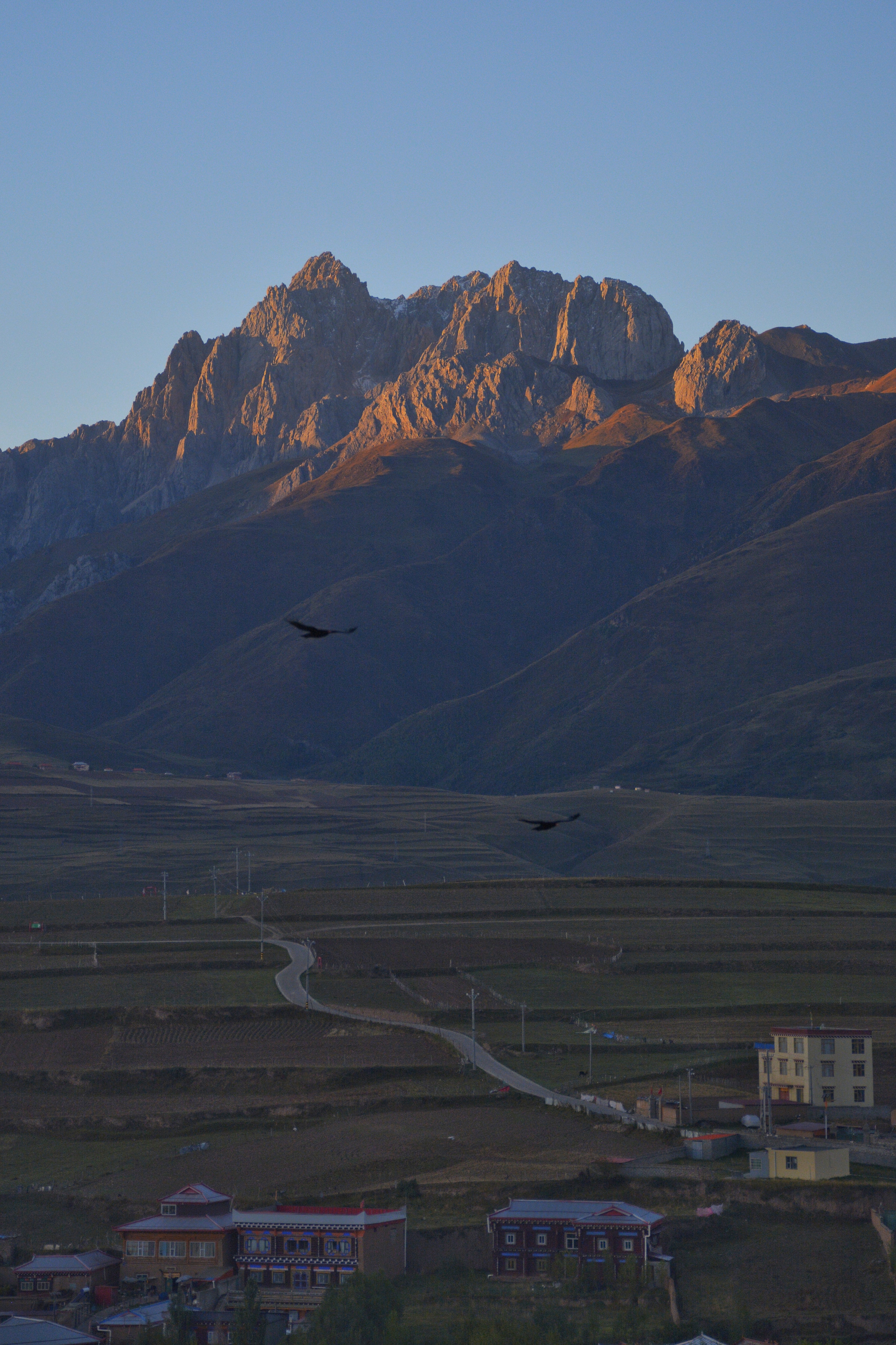 甘孜寺外有一处平台大坝,见状我们便在此提前架好了三脚架,以便等待和拍摄日出。随着时间一分一秒的流逝,只见远处的天边已有了一丝金黄。渐渐地,太阳从东边缓缓升起,爬上山头,整个甘孜县顿时被金色的暖阳所打亮,静谧又美好。此时,远处的卡瓦洛日雪山被光影照亮,逐渐呈现出金色,无比震撼。