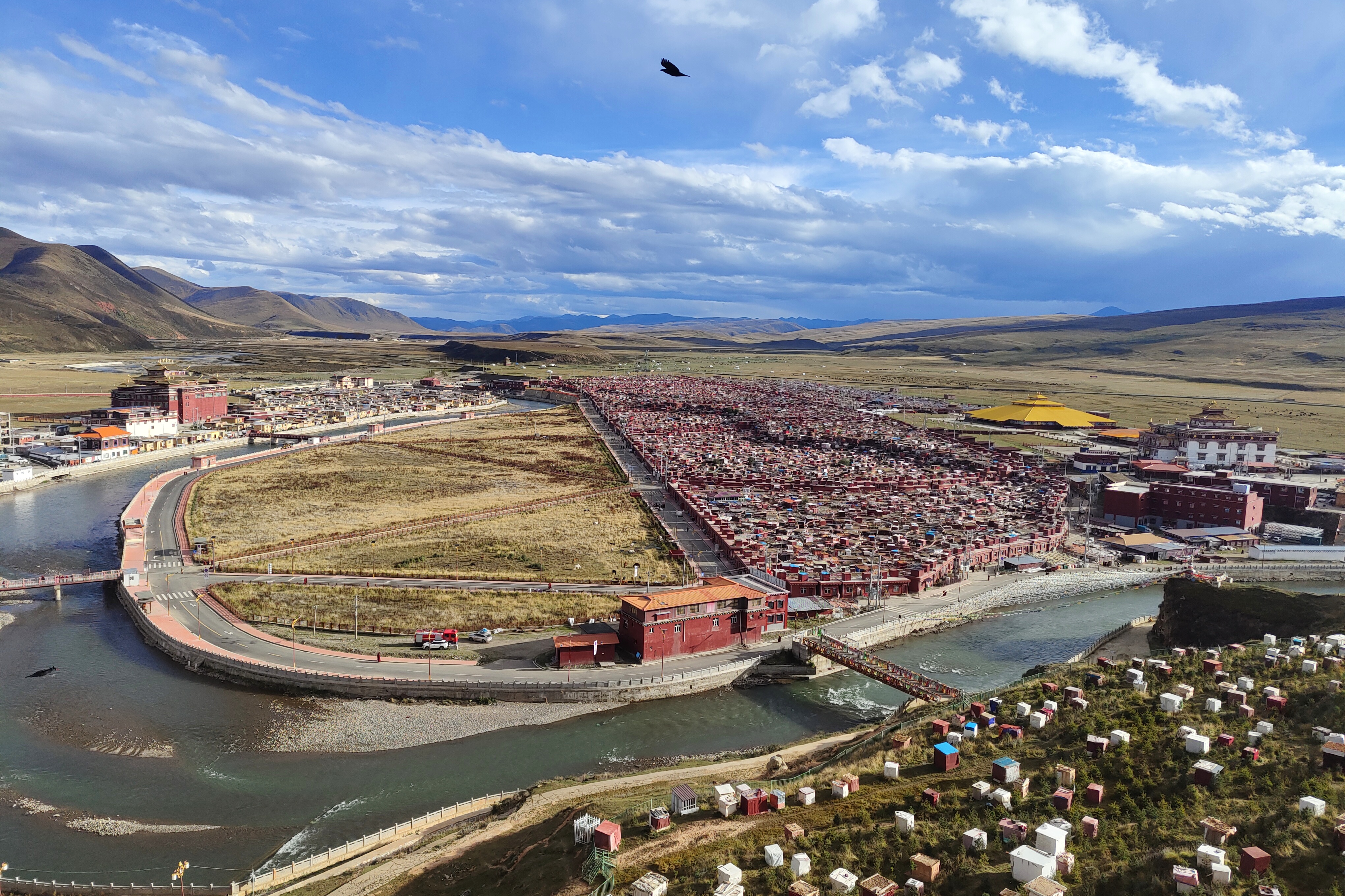 登上山顶,便能俯看亚青寺的觉姆修行区。它们由成千上万的红色小屋组成,鳞次栉比,蔚为壮观。以达观之心,敬仰山河之色。这便是亚青寺带给我们的震撼之感。