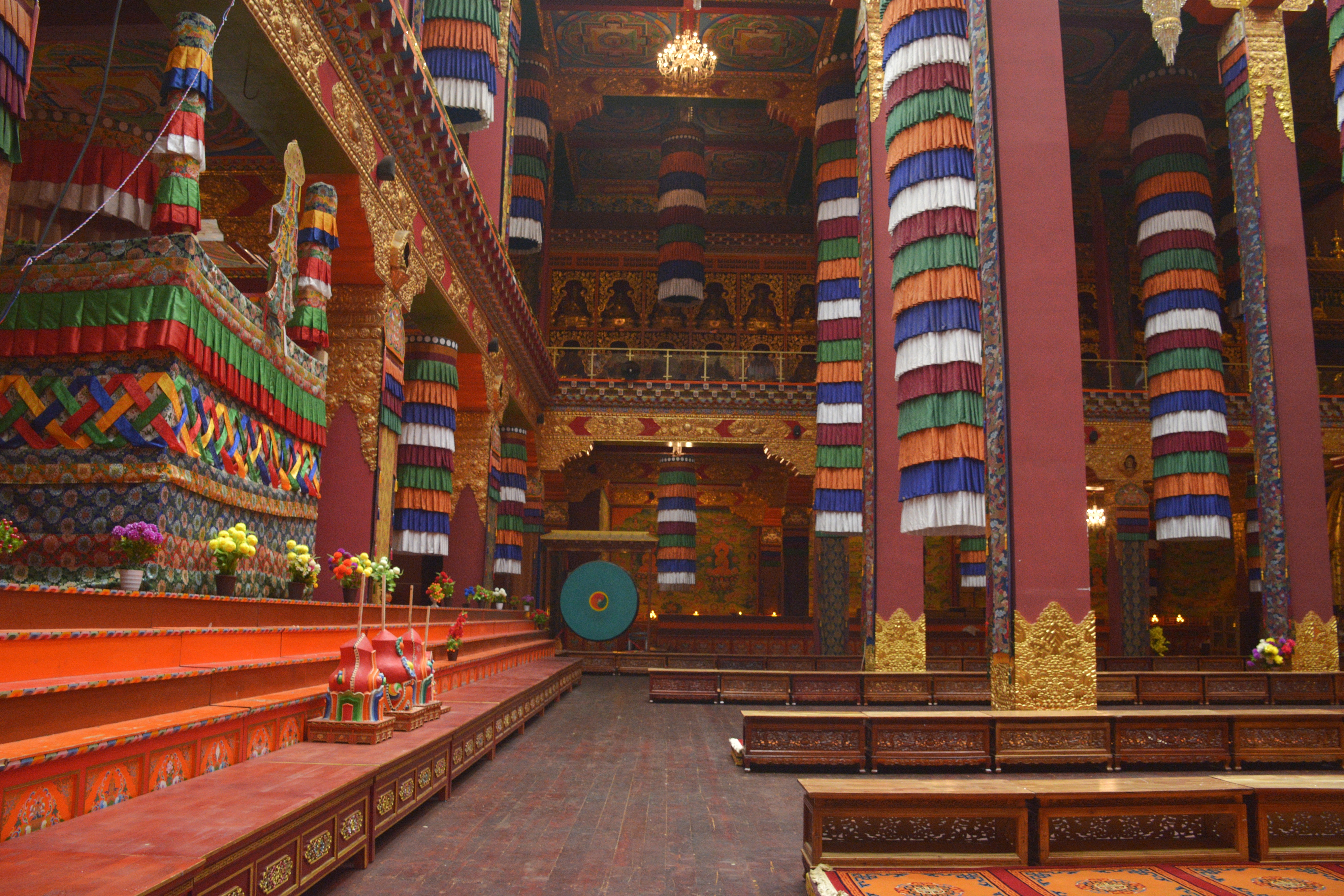 再往前走,是占地600多平方米的大金殿,据说可同时容纳两千名僧侣诵经习法。走进殿内,供奉有各种密宗本尊佛像,庄严殊胜。