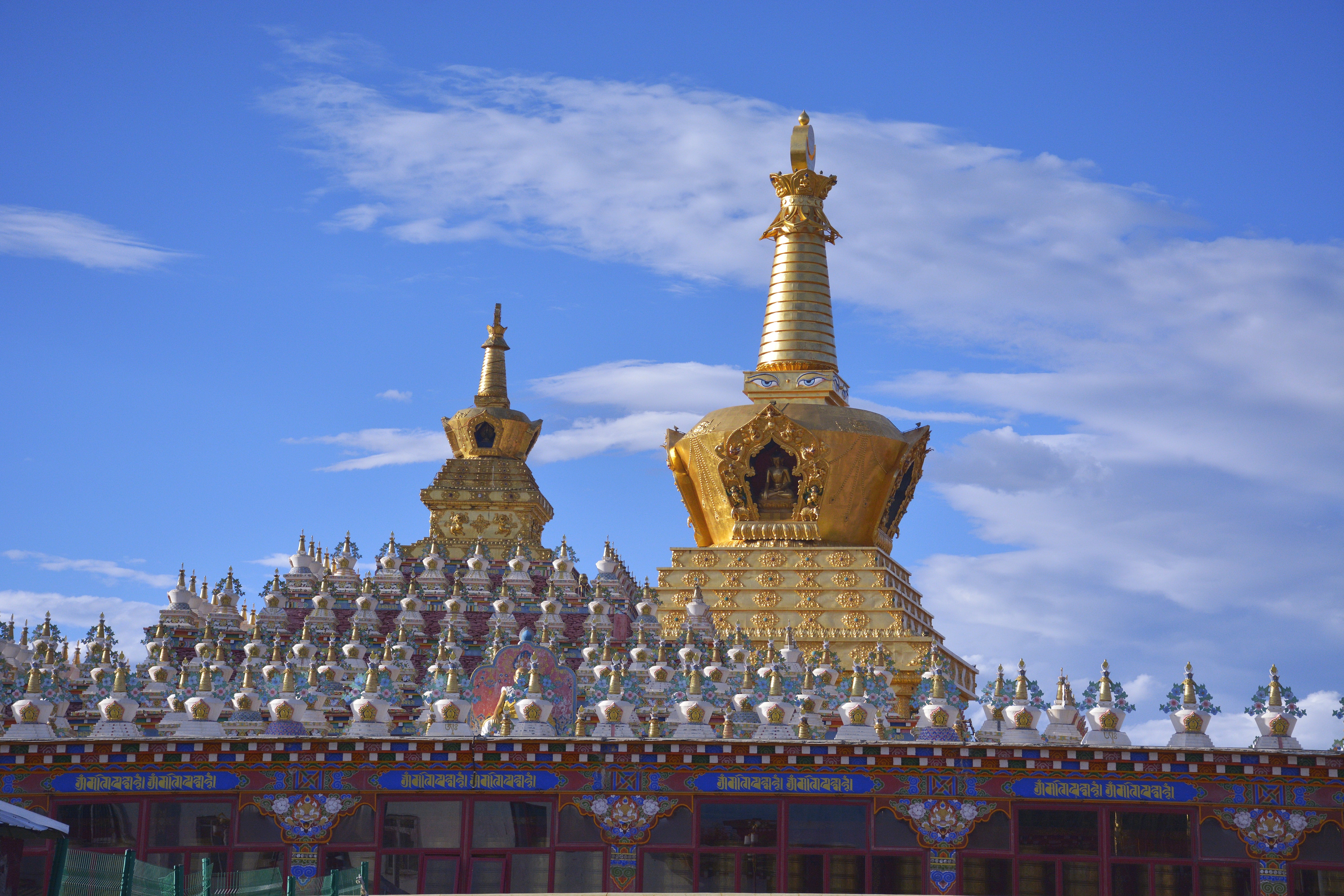 走进长青春科尔寺,只见这里殿堂林立,气势恢宏。寺院多为藏式土木结构建筑,寺墙维护四周。白墙红瓦,鎏金屋顶,壁画佛像,塔门经书,无不彰显出此地的神圣与庄严。